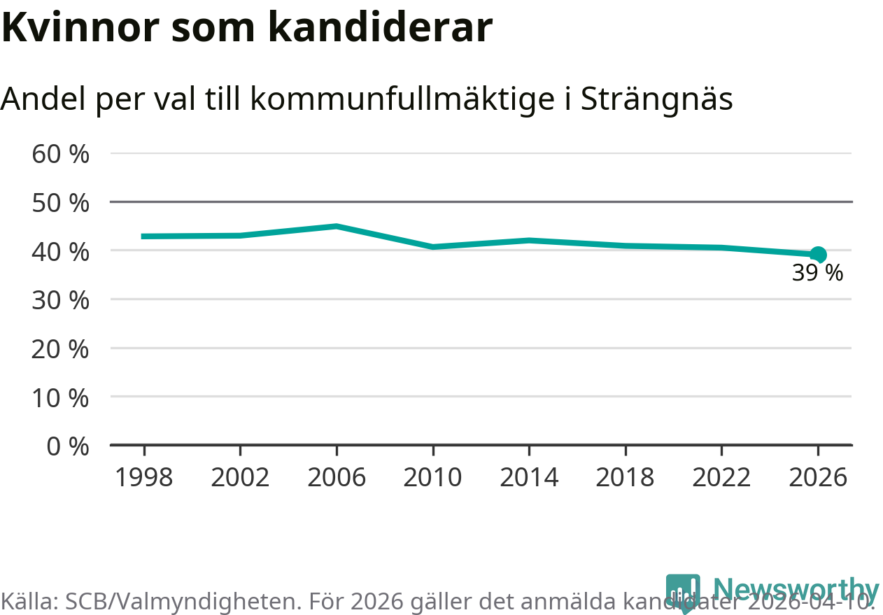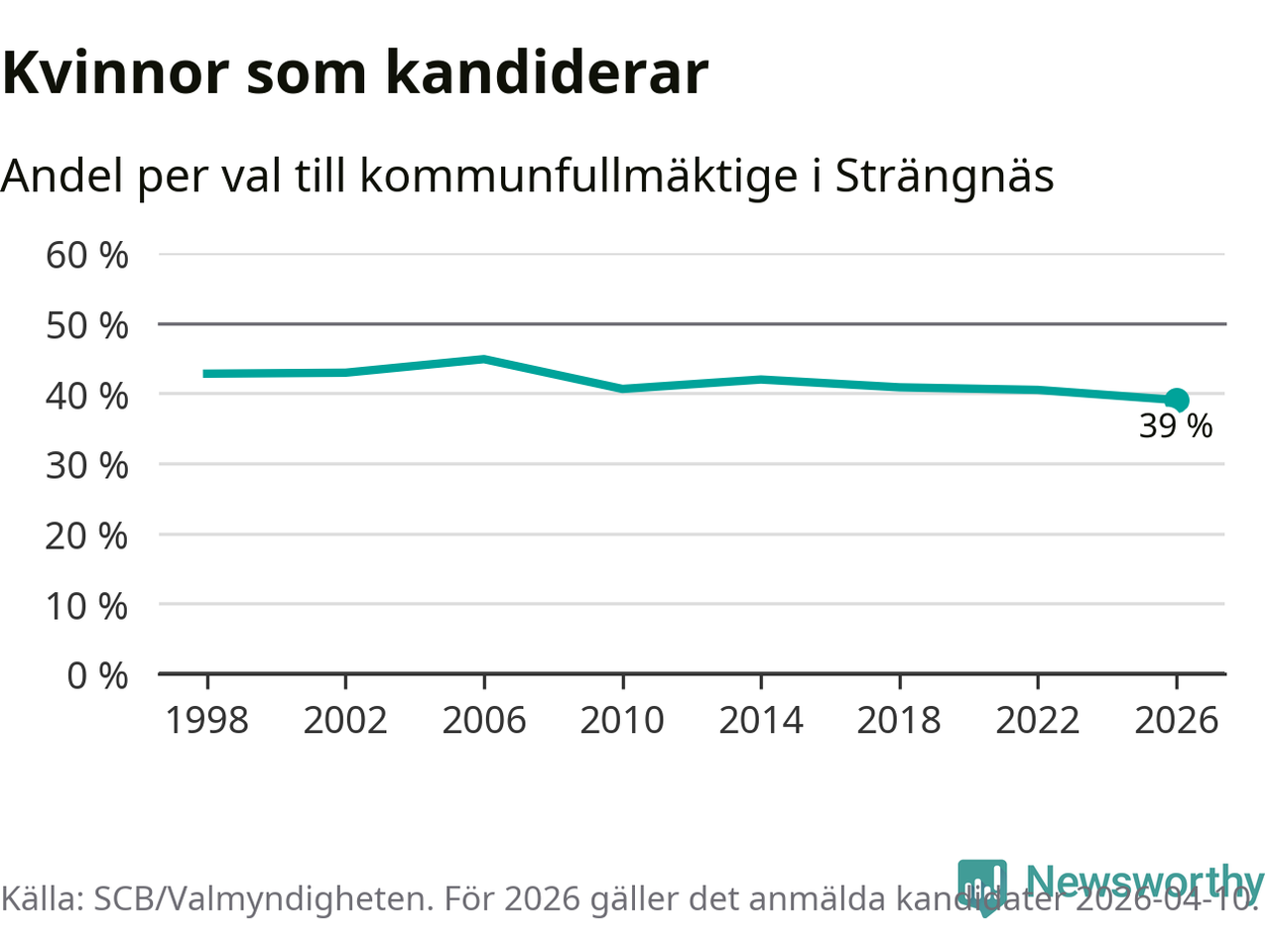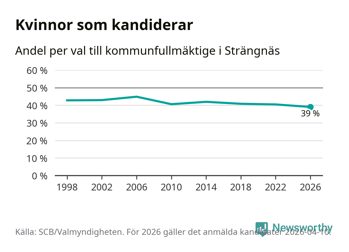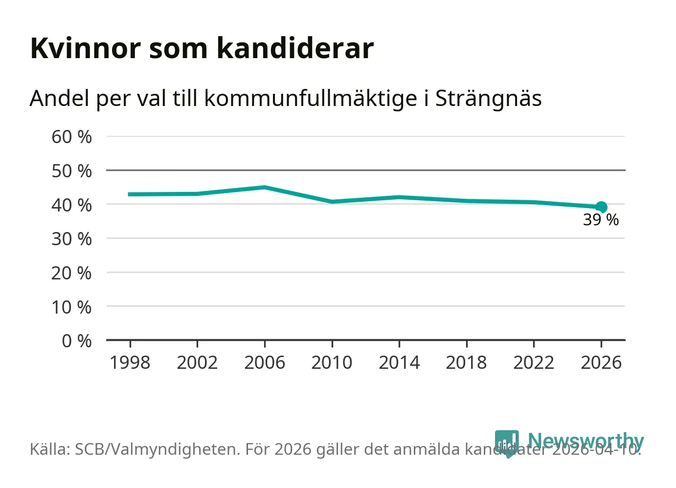 Kvinnorna utgör 39 procent av de hittills anmälda kandidaterna, vilket är den lägsta andelen på listorna till kommunfullmäktige i Strängnäs sedan åtminstone valet 1998. Andelen kvinnor har minskat i Strängnäs under de senaste två valen och minskningen ser alltså ut att forsätta i år. Strängnäs är en av 264 kommuner i landet där männen utgör en majoritet av kandidaterna på listorna.