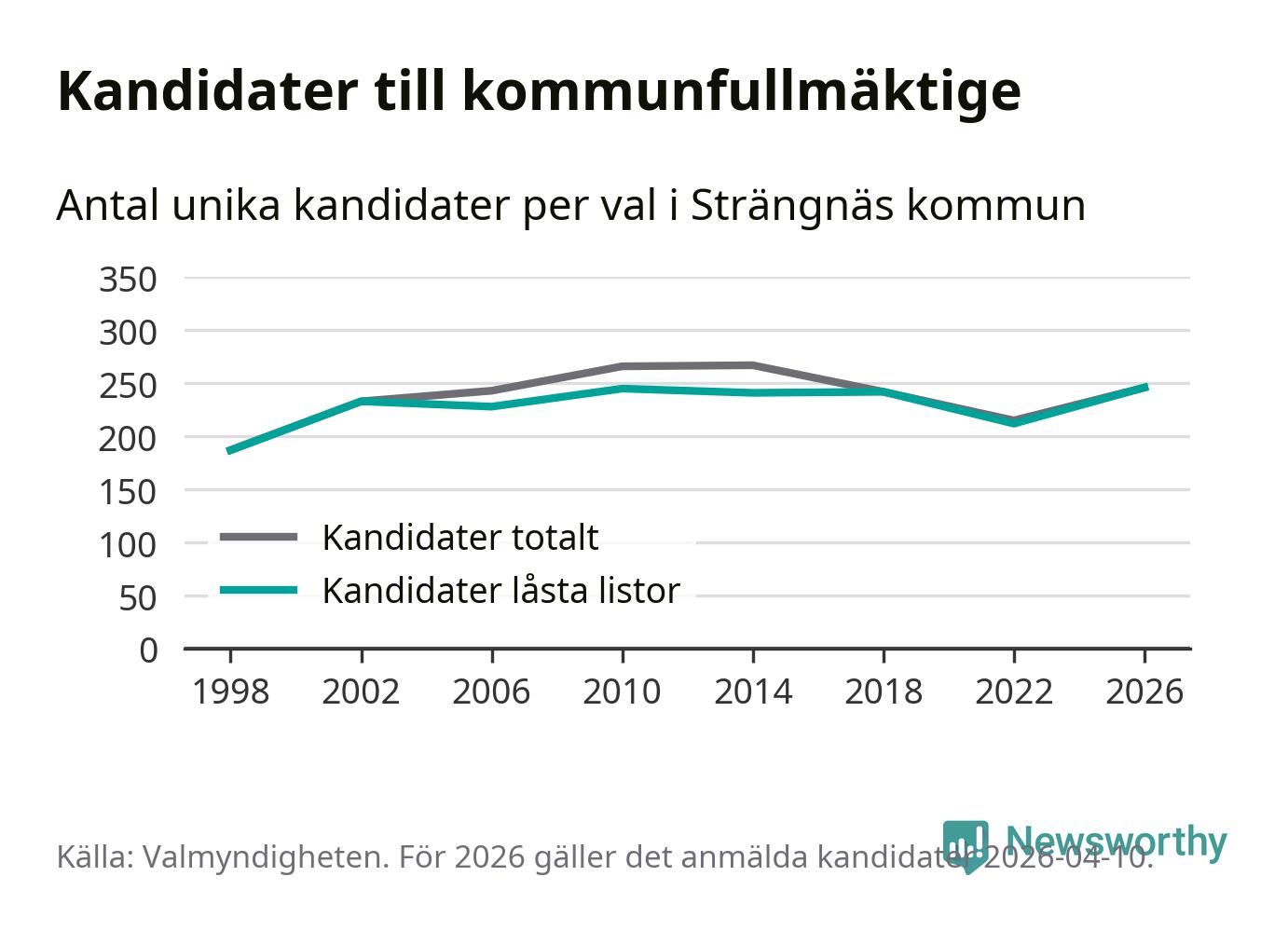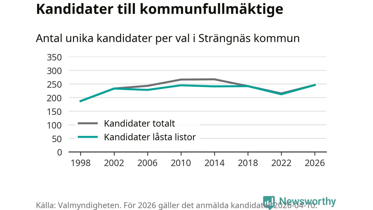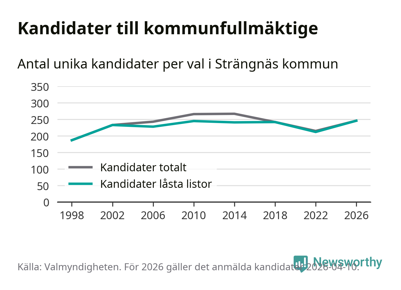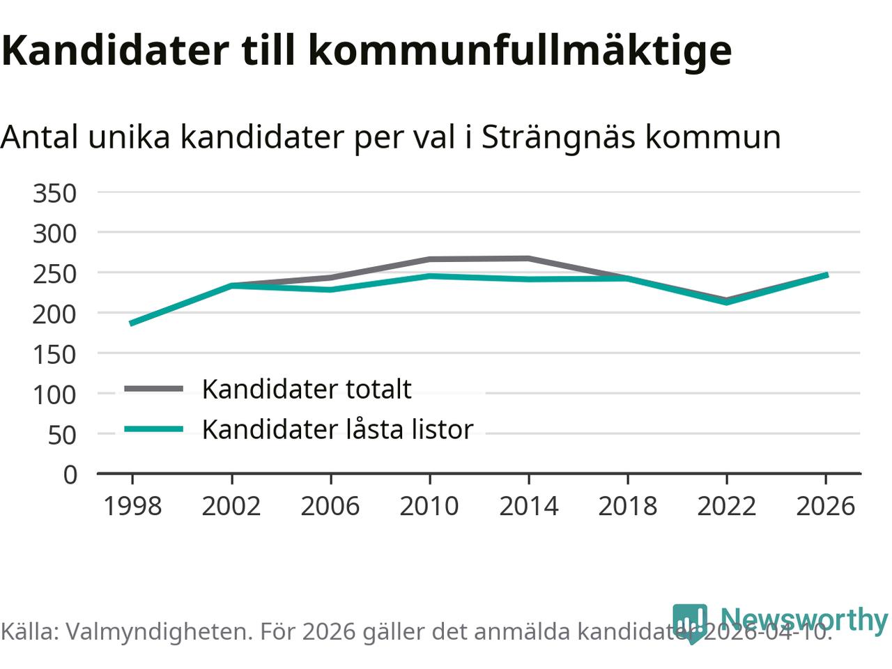 På torsdagen var det deadline för partier med låsta listor att registrera sina kandidater inför höstens val. Till valet till kommunfullmäktige i Strängnäs är 246 kandidater anmälda på sådana listor, vilket är 34 fler än i valet 2022. Det är den högsta siffran sedan åtminstone valet 1998, vilket är så långt tillbaka som vi har statistik för.