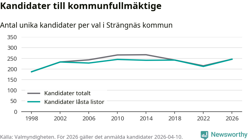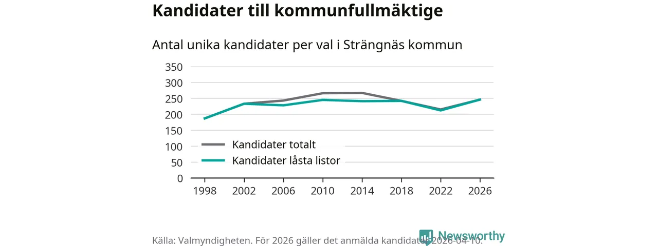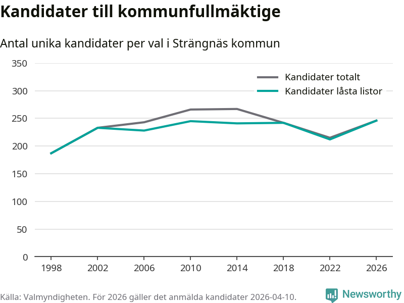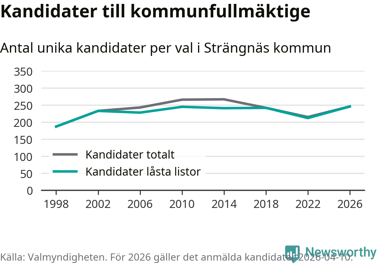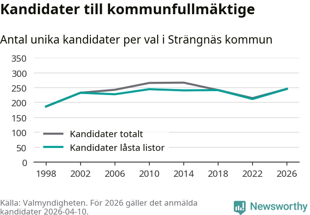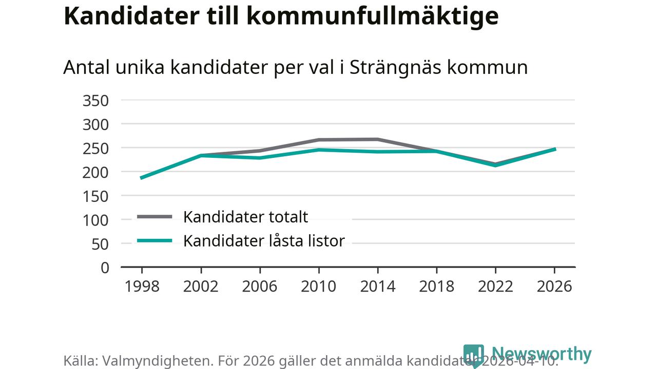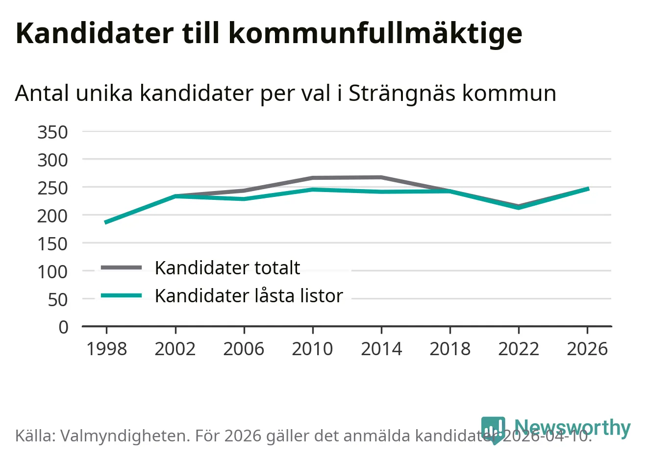 På torsdagen var det deadline för partier med låsta listor att registrera sina kandidater inför höstens val. Till valet till kommunfullmäktige i Strängnäs är 246 kandidater anmälda på sådana listor, vilket är 34 fler än i valet 2022. Det är den högsta siffran sedan åtminstone valet 1998, vilket är så långt tillbaka som vi har statistik för.