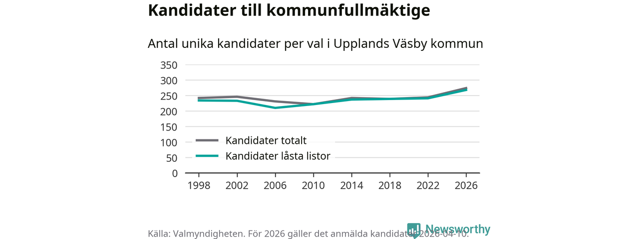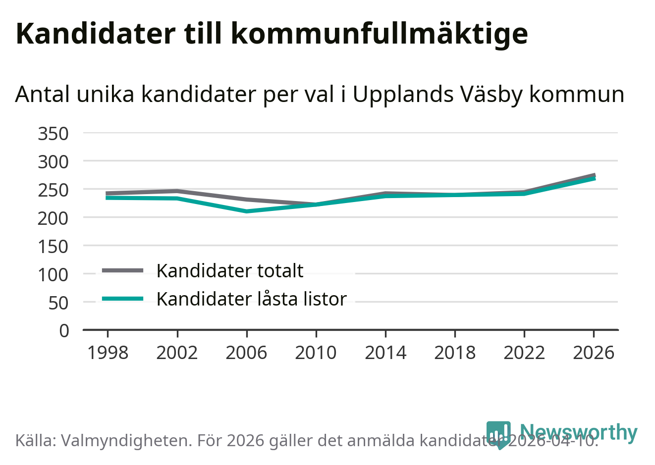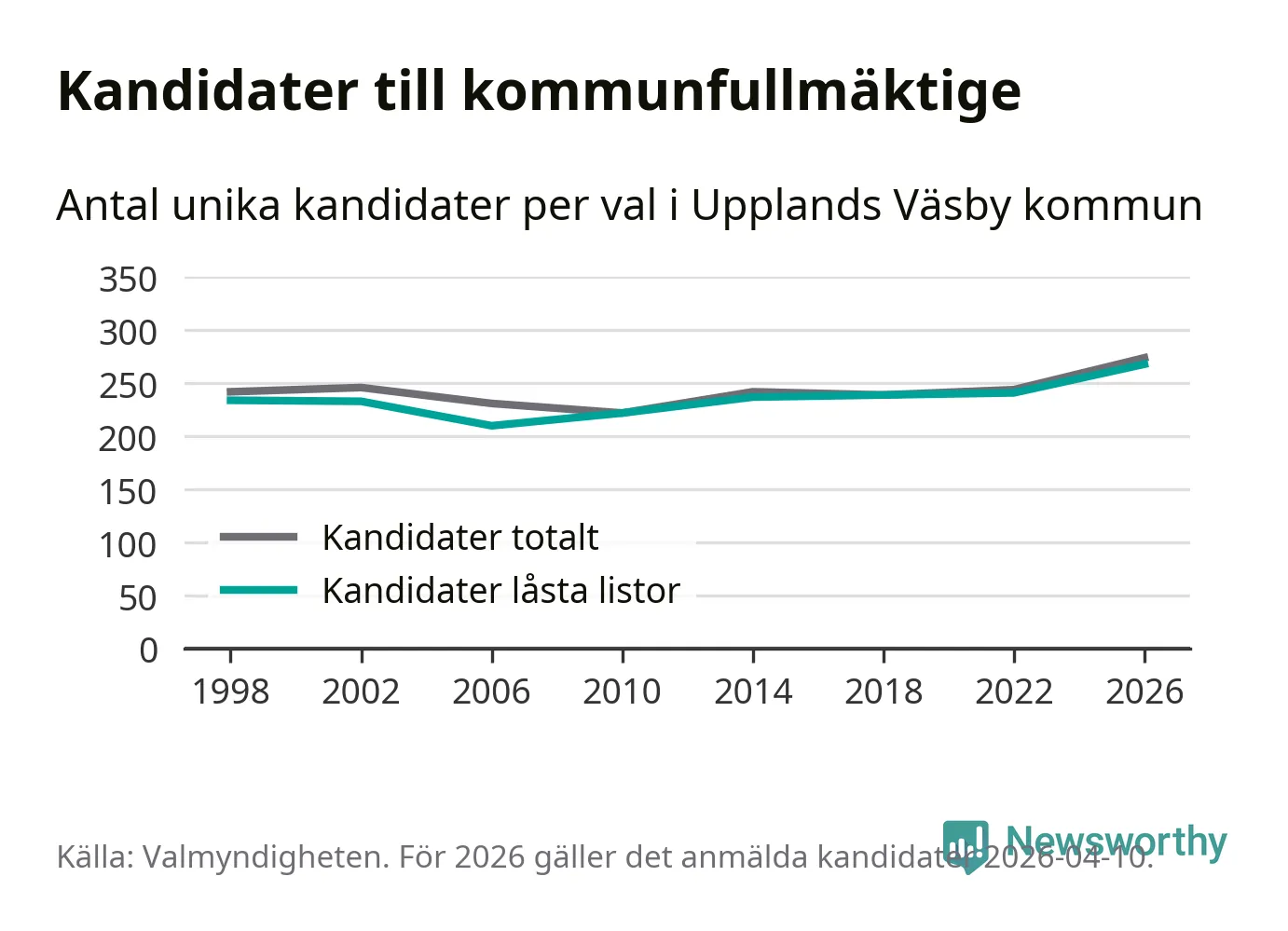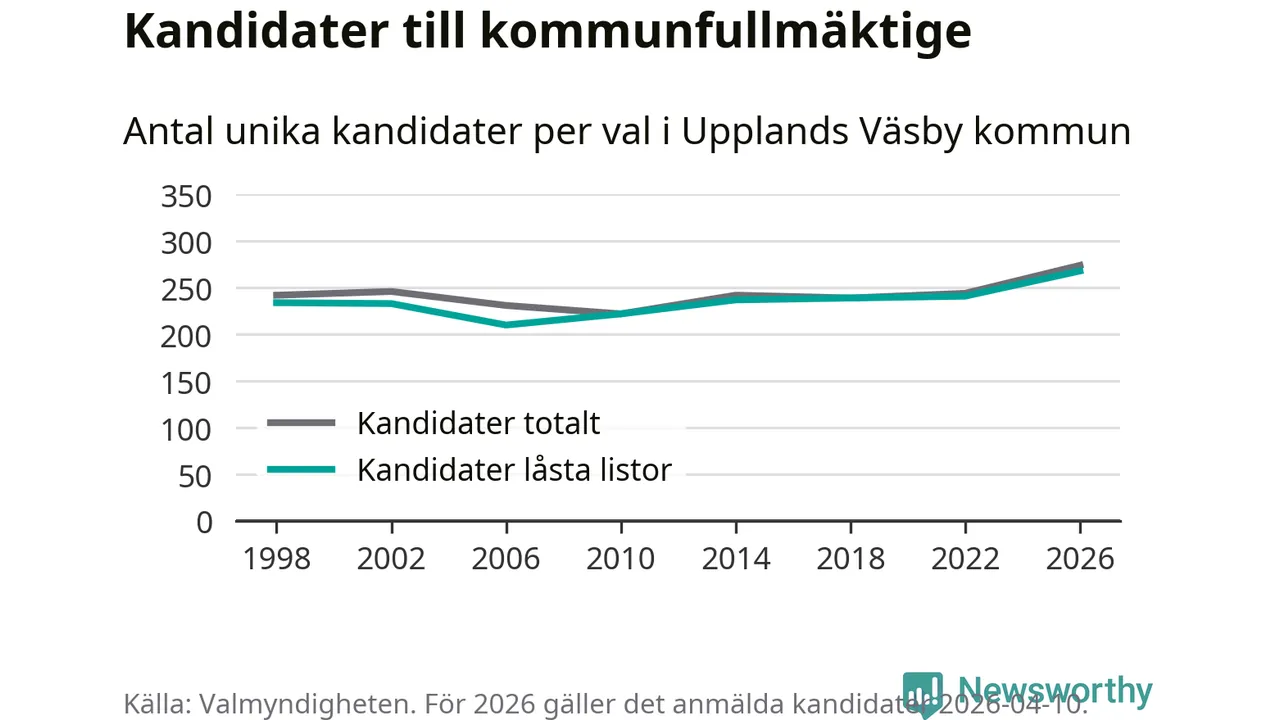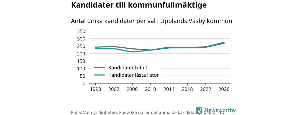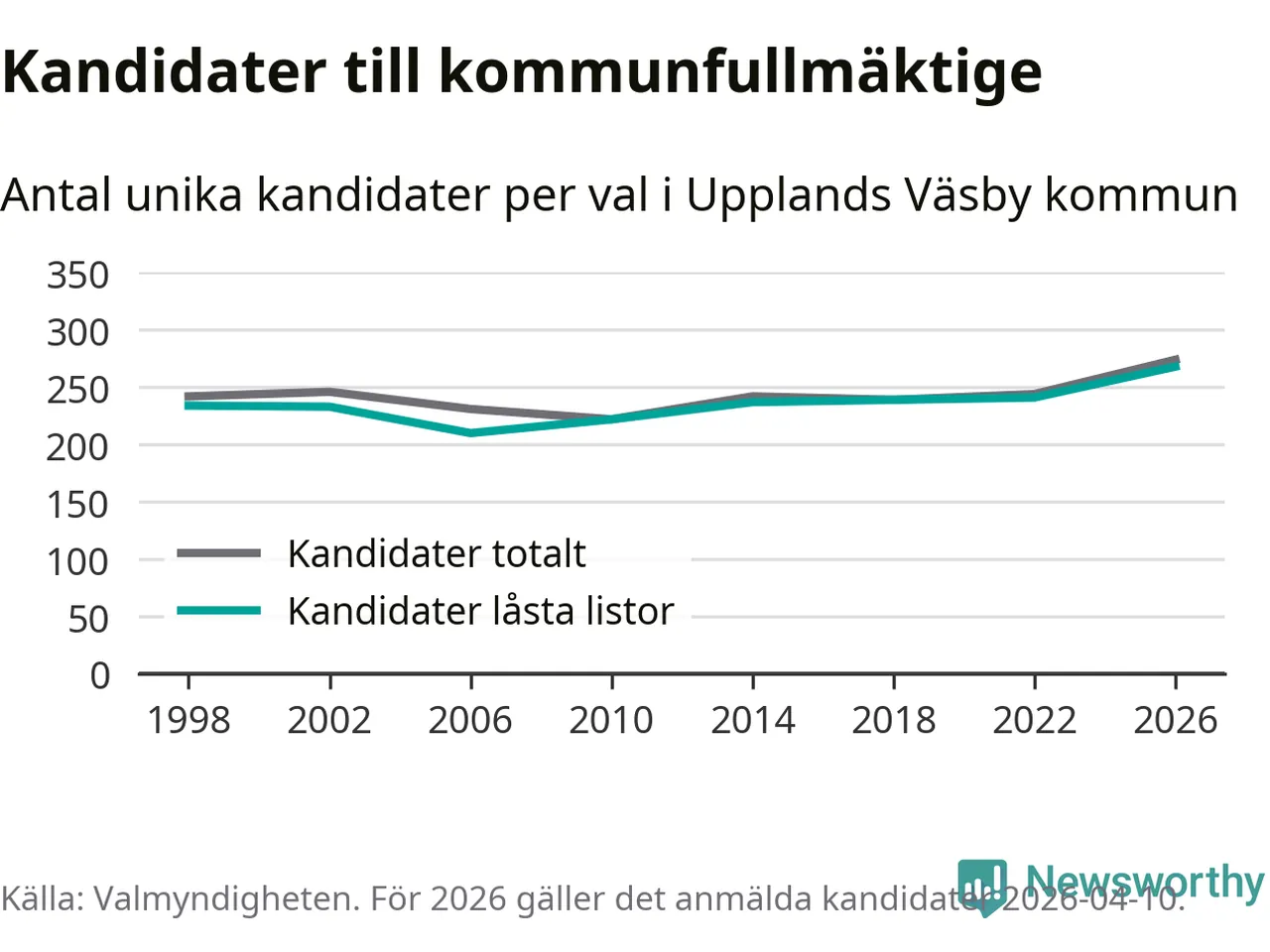 På torsdagen var det deadline för partier med låsta listor att registrera sina kandidater inför höstens val. Till valet till kommunfullmäktige i Upplands Väsby är 268 kandidater anmälda på sådana listor, vilket är 27 fler än i valet 2022. Det är den högsta siffran sedan åtminstone valet 1998, vilket är så långt tillbaka som vi har statistik för.