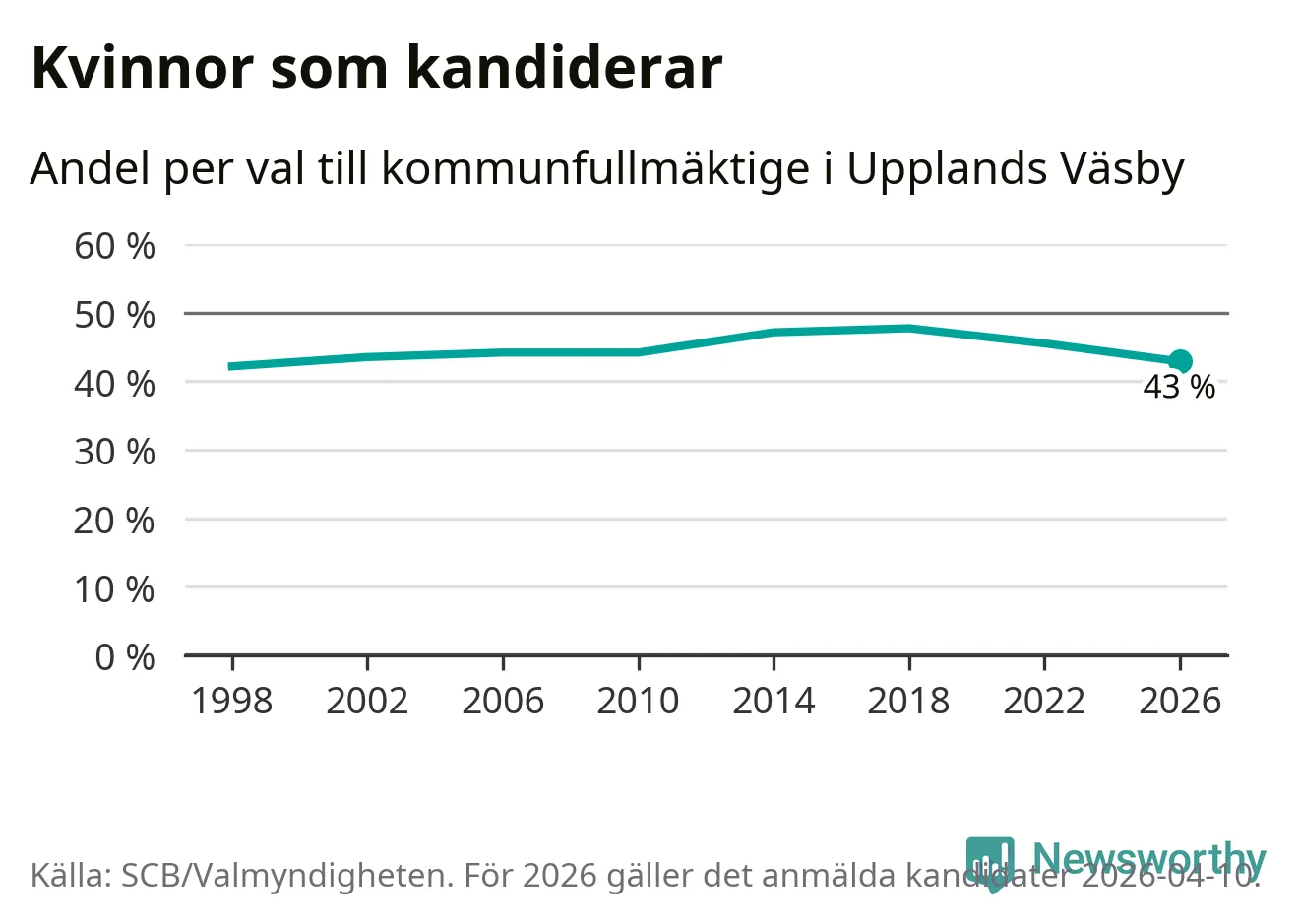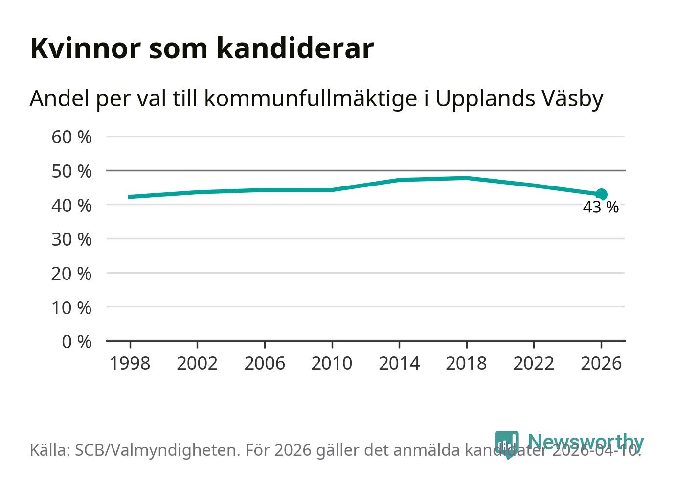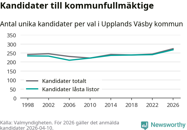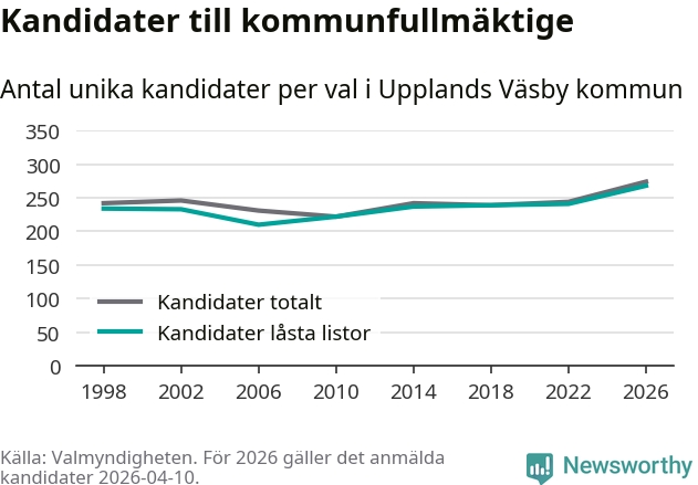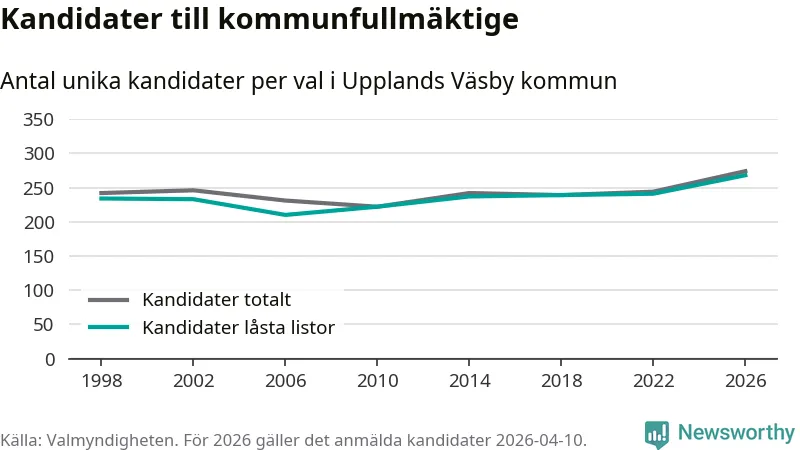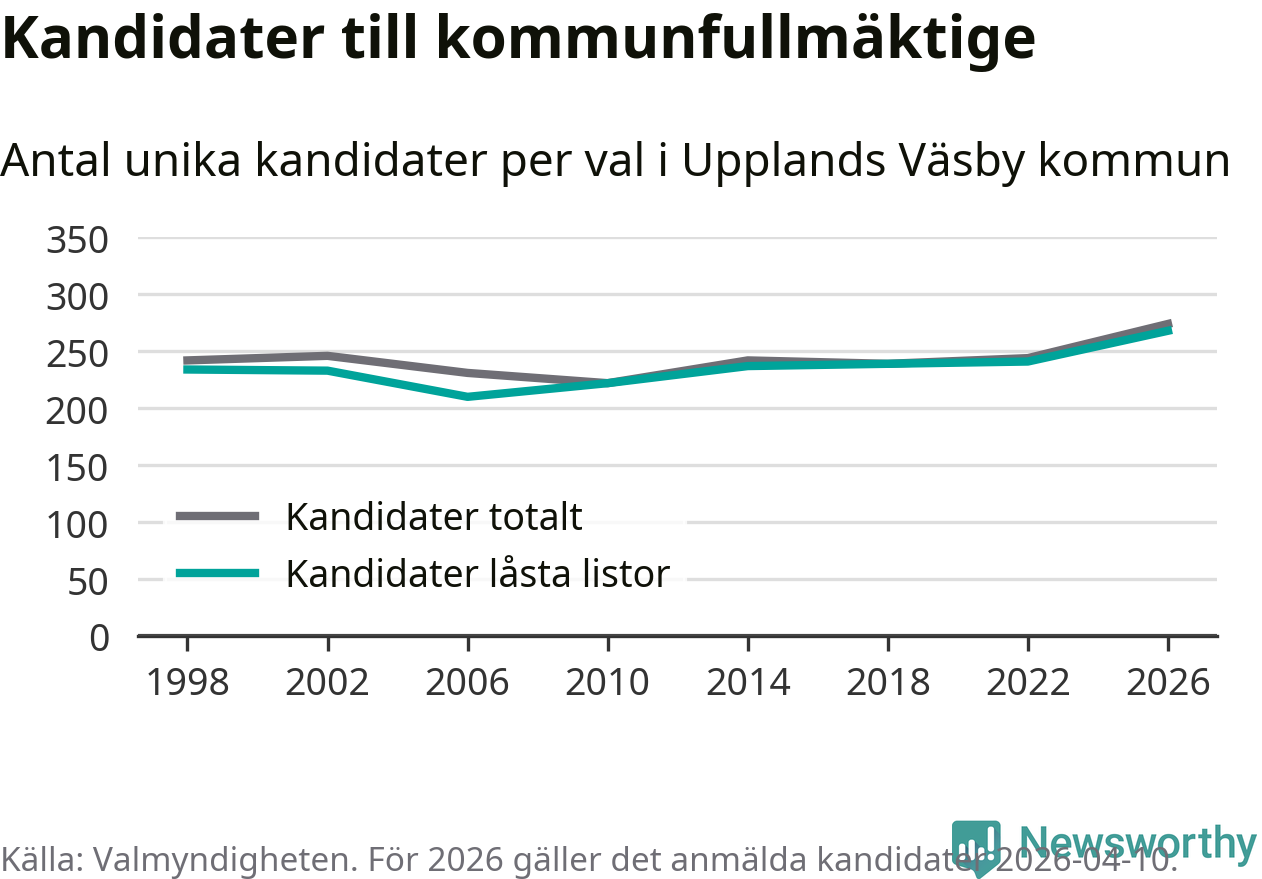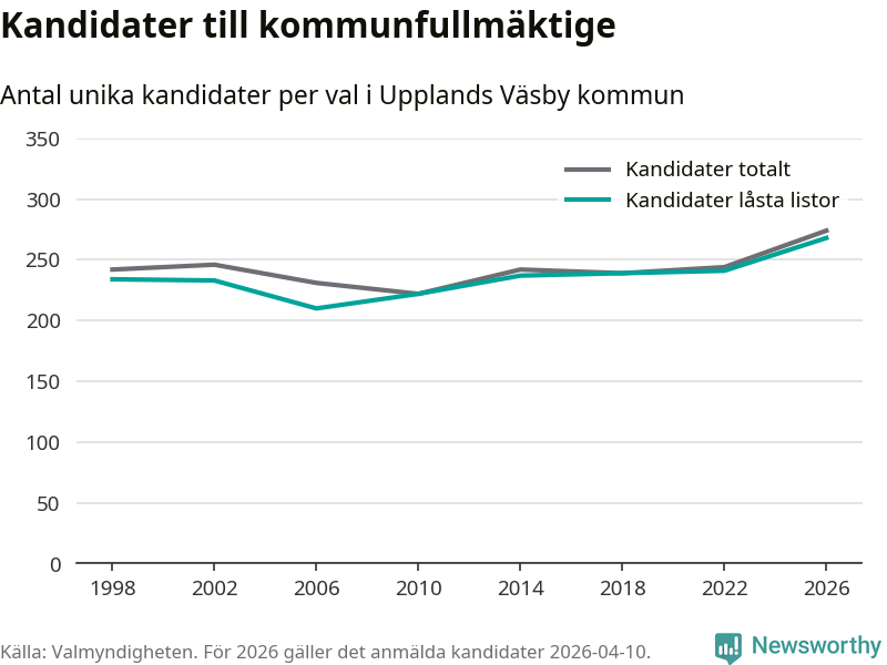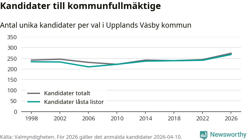 På torsdagen var det deadline för partier med låsta listor att registrera sina kandidater inför höstens val. Till valet till kommunfullmäktige i Upplands Väsby är 268 kandidater anmälda på sådana listor, vilket är 27 fler än i valet 2022. Det är den högsta siffran sedan åtminstone valet 1998, vilket är så långt tillbaka som vi har statistik för.