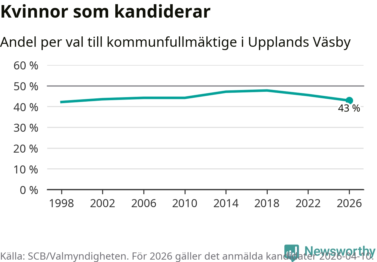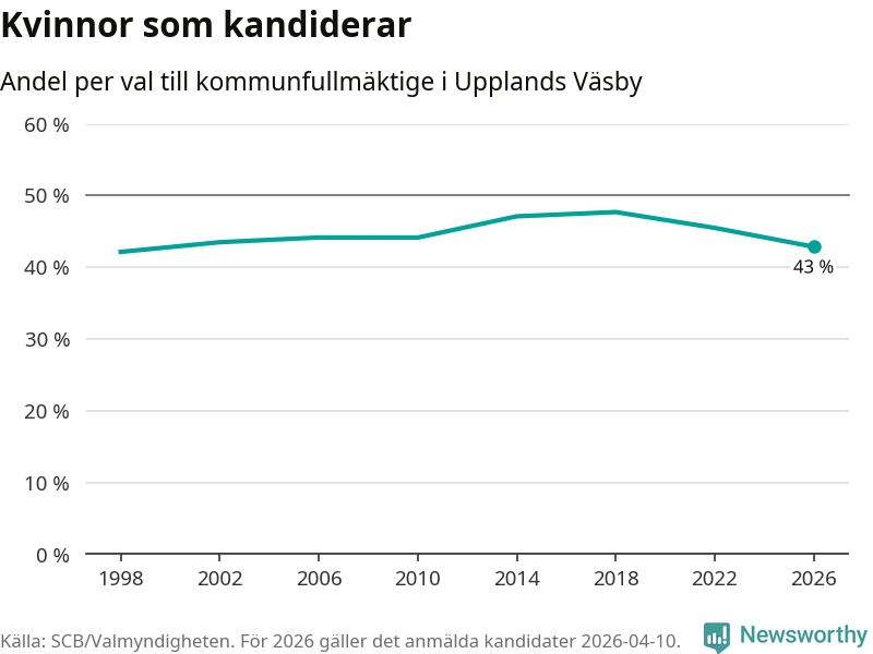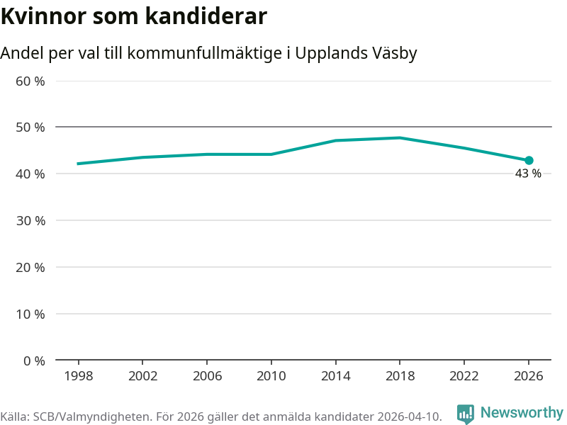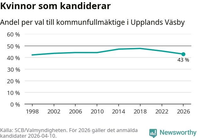 Kvinnorna utgör 43 procent av de hittills anmälda kandidaterna, vilket är den lägsta andelen på listorna till kommunfullmäktige i Upplands Väsby sedan valet 1998. Vid valet 2018 var 48 procent kvinnor, valet 1998 var motsvarande siffra 42 procent. Upplands Väsby är en av 264 kommuner i landet där männen utgör en majoritet av kandidaterna på listorna.
