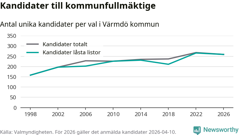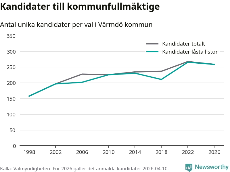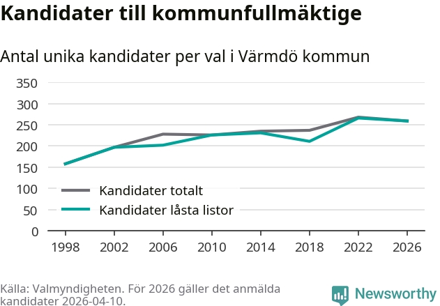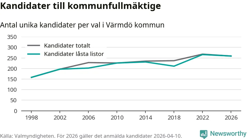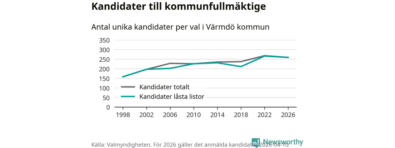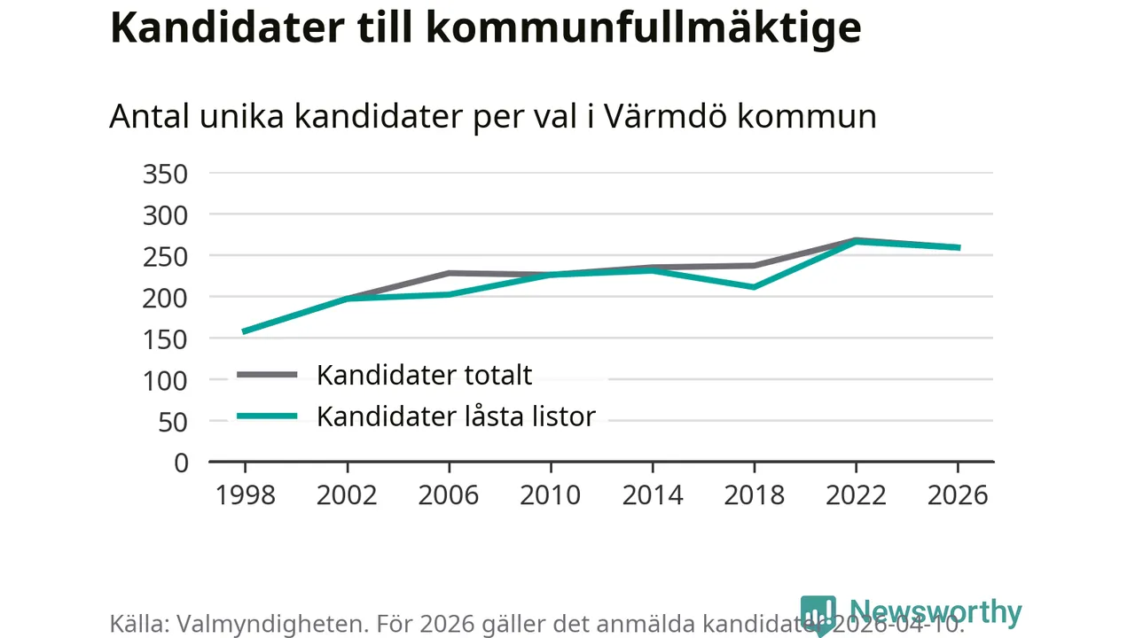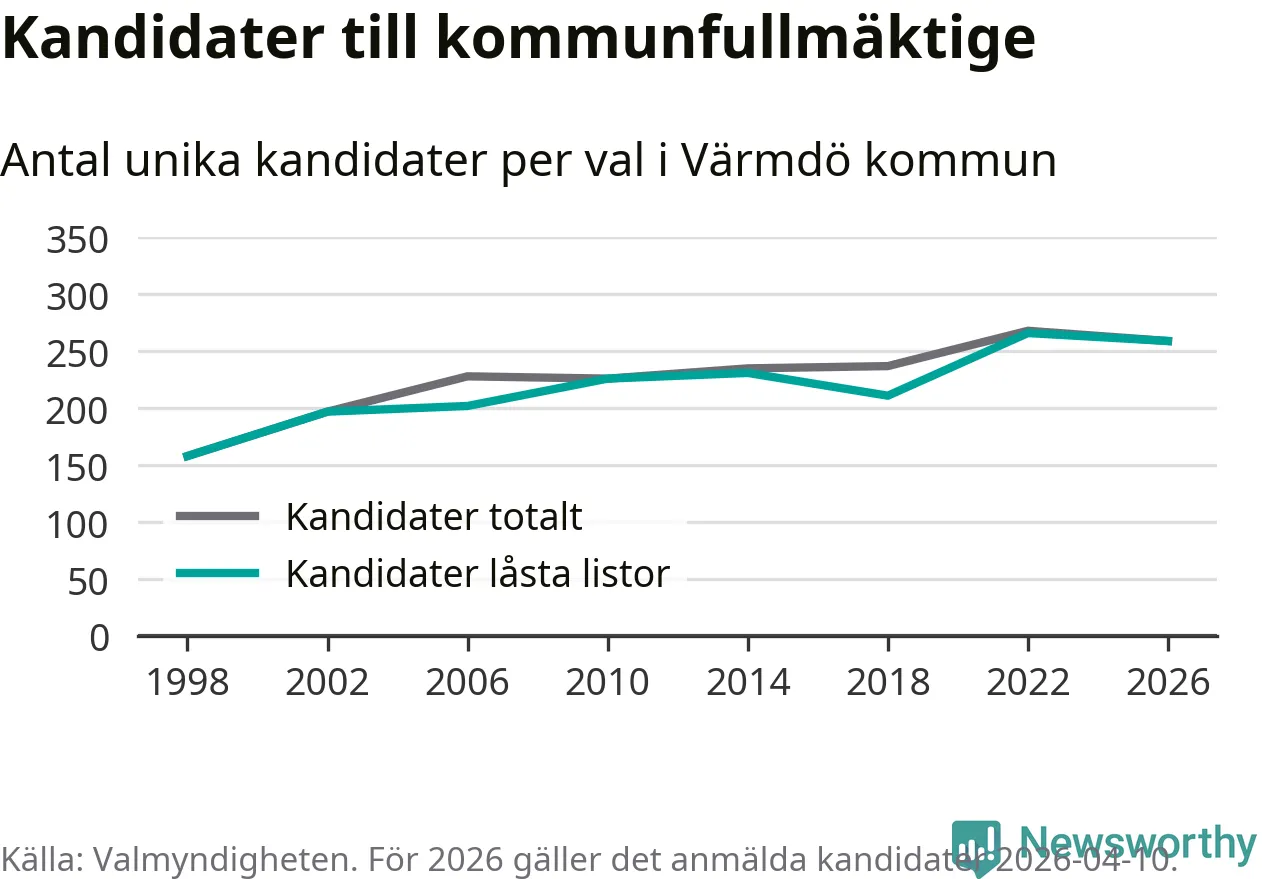 På torsdagen var det deadline för partier med låsta listor att registrera sina kandidater inför höstens val. Till valet till kommunfullmäktige i Värmdö är 259 kandidater anmälda på sådana listor, vilket är sju färre än i valet 2022.