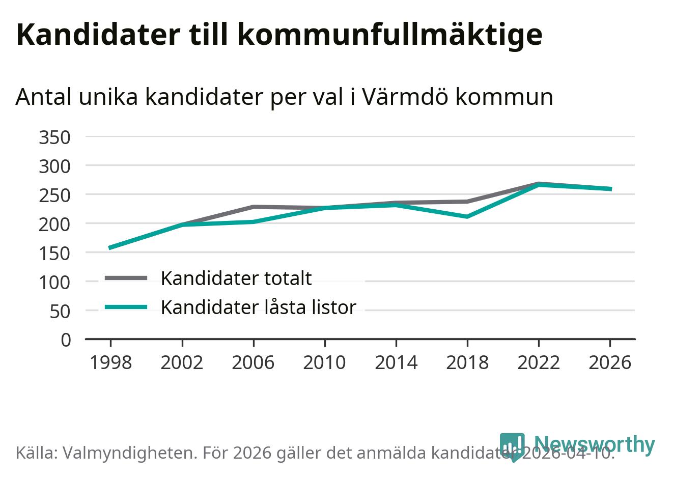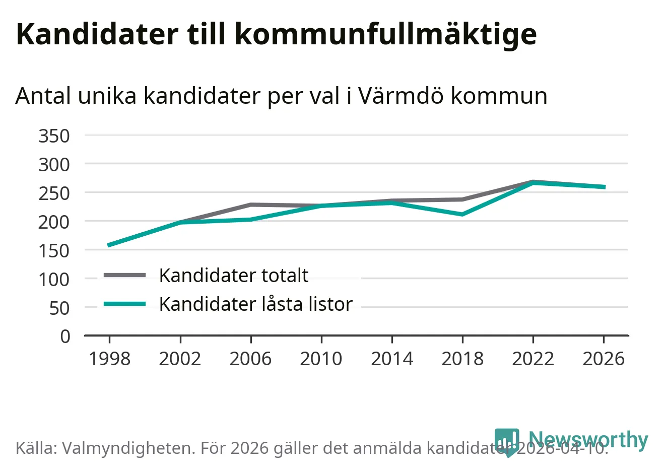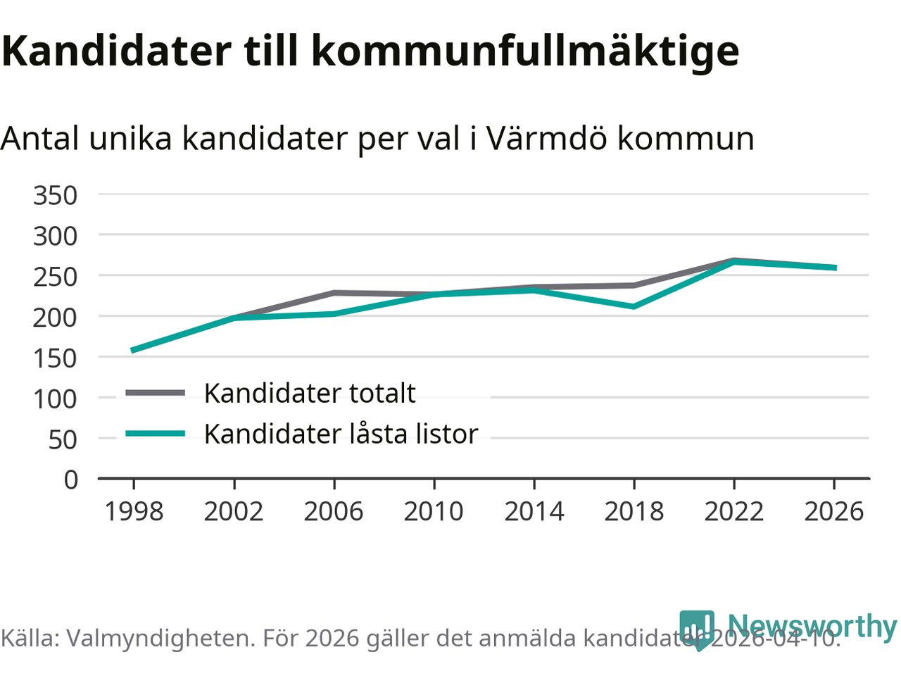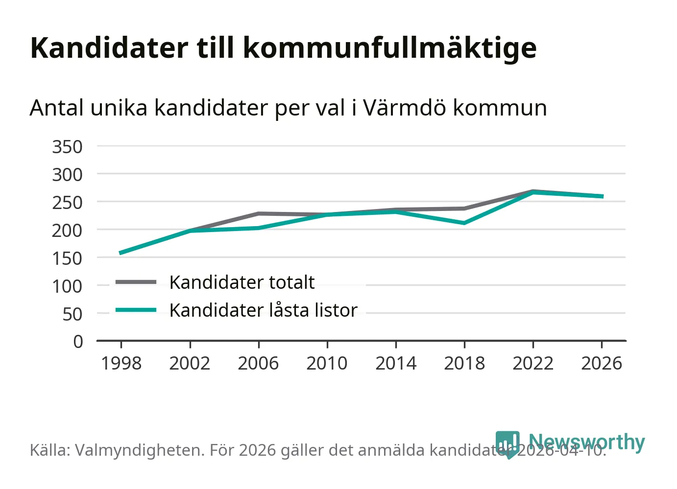 På torsdagen var det deadline för partier med låsta listor att registrera sina kandidater inför höstens val. Till valet till kommunfullmäktige i Värmdö är 259 kandidater anmälda på sådana listor, vilket är sju färre än i valet 2022.