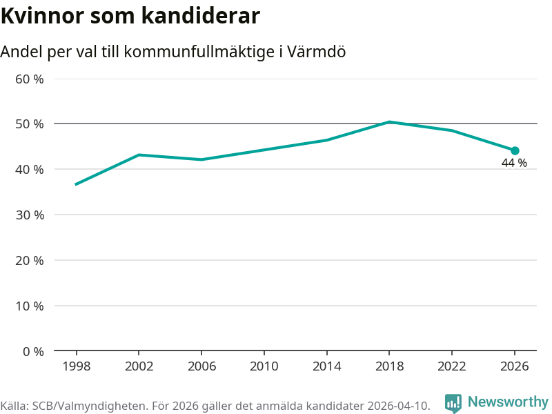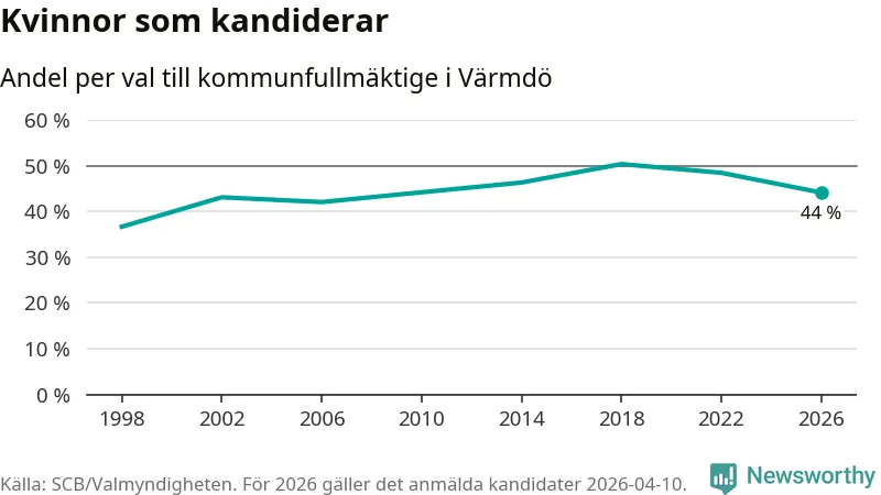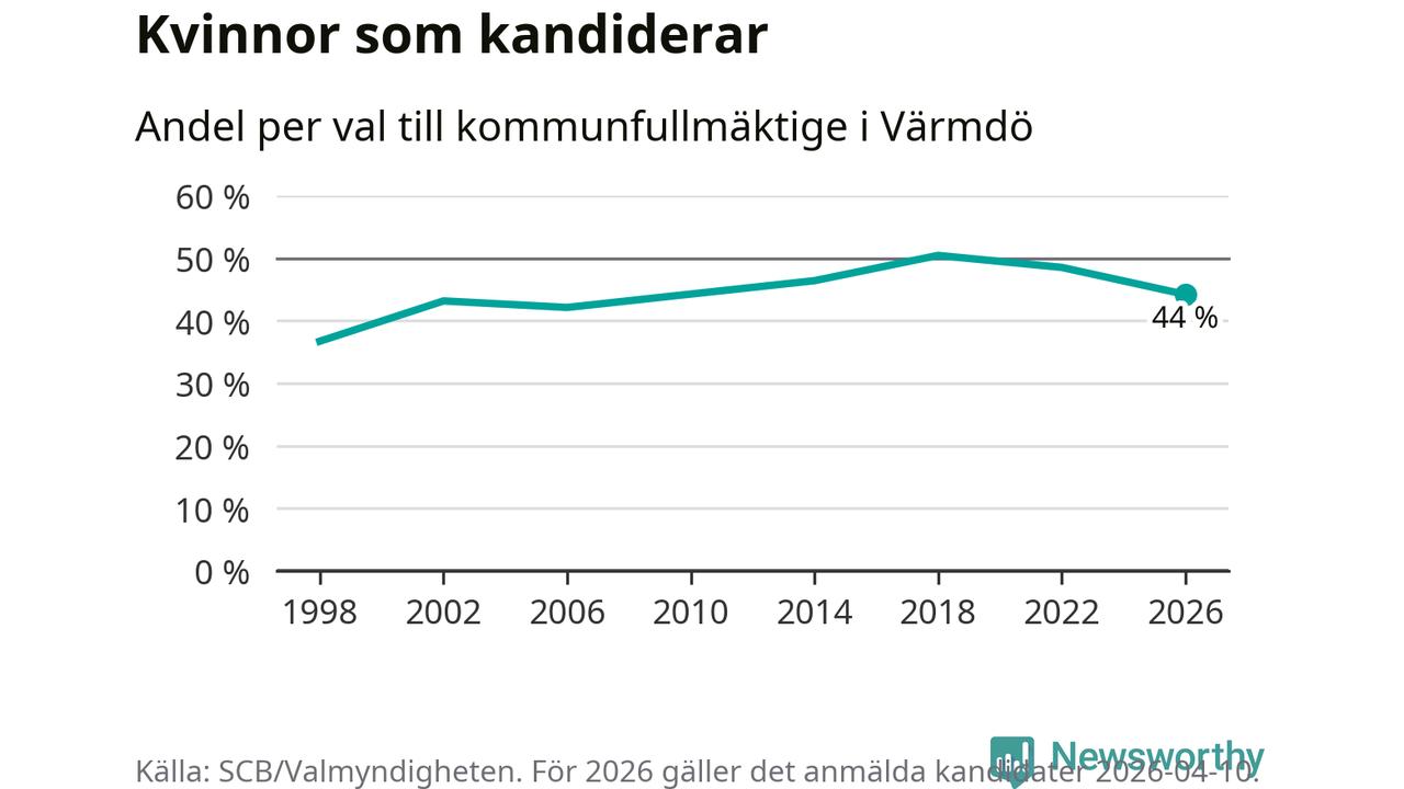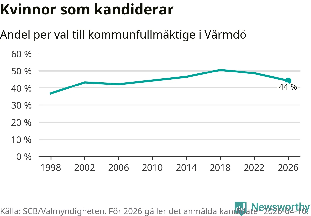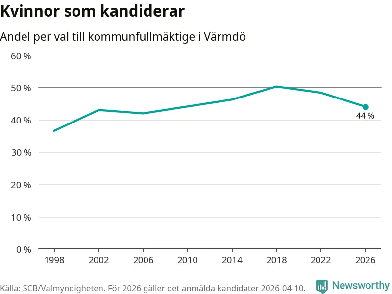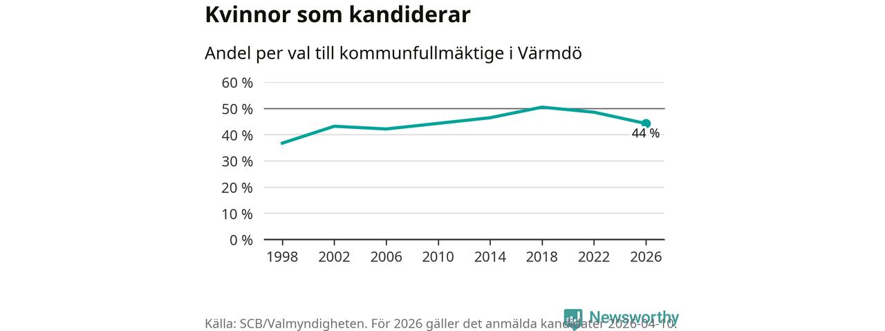 Kvinnorna utgör 44 procent av de hittills anmälda kandidaterna, vilket är den lägsta andelen på listorna till kommunfullmäktige i Värmdö sedan valet 2006. Vid valet 2018 var 50 procent kvinnor, valet 1998 var motsvarande siffra 37 procent. Värmdö är en av 264 kommuner i landet där männen utgör en majoritet av kandidaterna på listorna.
