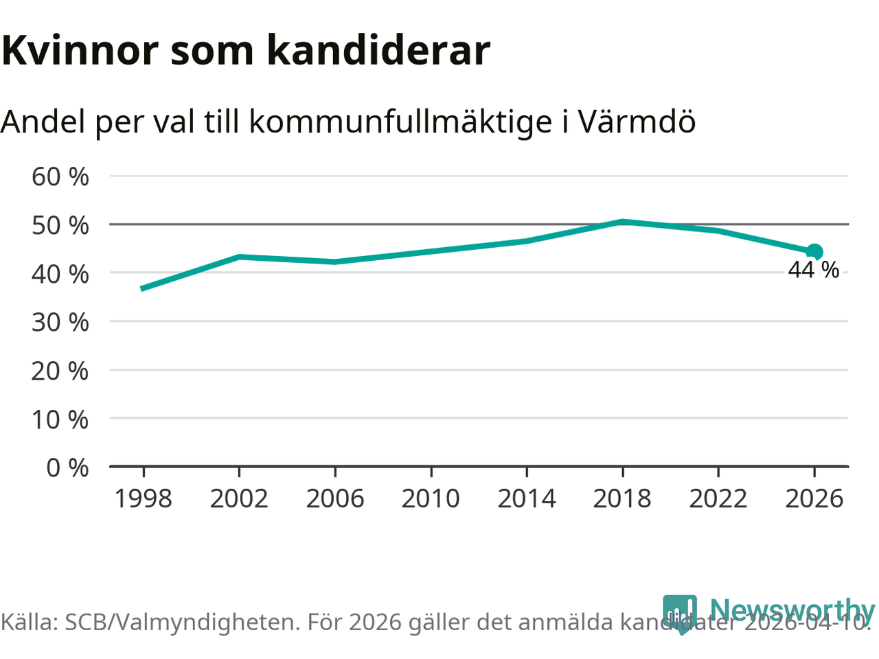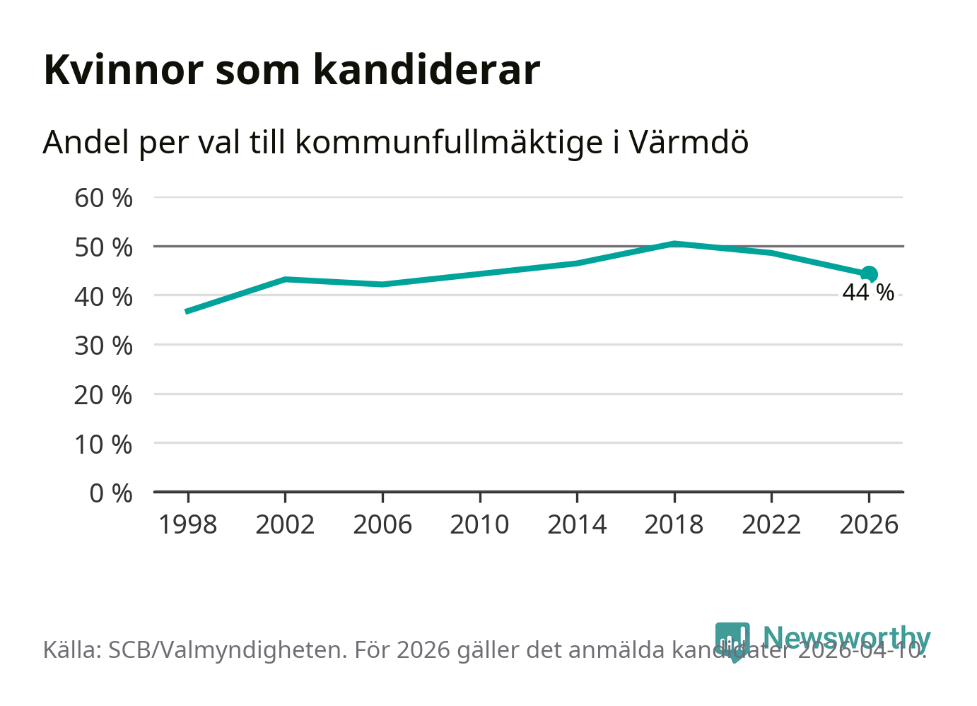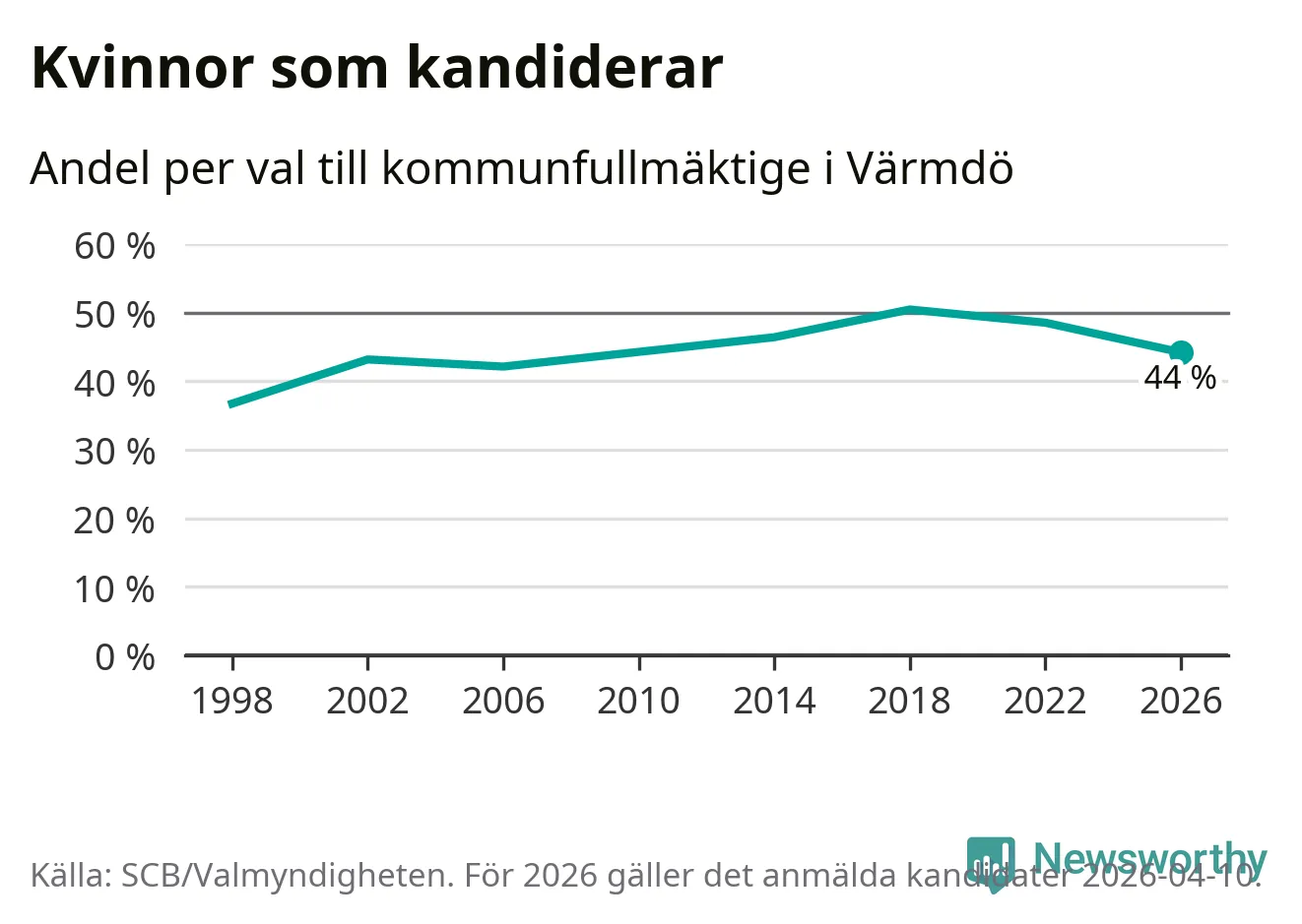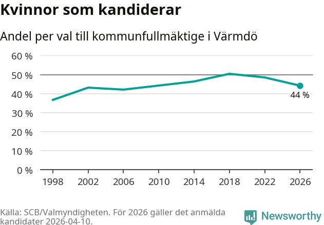 Kvinnorna utgör 44 procent av de hittills anmälda kandidaterna, vilket är den lägsta andelen på listorna till kommunfullmäktige i Värmdö sedan valet 2006. Vid valet 2018 var 50 procent kvinnor, valet 1998 var motsvarande siffra 37 procent. Värmdö är en av 264 kommuner i landet där männen utgör en majoritet av kandidaterna på listorna.