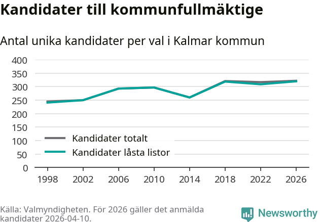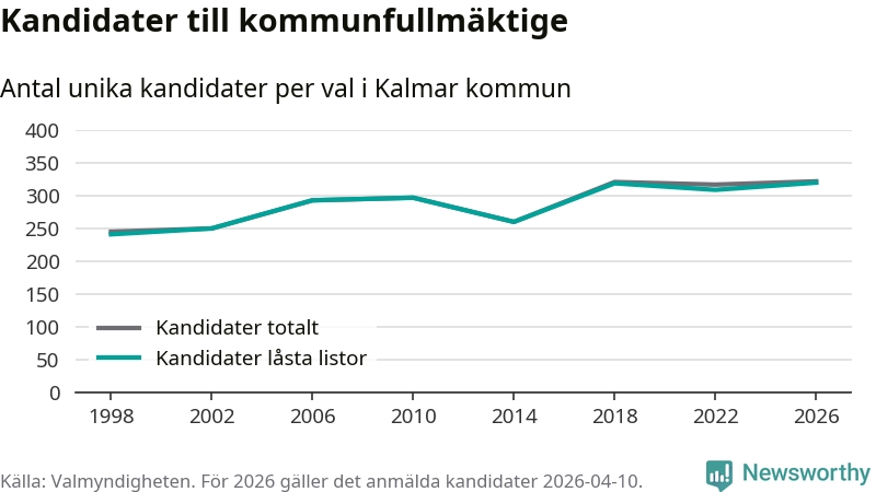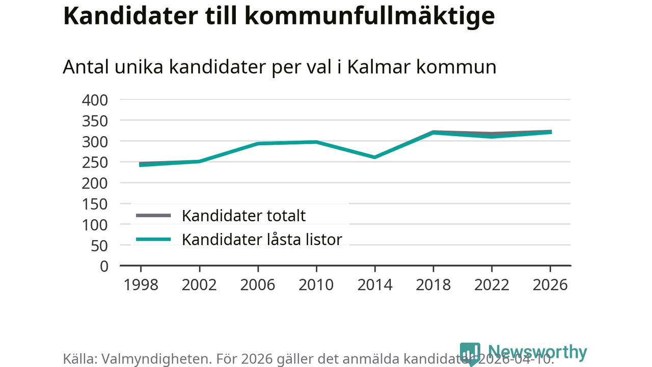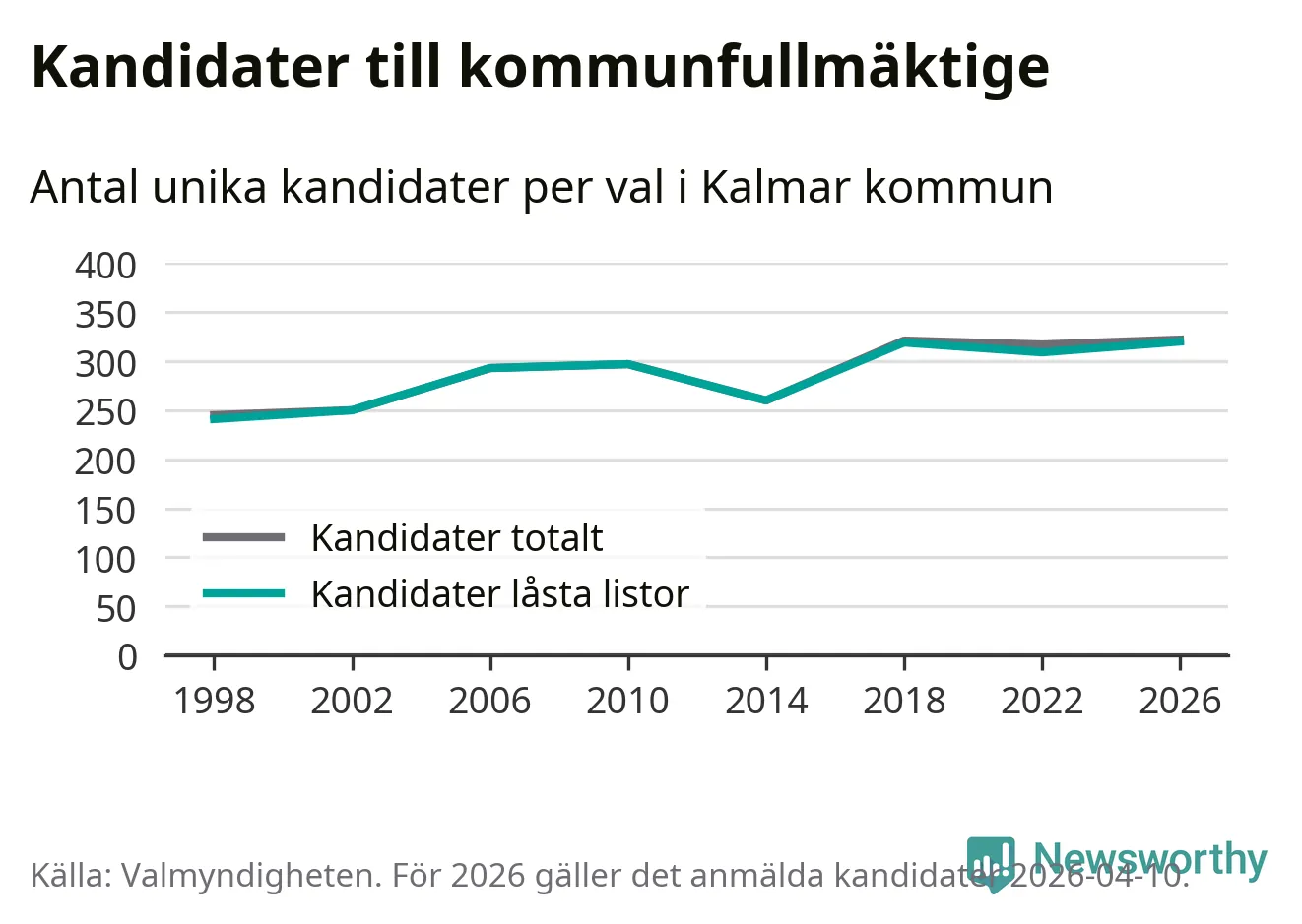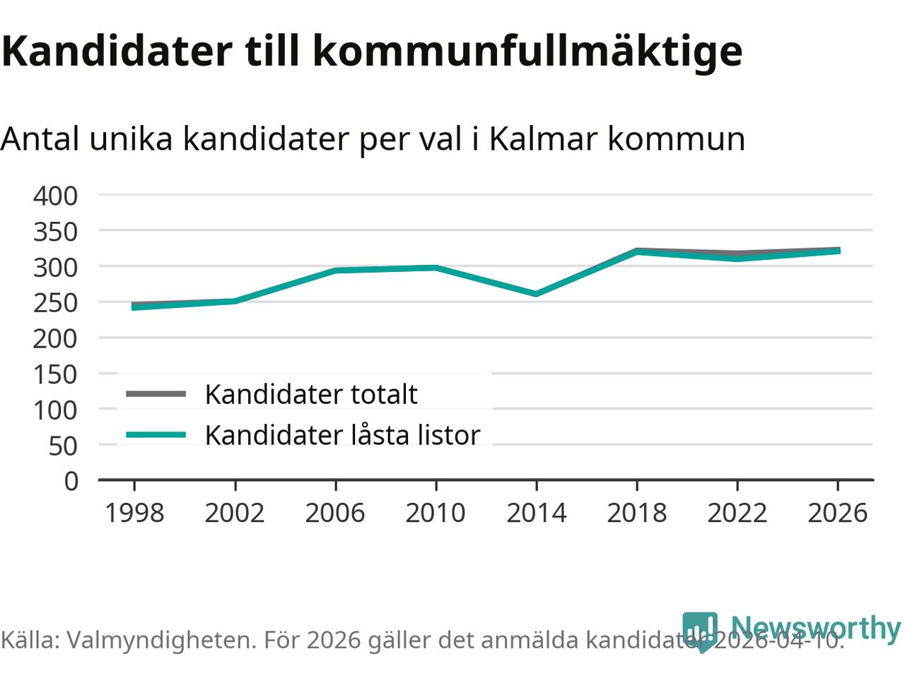 På torsdagen var det deadline för partier med låsta listor att registrera sina kandidater inför höstens val. Till valet till kommunfullmäktige i Kalmar kommun är 320 kandidater anmälda på sådana listor, vilket är elva fler än i valet 2022. Det är den högsta siffran sedan åtminstone valet 1998, vilket är så långt tillbaka som vi har statistik för.