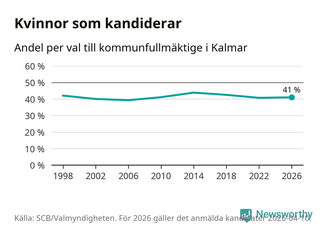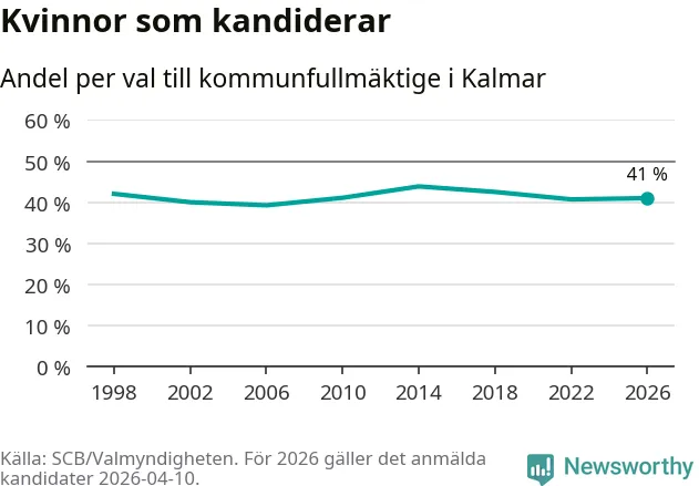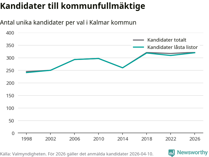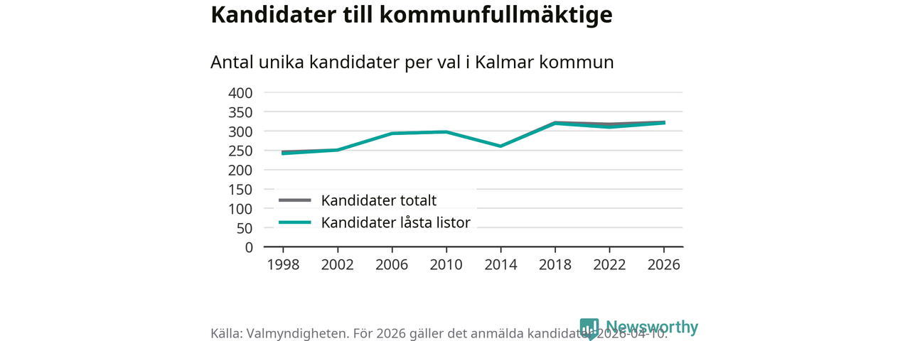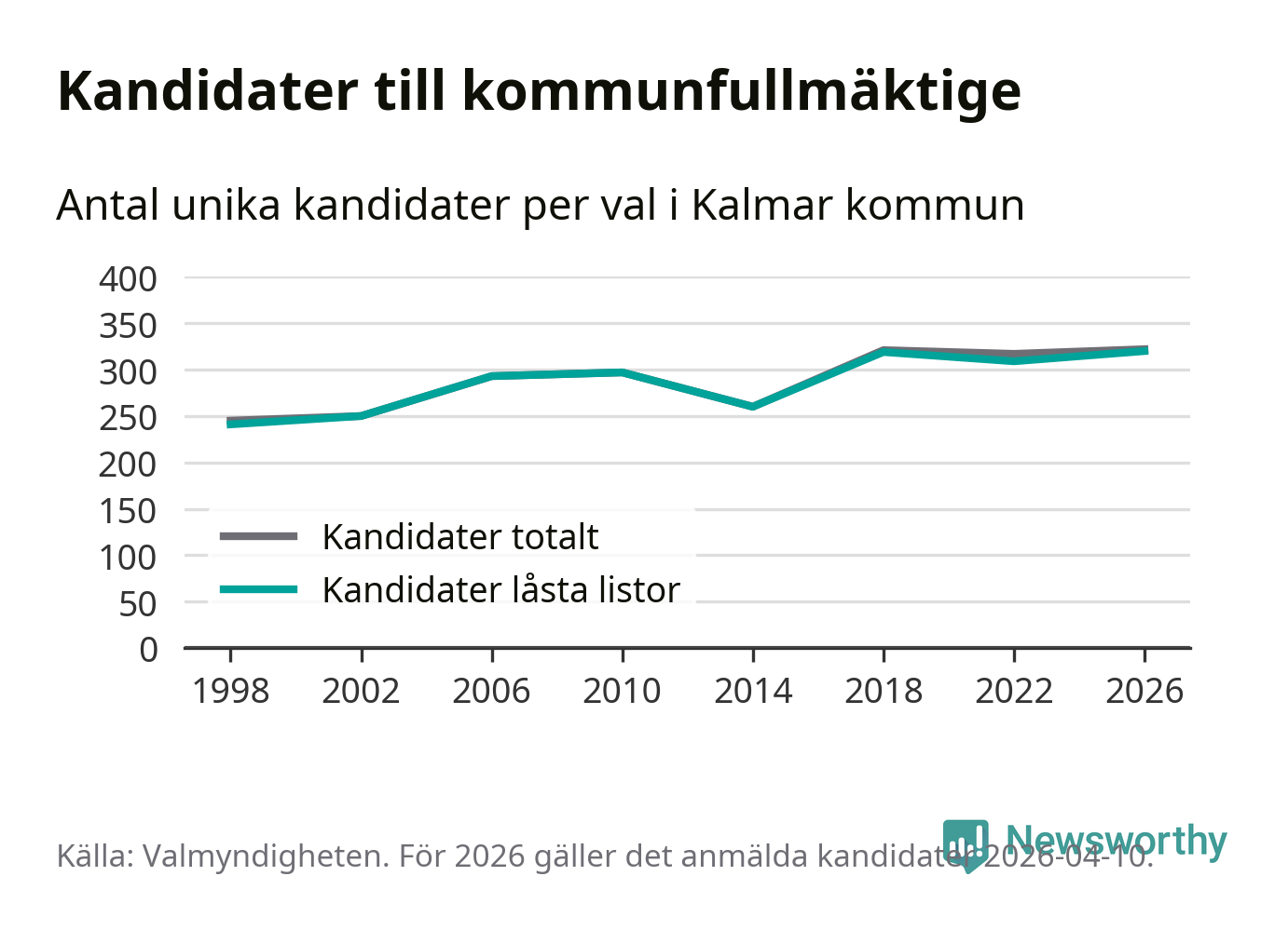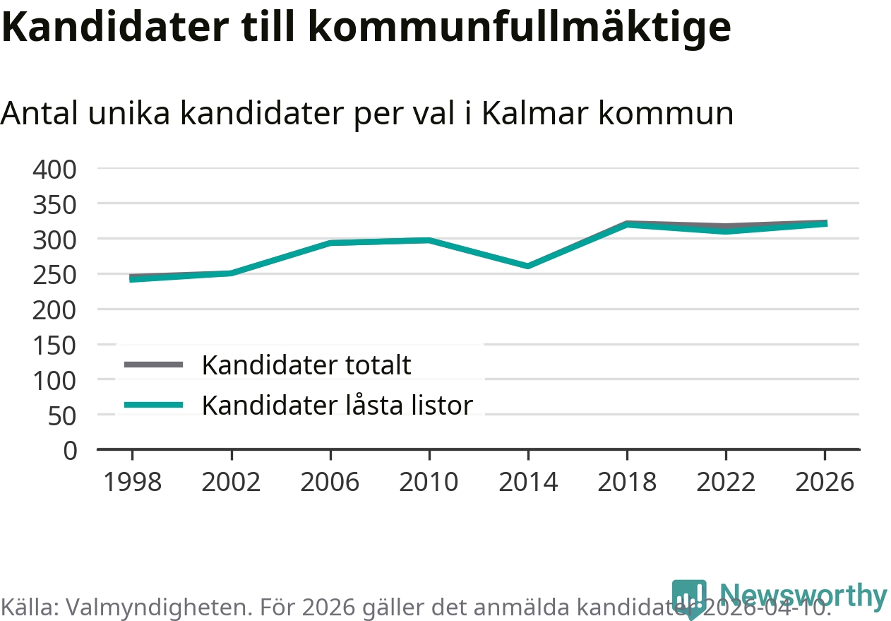 På torsdagen var det deadline för partier med låsta listor att registrera sina kandidater inför höstens val. Till valet till kommunfullmäktige i Kalmar kommun är 320 kandidater anmälda på sådana listor, vilket är elva fler än i valet 2022. Det är den högsta siffran sedan åtminstone valet 1998, vilket är så långt tillbaka som vi har statistik för.