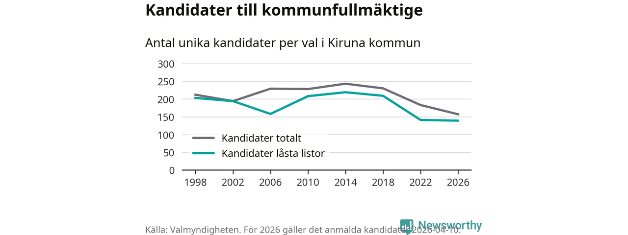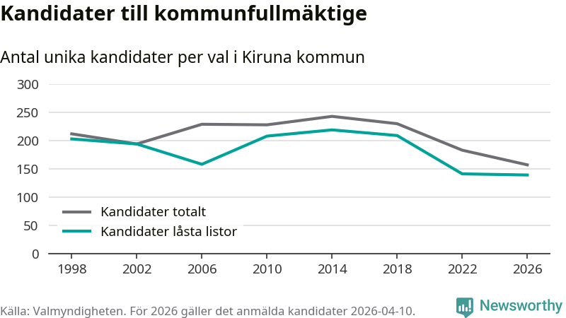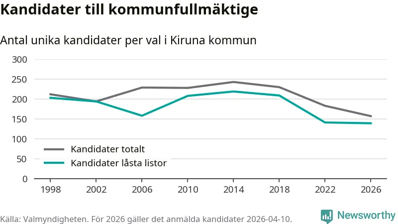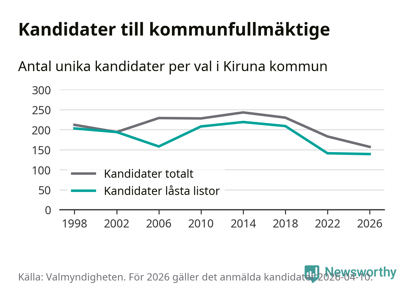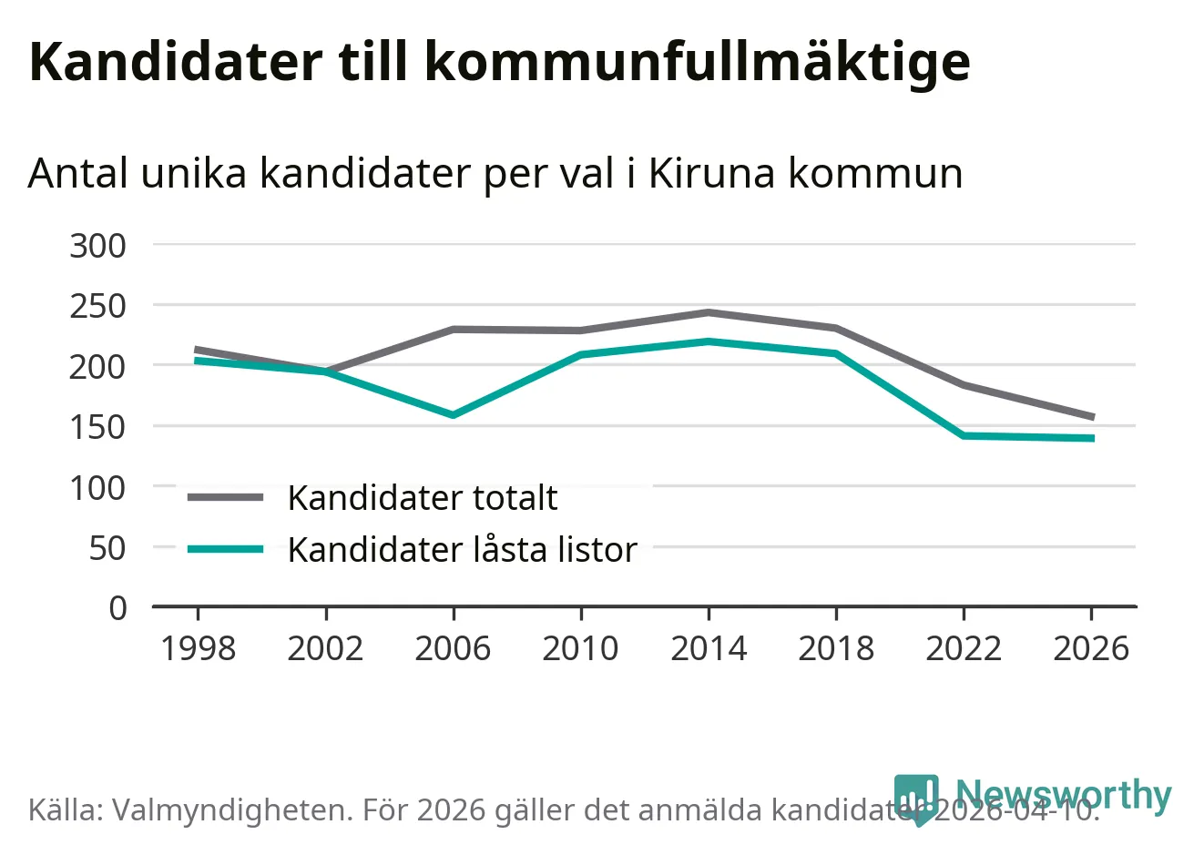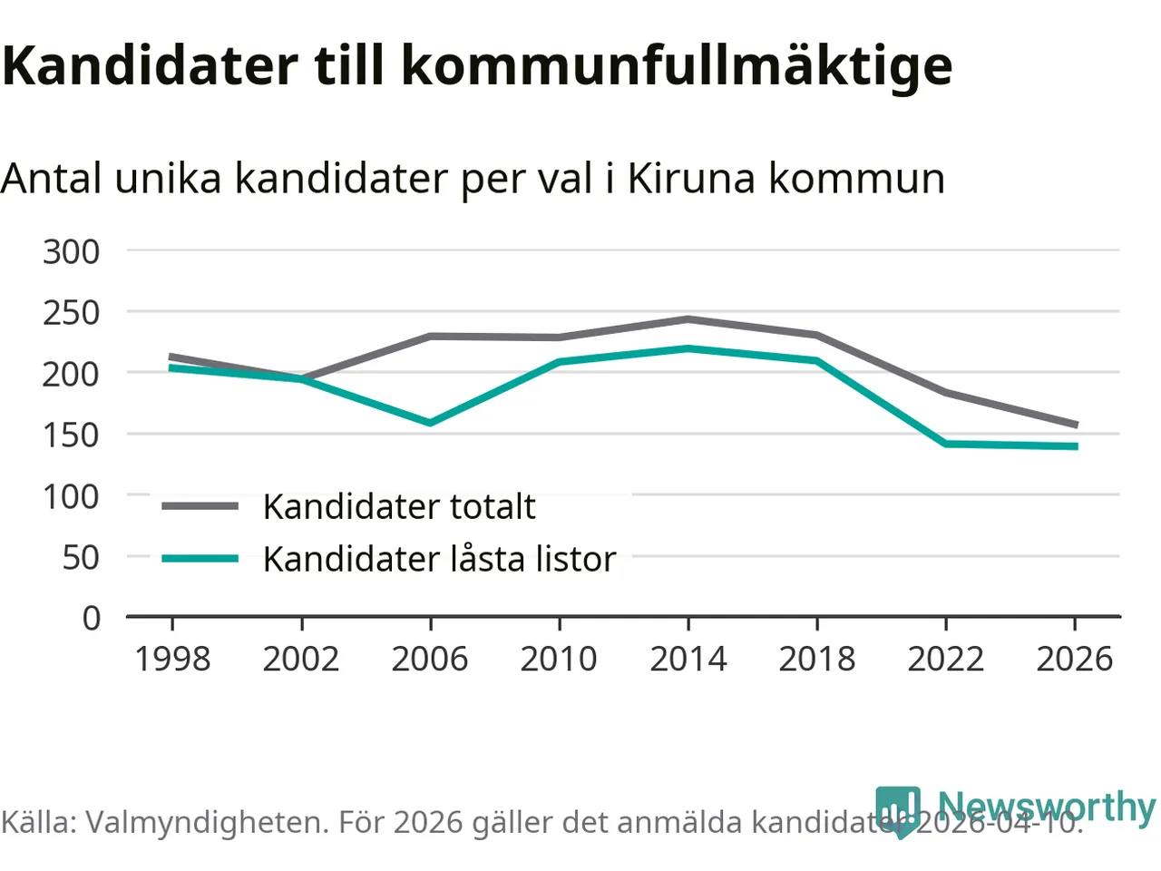 På torsdagen var det deadline för partier med låsta listor att registrera sina kandidater inför höstens val. Till valet till kommunfullmäktige i Kiruna är 139 kandidater anmälda på sådana listor, vilket är två färre än i valet 2022. Det är den lägsta siffran sedan åtminstone valet 1998, vilket är så långt tillbaka som vi har statistik för.
