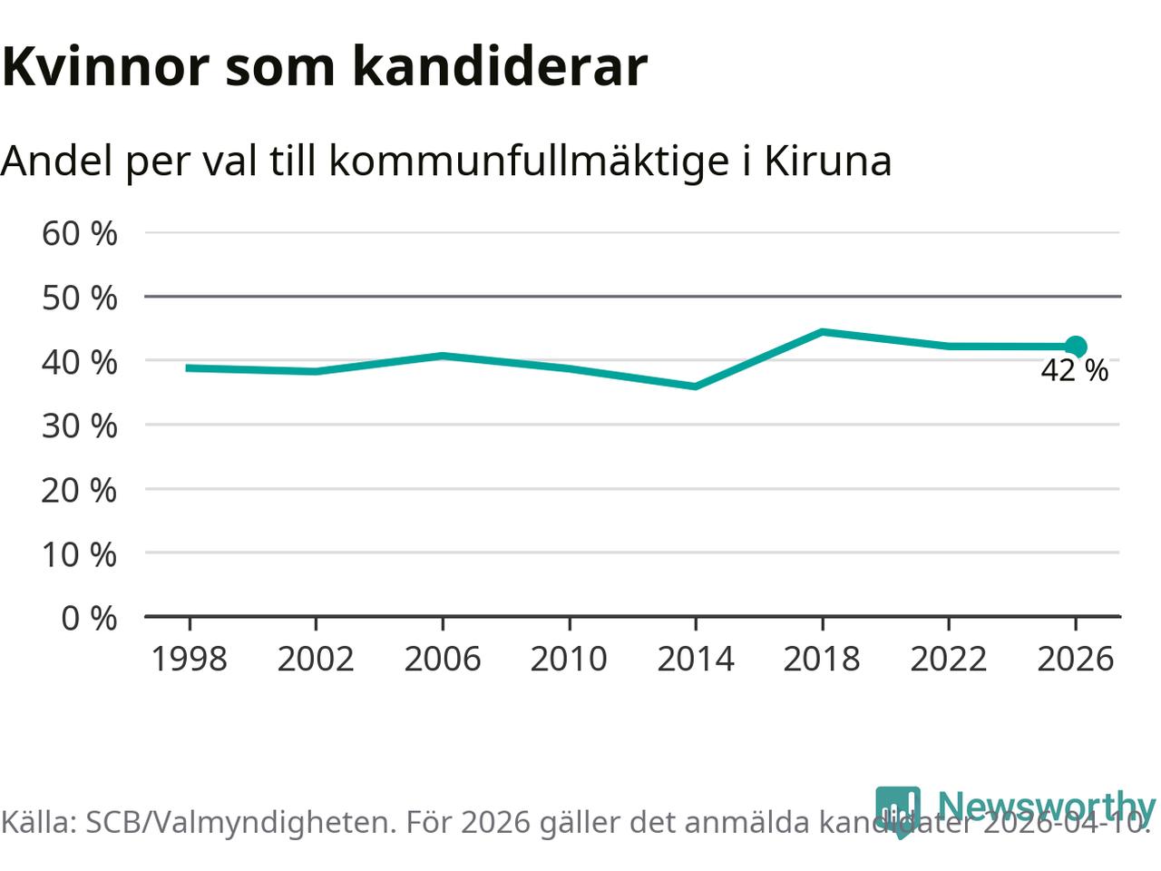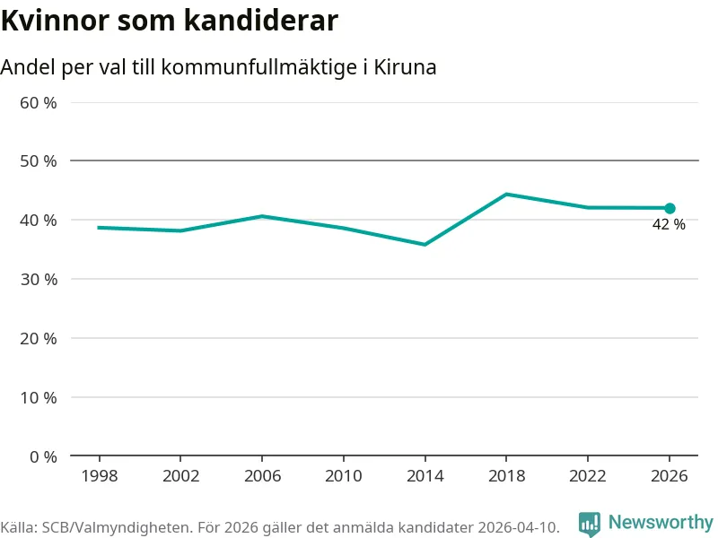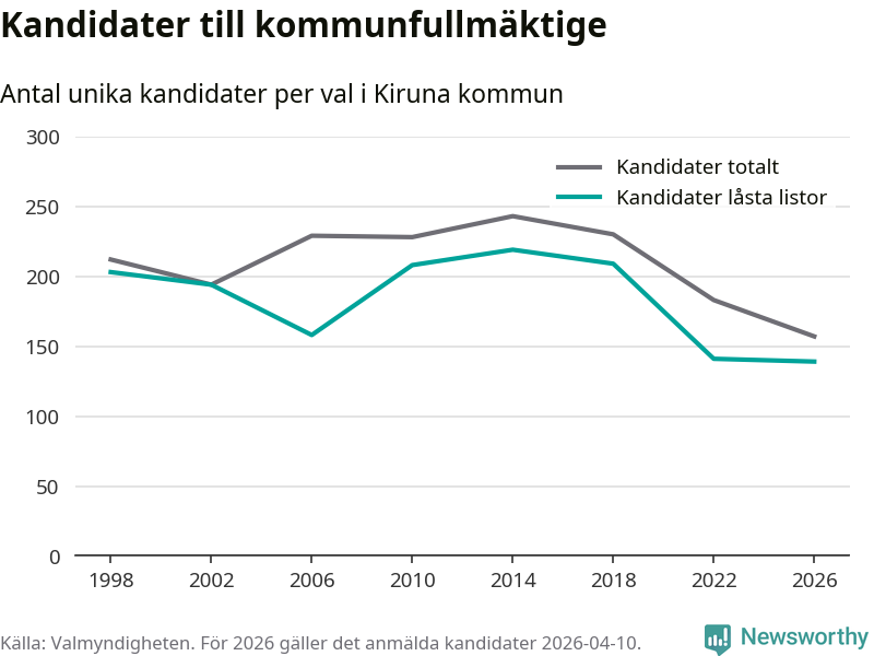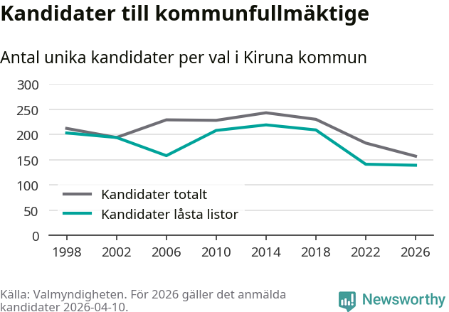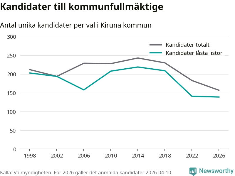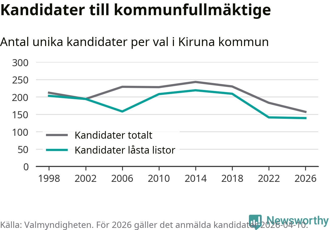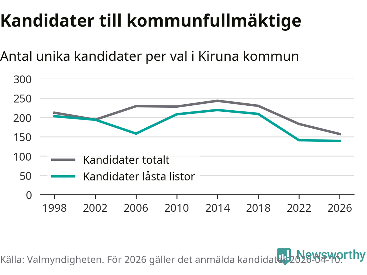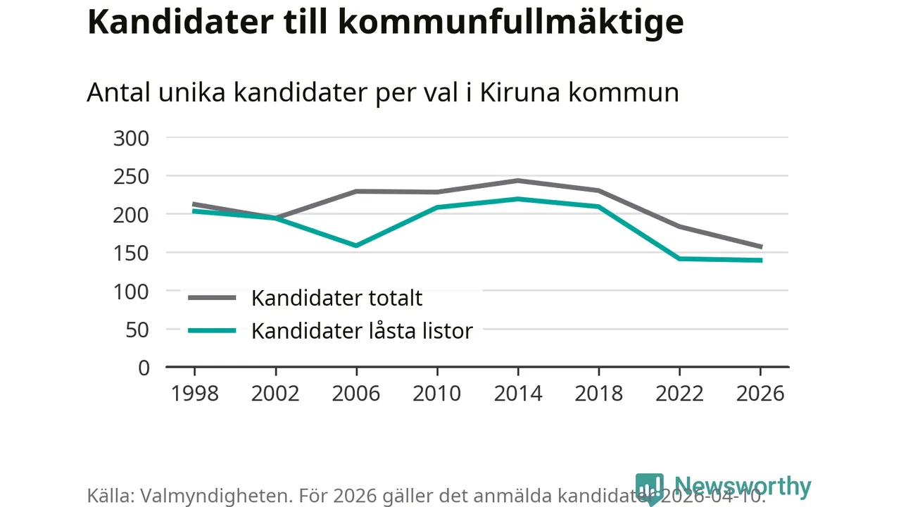 På torsdagen var det deadline för partier med låsta listor att registrera sina kandidater inför höstens val. Till valet till kommunfullmäktige i Kiruna är 139 kandidater anmälda på sådana listor, vilket är två färre än i valet 2022. Det är den lägsta siffran sedan åtminstone valet 1998, vilket är så långt tillbaka som vi har statistik för.