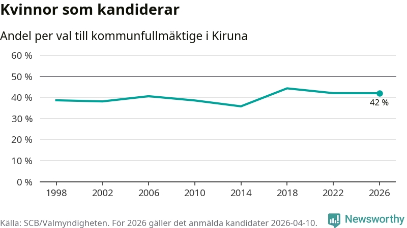 Kvinnorna utgör 42 procent av de hittills anmälda kandidaterna, vilket är den lägsta andelen på listorna till kommunfullmäktige i Kiruna sedan valet 2014. Vid valet 2018 var 44 procent kvinnor, valet 2014 var motsvarande siffra 36 procent. Kiruna är en av 264 kommuner i landet där männen utgör en majoritet av kandidaterna på listorna.