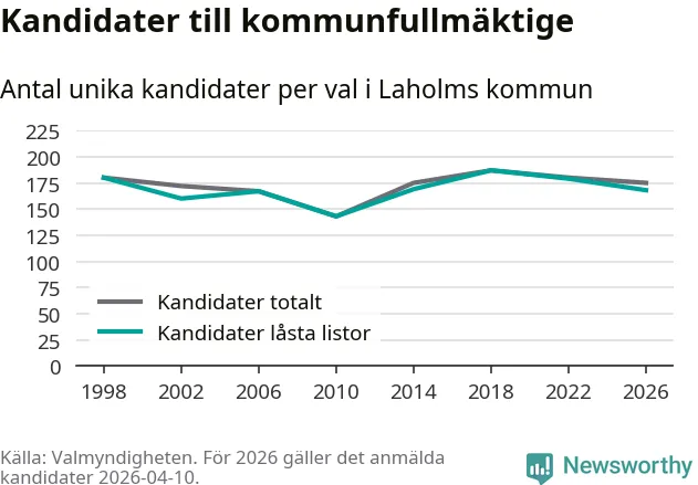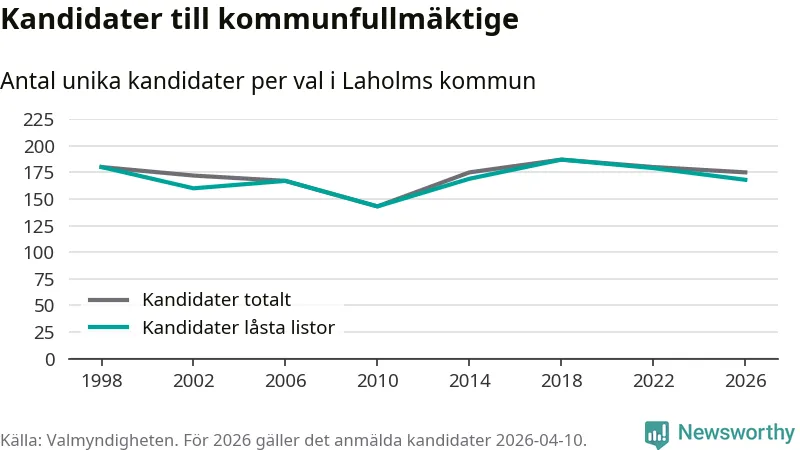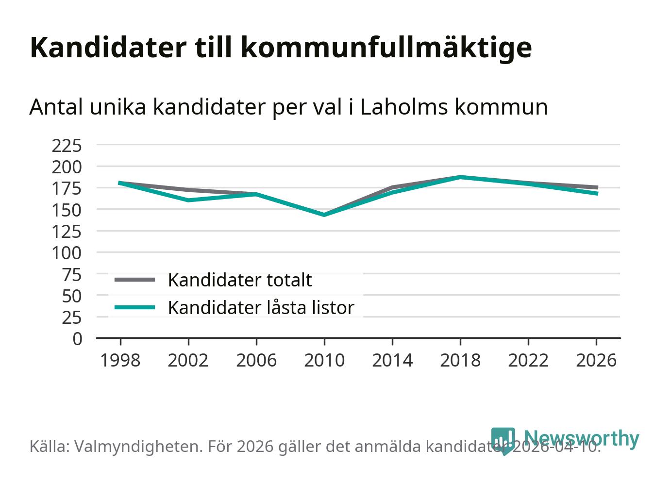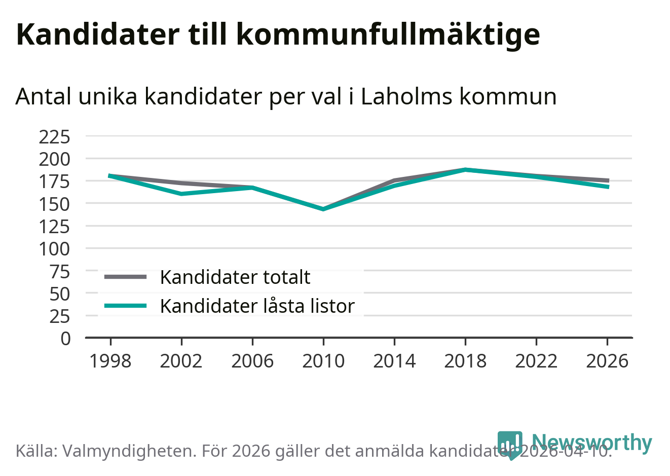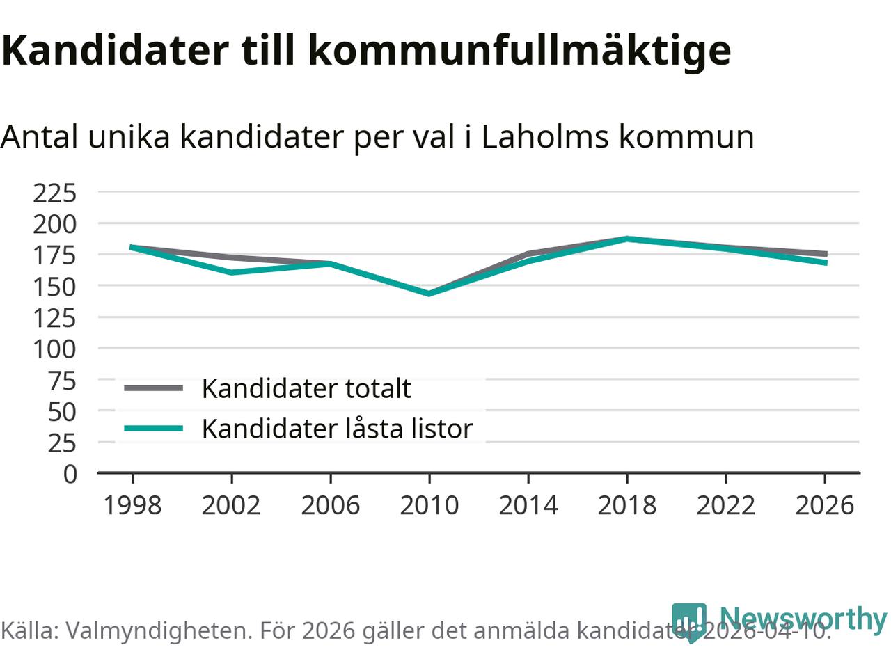På torsdagen var det deadline för partier med låsta listor att registrera sina kandidater inför höstens val. Till valet till kommunfullmäktige i Laholm är 168 kandidater anmälda på sådana listor, vilket är elva färre än i valet 2022.