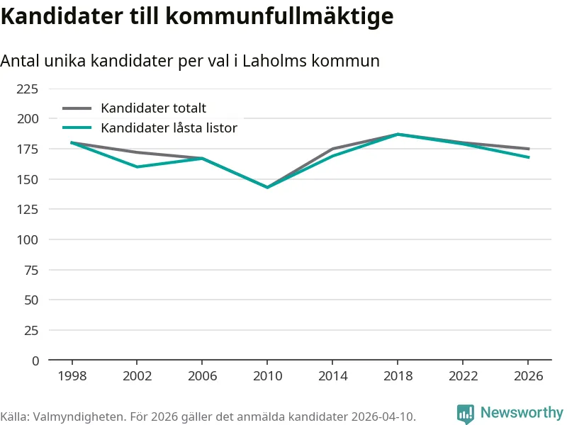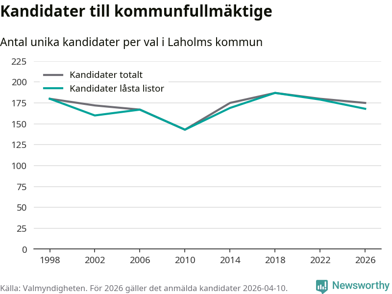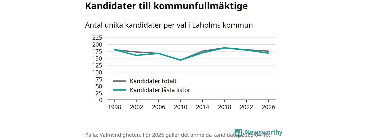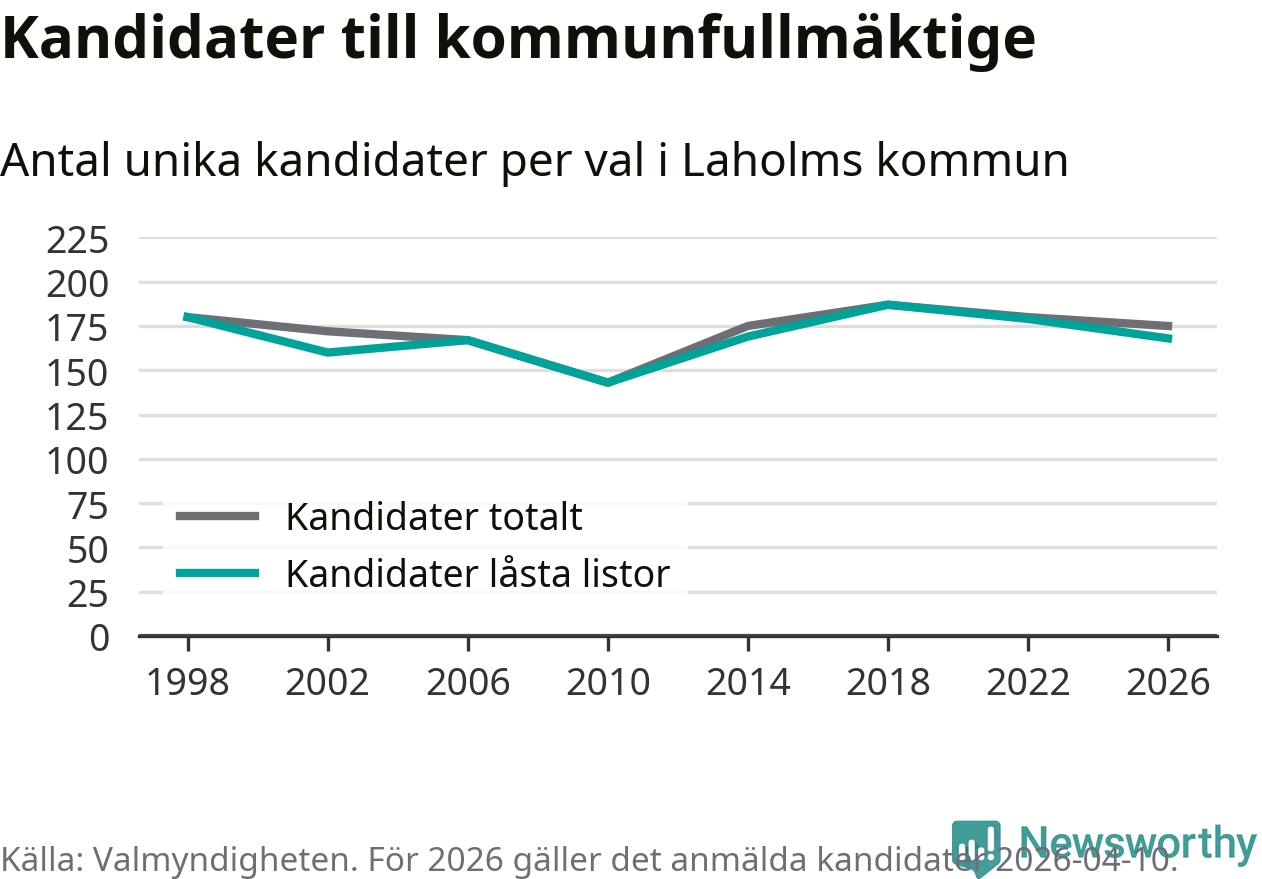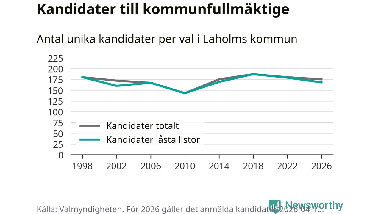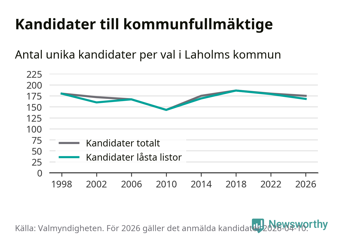 På torsdagen var det deadline för partier med låsta listor att registrera sina kandidater inför höstens val. Till valet till kommunfullmäktige i Laholm är 168 kandidater anmälda på sådana listor, vilket är elva färre än i valet 2022.