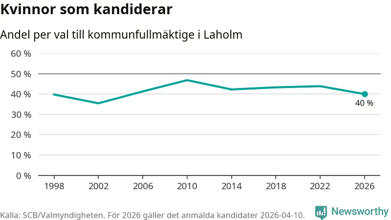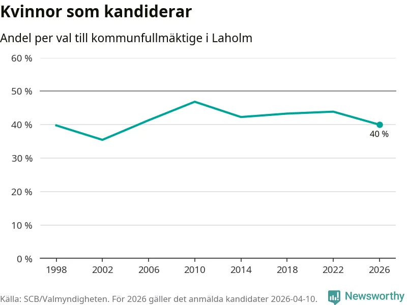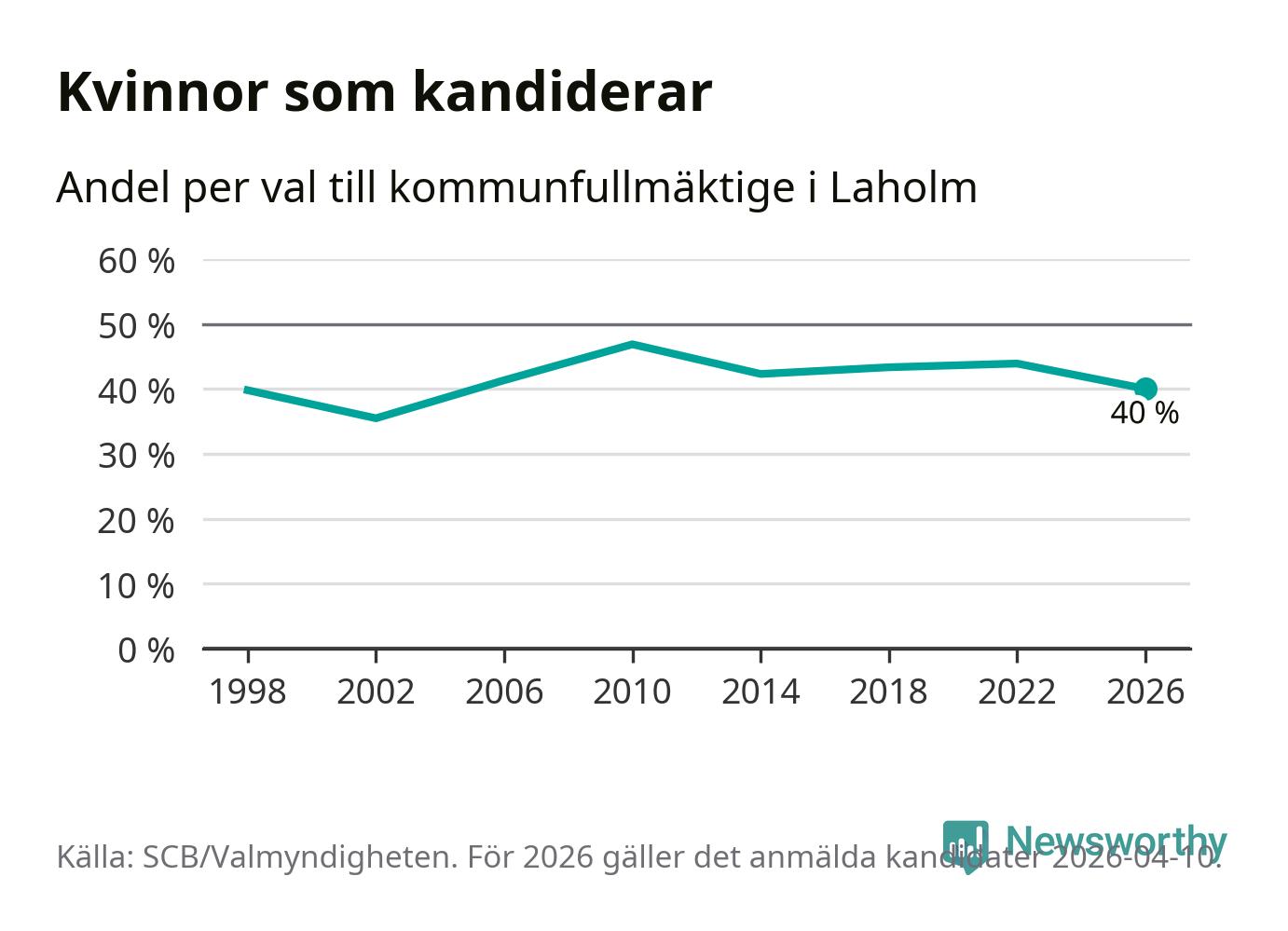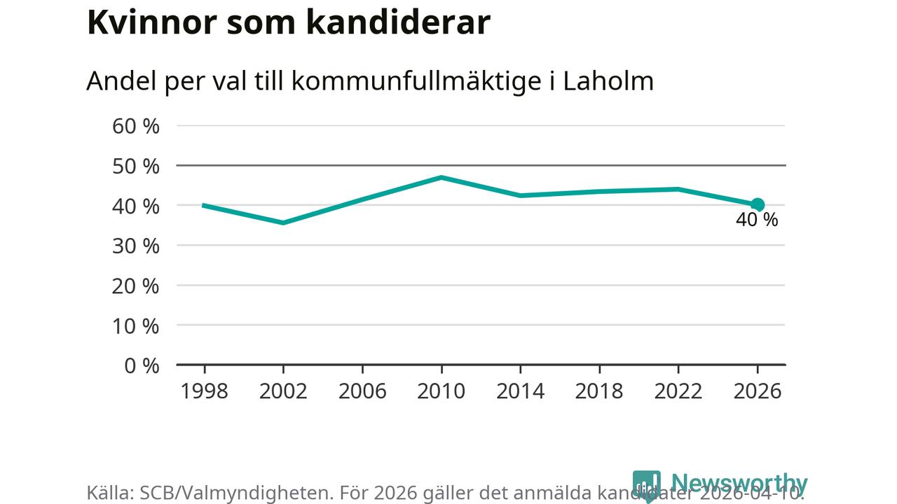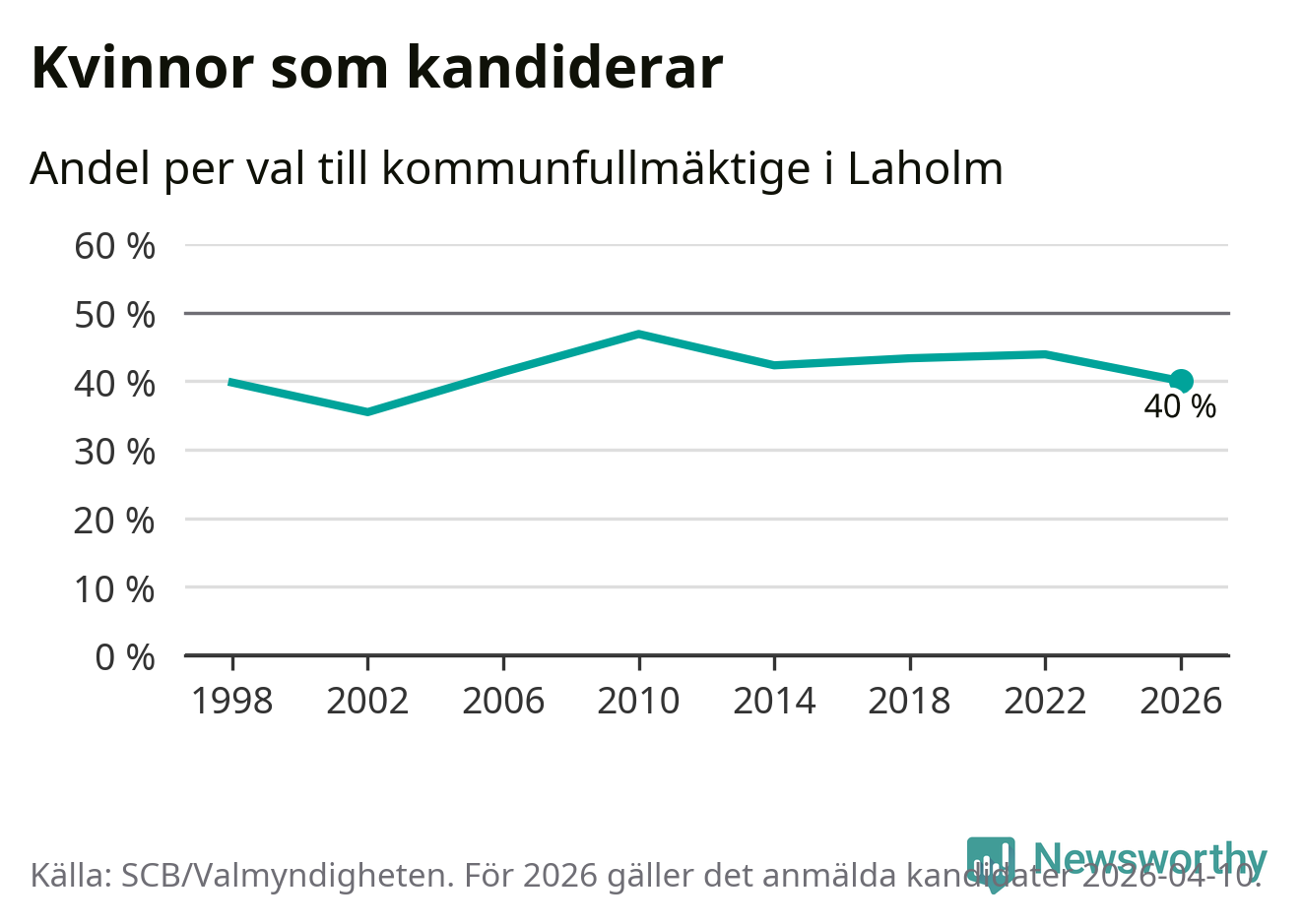 Kvinnorna utgör 40 procent av de hittills anmälda kandidaterna, vilket är den lägsta andelen på listorna till kommunfullmäktige i Laholm sedan valet 2002. Vid valet 2010 var 47 procent kvinnor, valet 2002 var motsvarande siffra 35 procent. Laholm är en av 264 kommuner i landet där männen utgör en majoritet av kandidaterna på listorna.