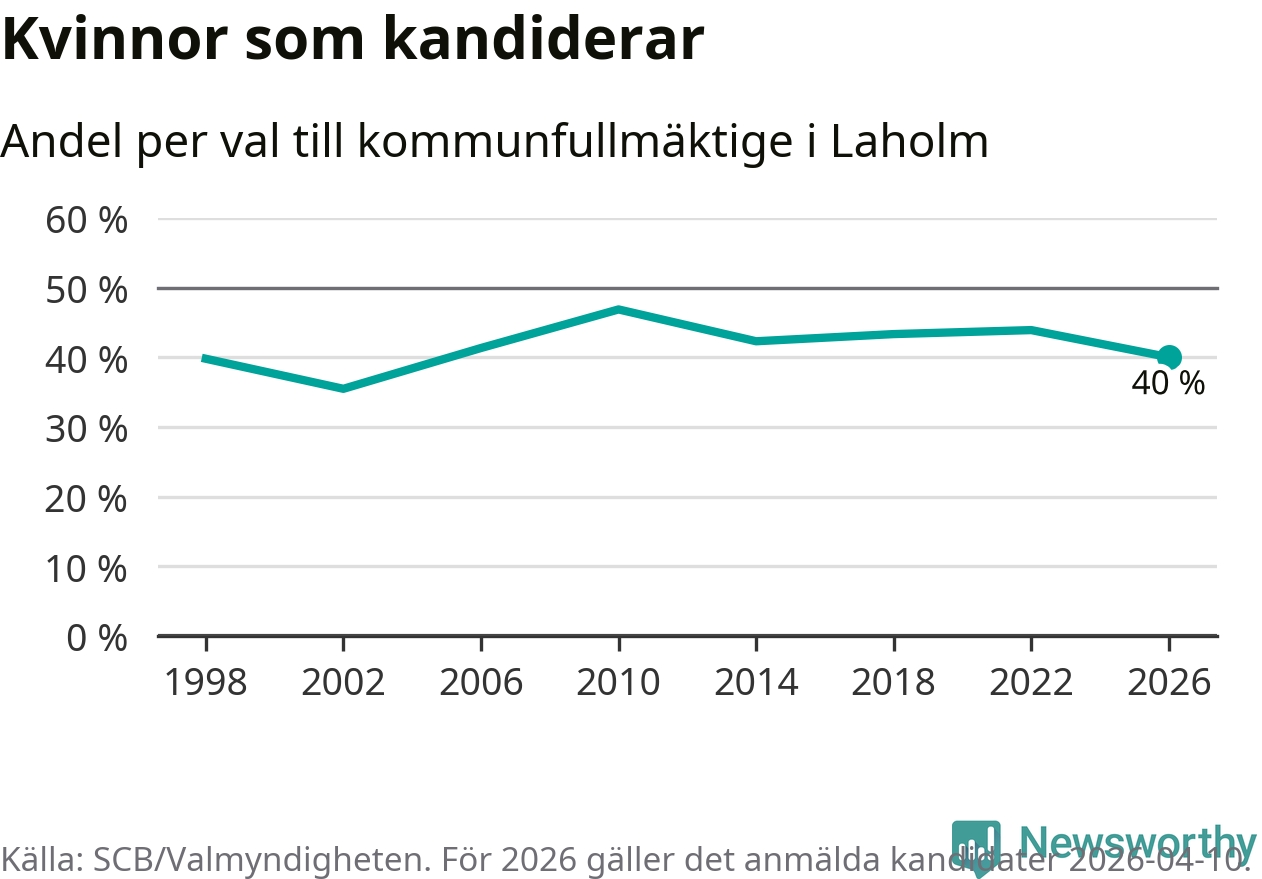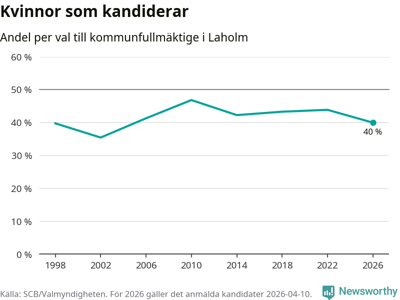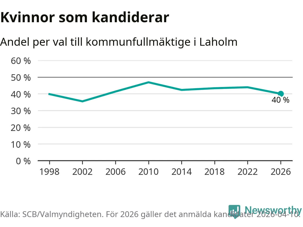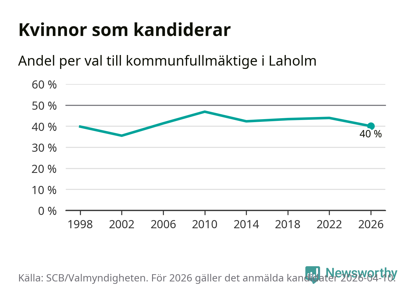 Kvinnorna utgör 40 procent av de hittills anmälda kandidaterna, vilket är den lägsta andelen på listorna till kommunfullmäktige i Laholm sedan valet 2002. Vid valet 2010 var 47 procent kvinnor, valet 2002 var motsvarande siffra 35 procent. Laholm är en av 264 kommuner i landet där männen utgör en majoritet av kandidaterna på listorna.