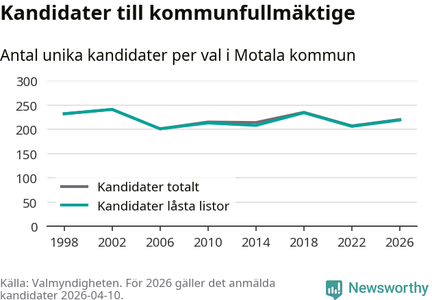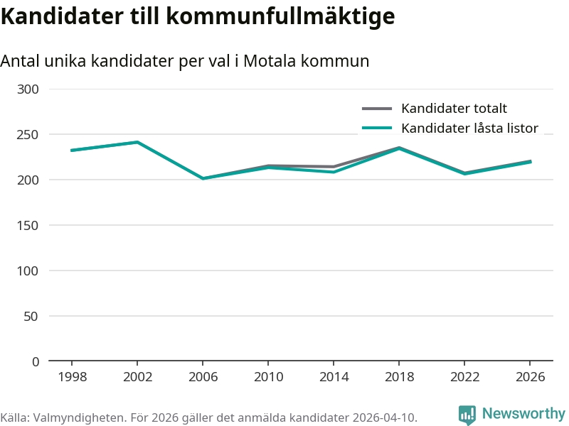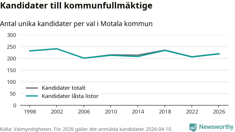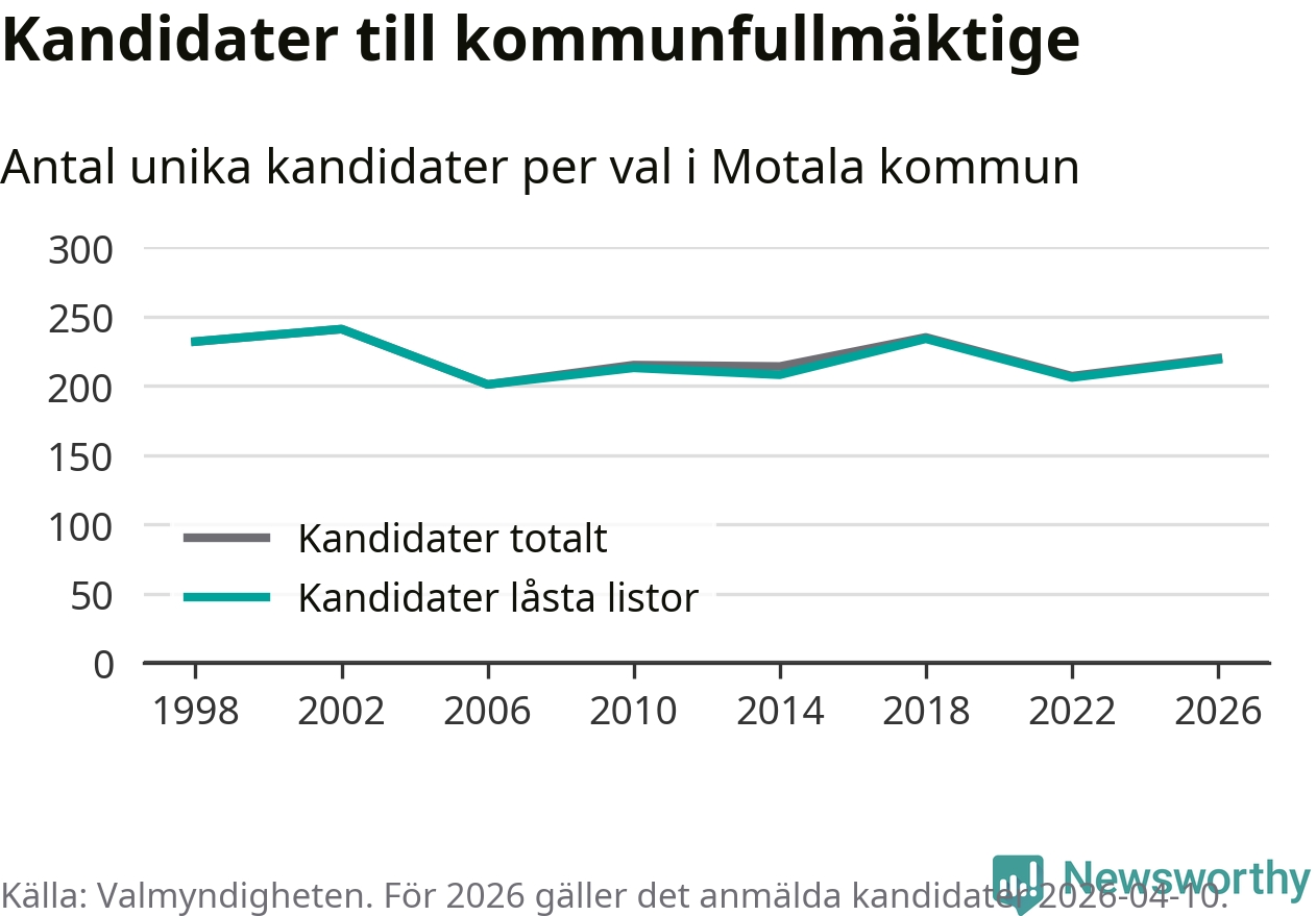 Att listan är låst innebär att partiet redan har anmält sina kandidater och bestämt ordningen på listan och att väljare inte kan lägga till egna kandidater. På öppna listor kan kandidater läggas till fram till dagarna före valet och vem som helst kan anmäla sig som kandidat. De senaste valen har drygt nio av tio kandidater anmälts på låsta listor. I valet till kommunfullmäktige i Motala 2022 fanns i princip alla kandidater på låsta listor. Hittills i år finns en kandidat på öppna listor. Totalt rör det sig alltså om 220 kandidater till höstens val.