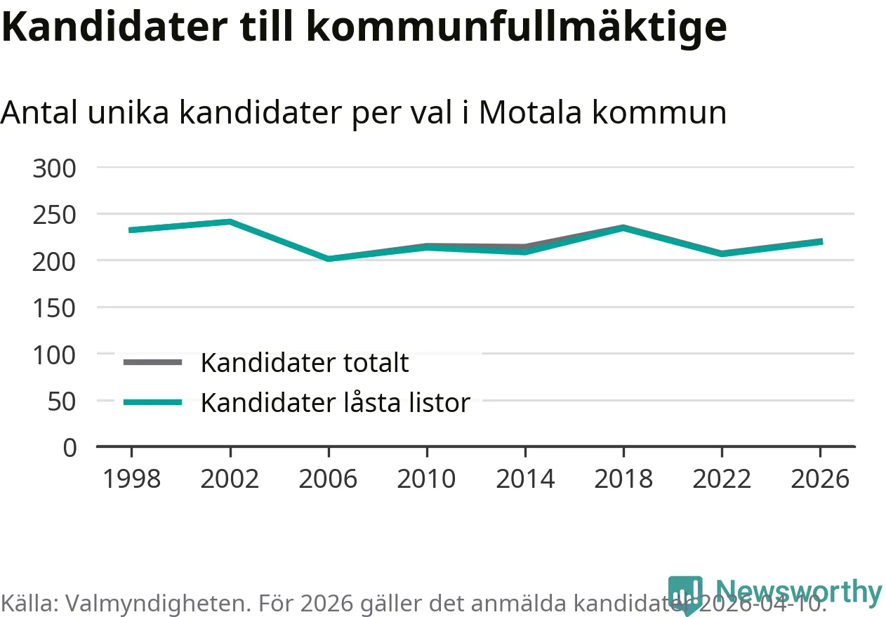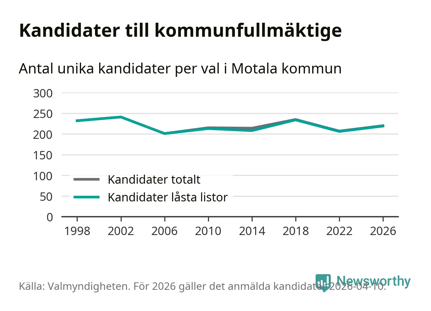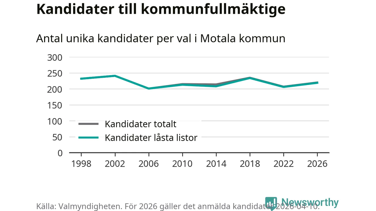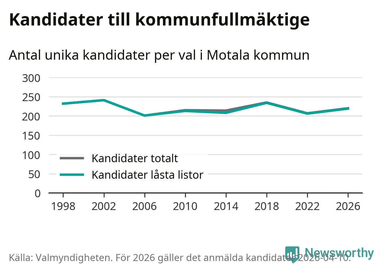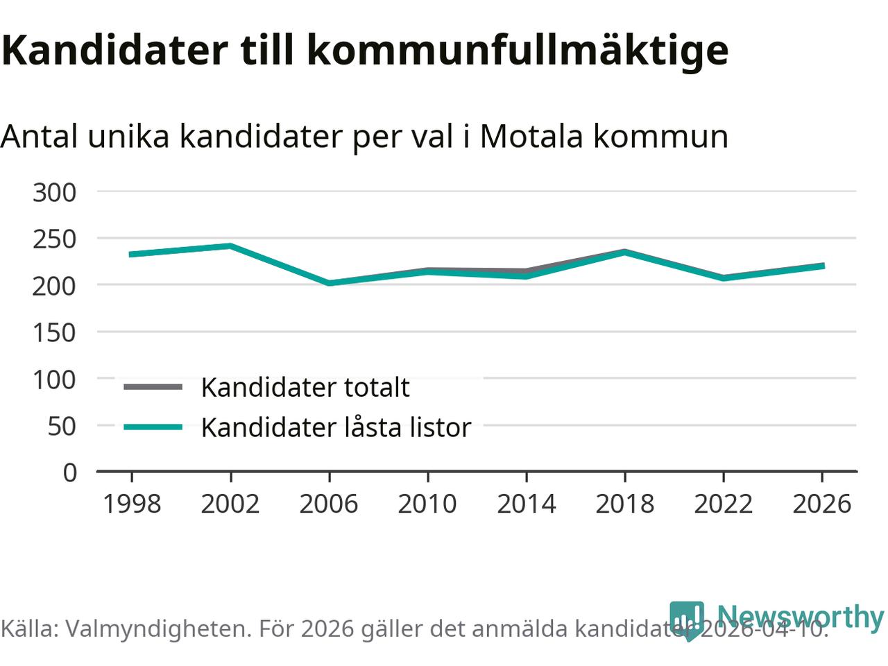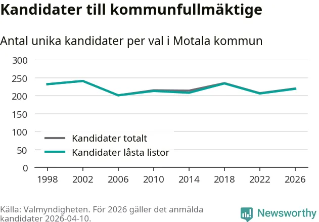 På torsdagen var det deadline för partier med låsta listor att registrera sina kandidater inför höstens val. Till valet till kommunfullmäktige i Motala är 219 kandidater anmälda på sådana listor, vilket är 13 fler än i valet 2022.