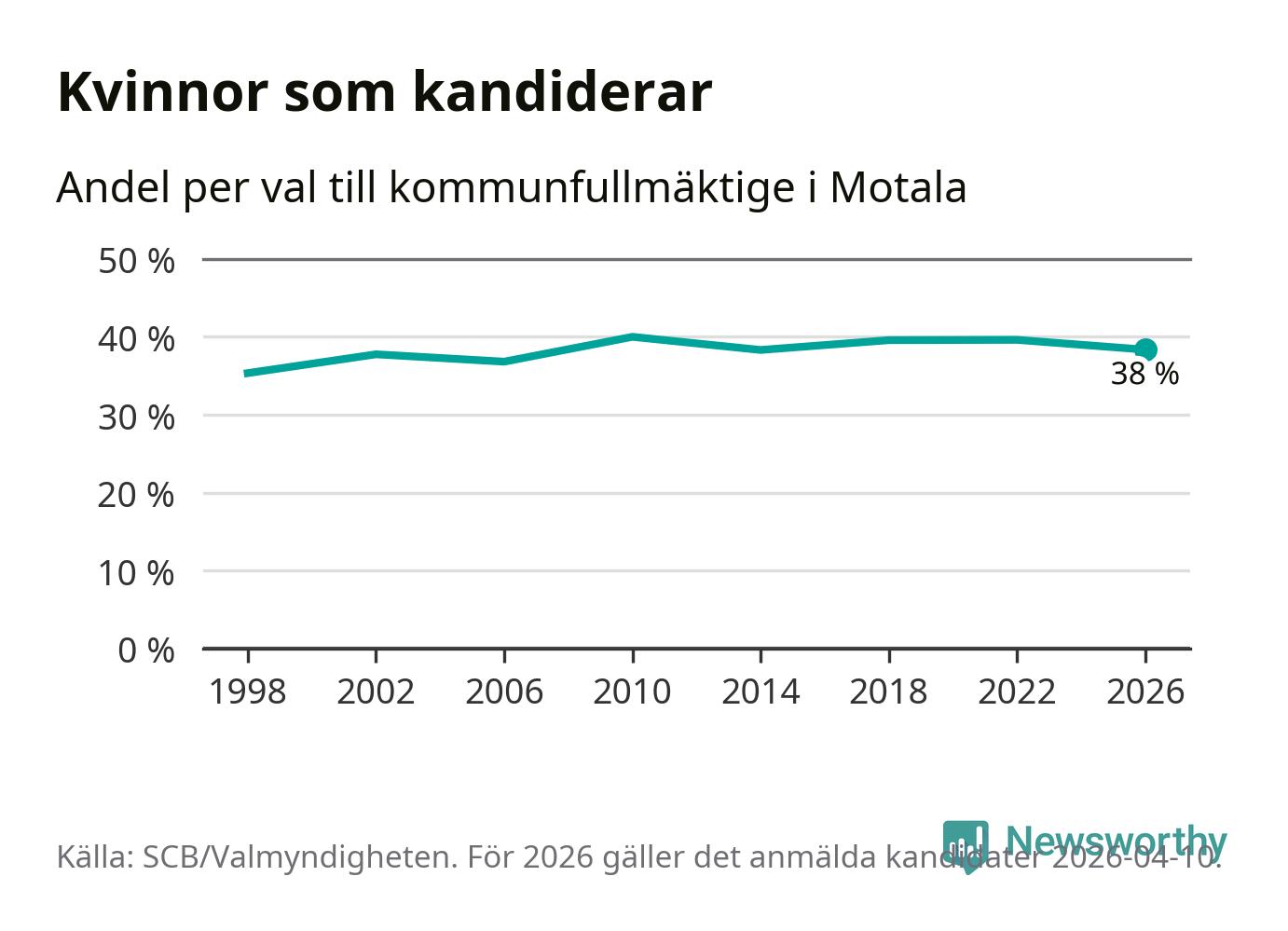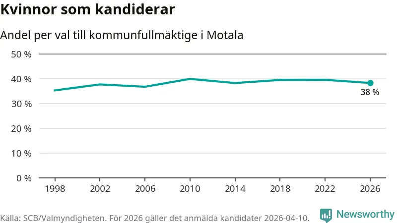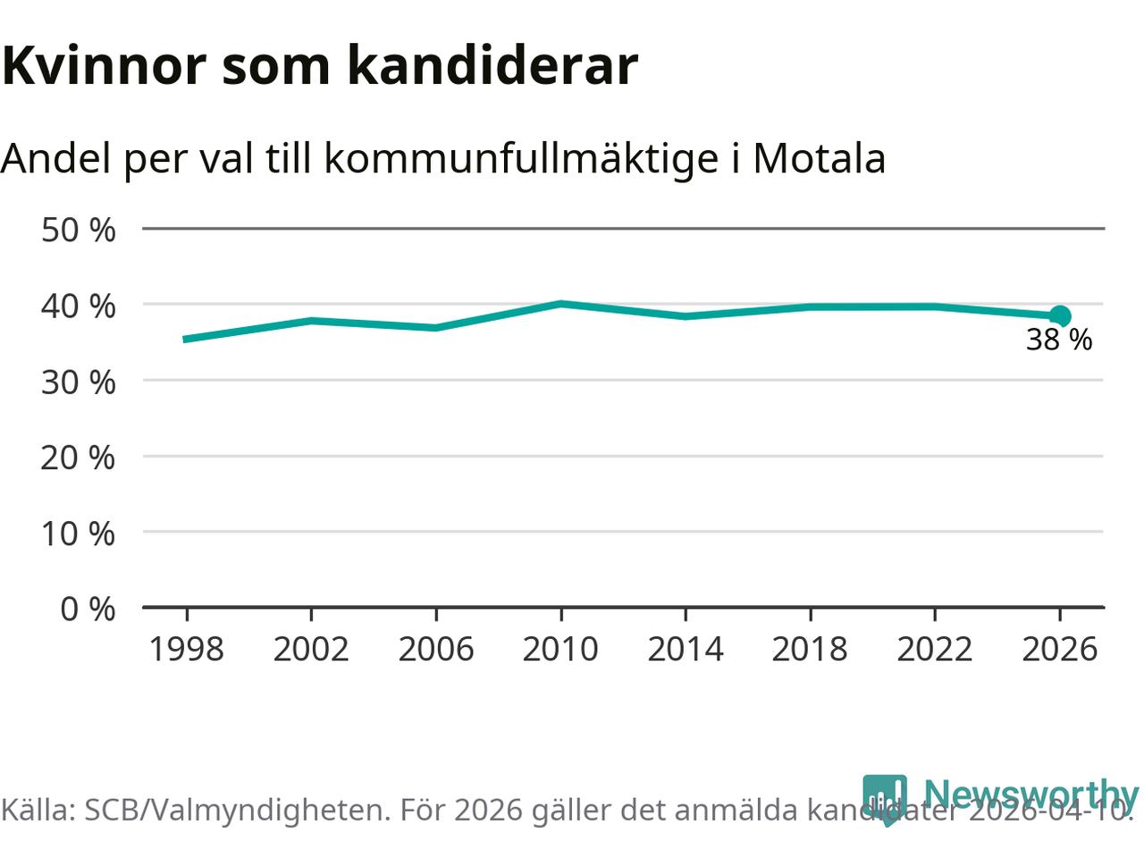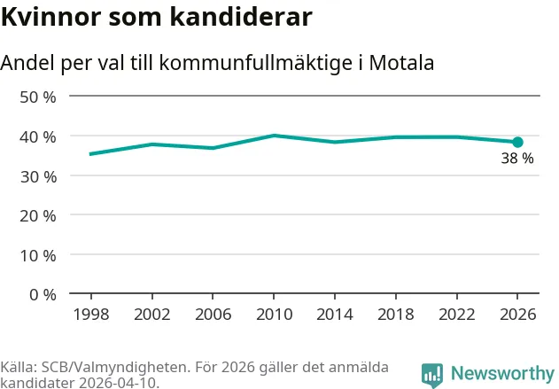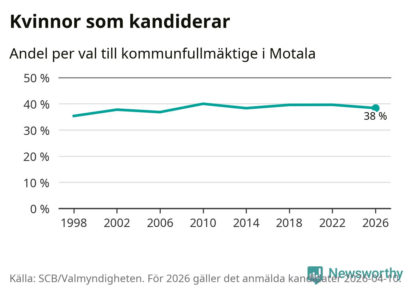 Kvinnorna utgör 38 procent av de hittills anmälda kandidaterna, vilket är den lägsta andelen på listorna till kommunfullmäktige i Motala sedan valet 2014. Vid valet 2010 var 40 procent kvinnor, valet 1998 var motsvarande siffra 35 procent. Motala är en av 264 kommuner i landet där männen utgör en majoritet av kandidaterna på listorna.