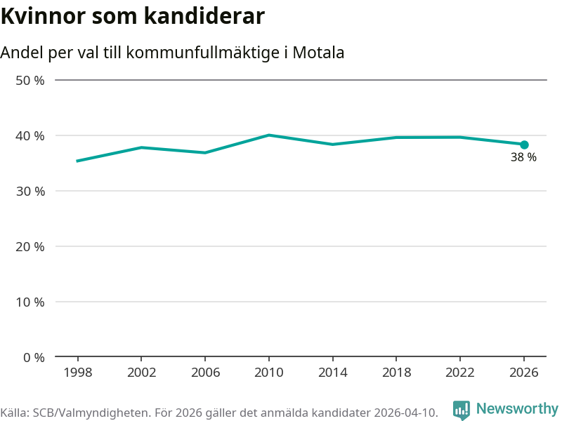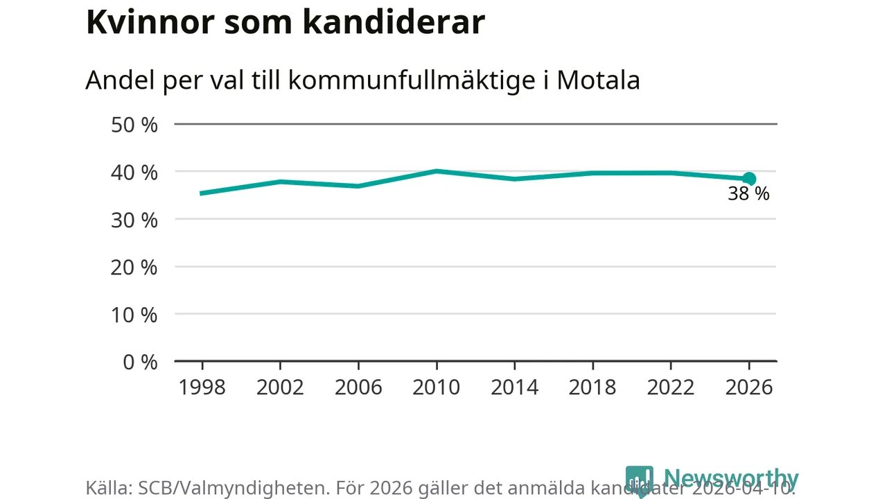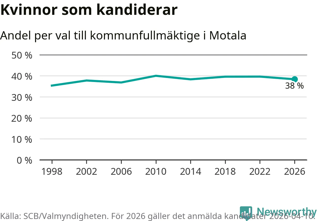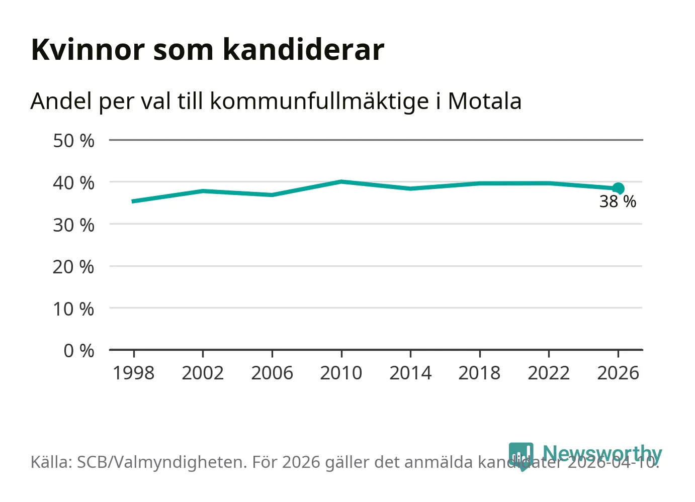 Kvinnorna utgör 38 procent av de hittills anmälda kandidaterna, vilket är den lägsta andelen på listorna till kommunfullmäktige i Motala sedan valet 2014. Vid valet 2010 var 40 procent kvinnor, valet 1998 var motsvarande siffra 35 procent. Motala är en av 264 kommuner i landet där männen utgör en majoritet av kandidaterna på listorna.