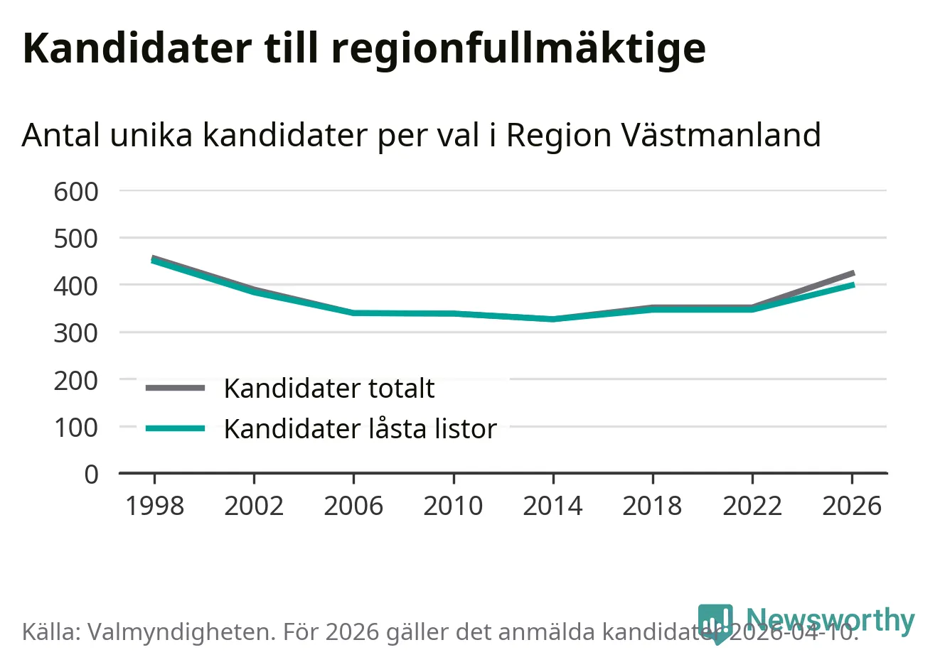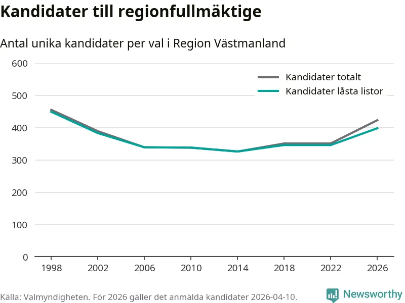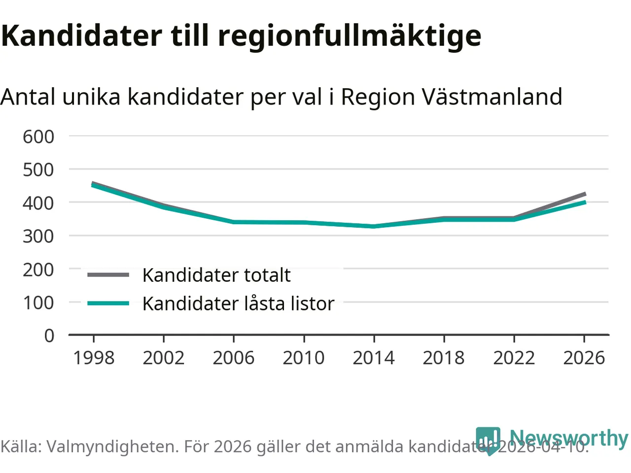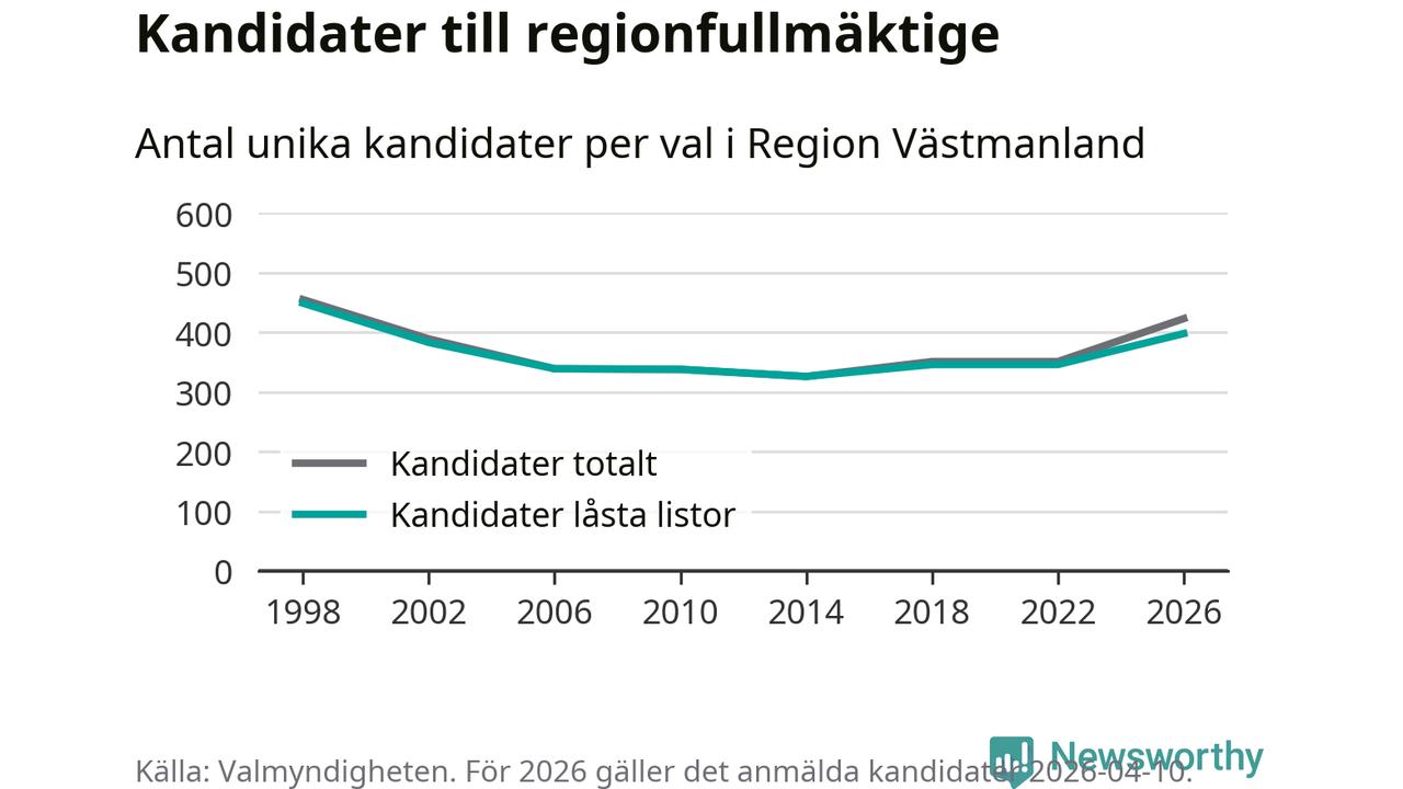 På torsdagen var det deadline för partier med låsta listor att registrera sina kandidater inför höstens val. Till valet till regionfullmäktige i Region Västmanland är 398 kandidater anmälda på sådana listor, vilket är 52 fler än i valet 2022.