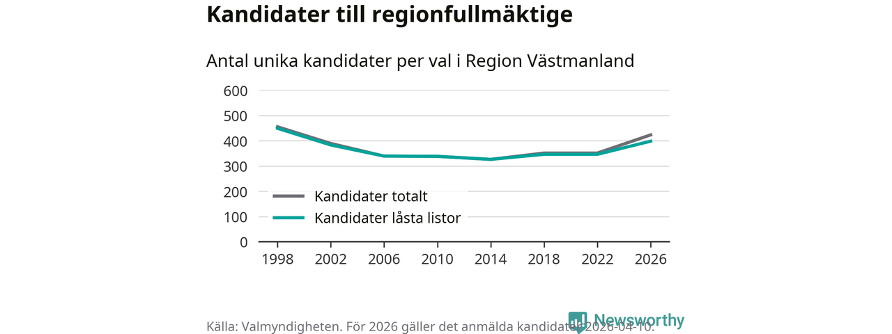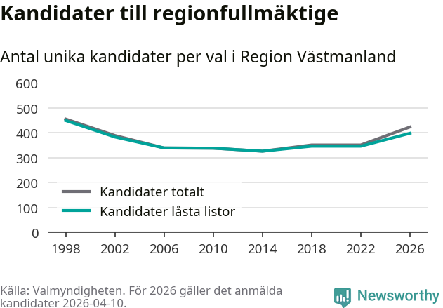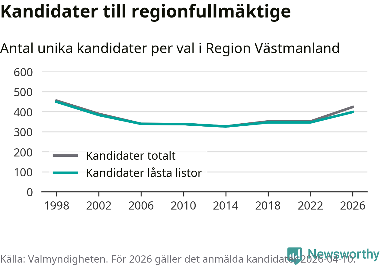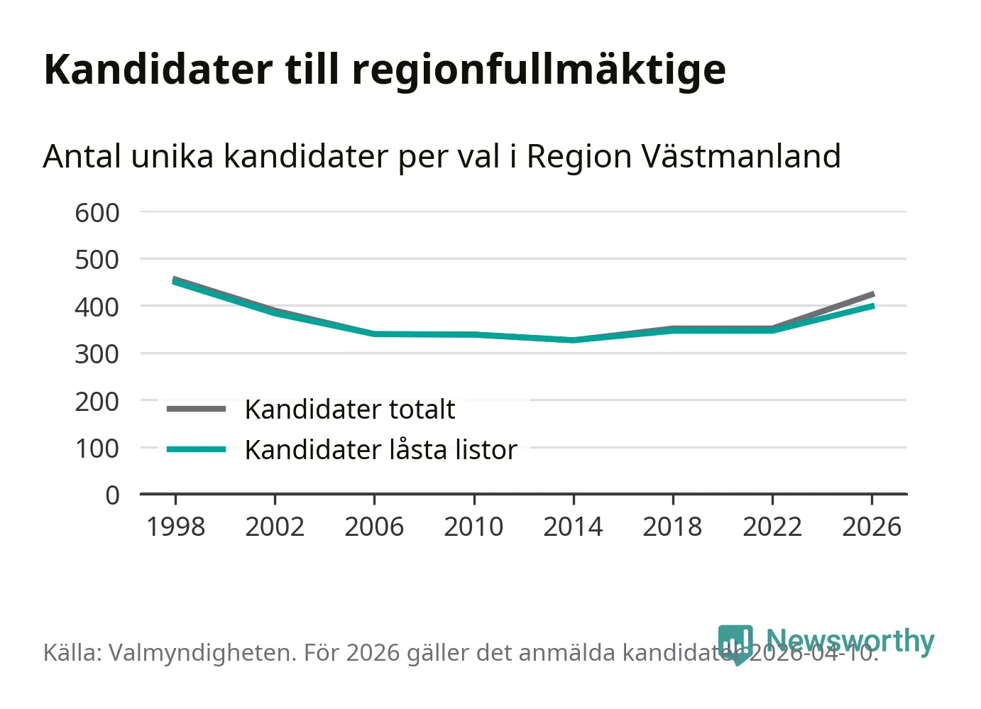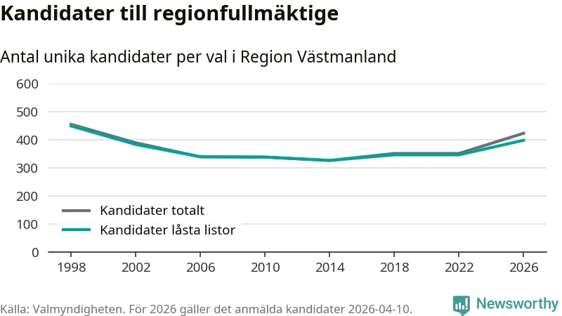 På torsdagen var det deadline för partier med låsta listor att registrera sina kandidater inför höstens val. Till valet till regionfullmäktige i Region Västmanland är 398 kandidater anmälda på sådana listor, vilket är 52 fler än i valet 2022.