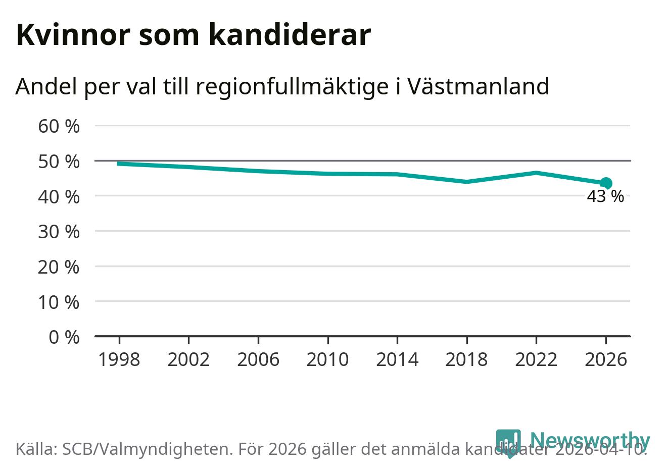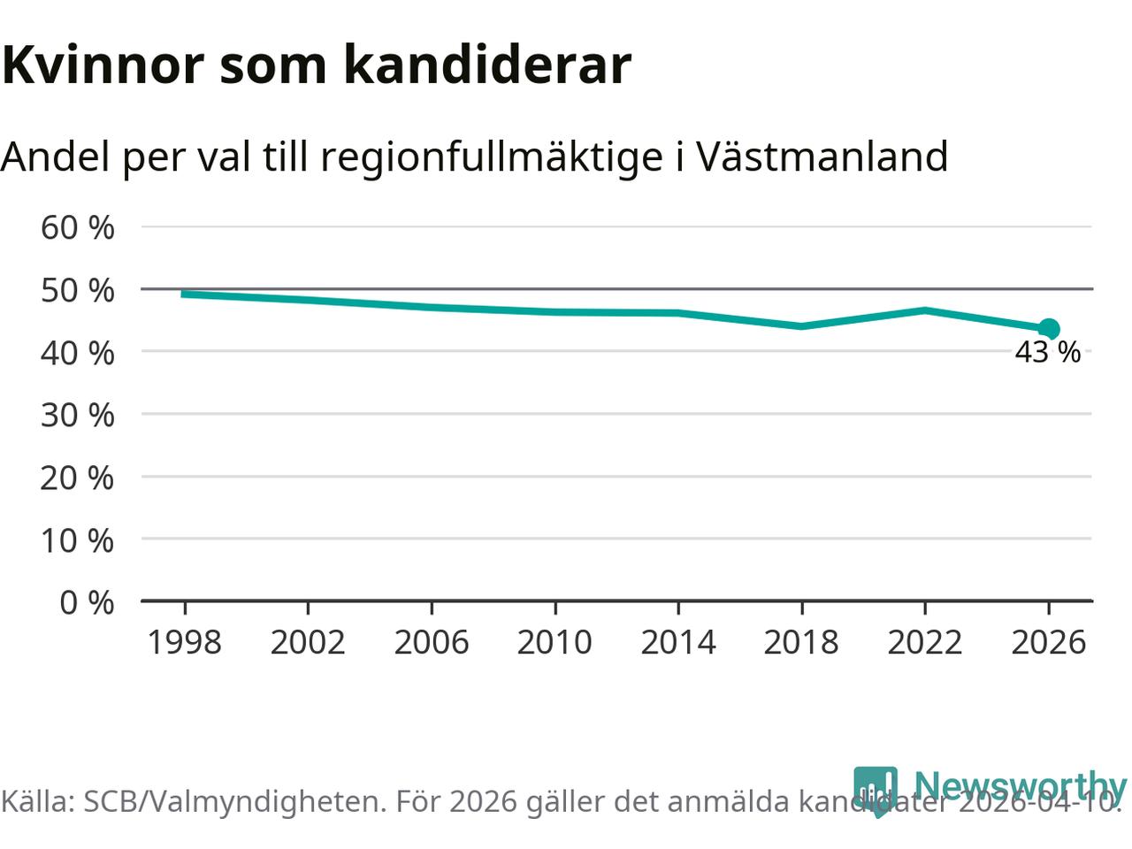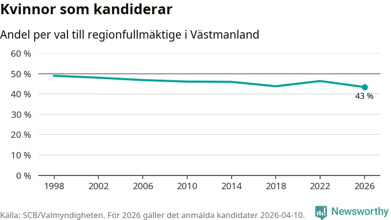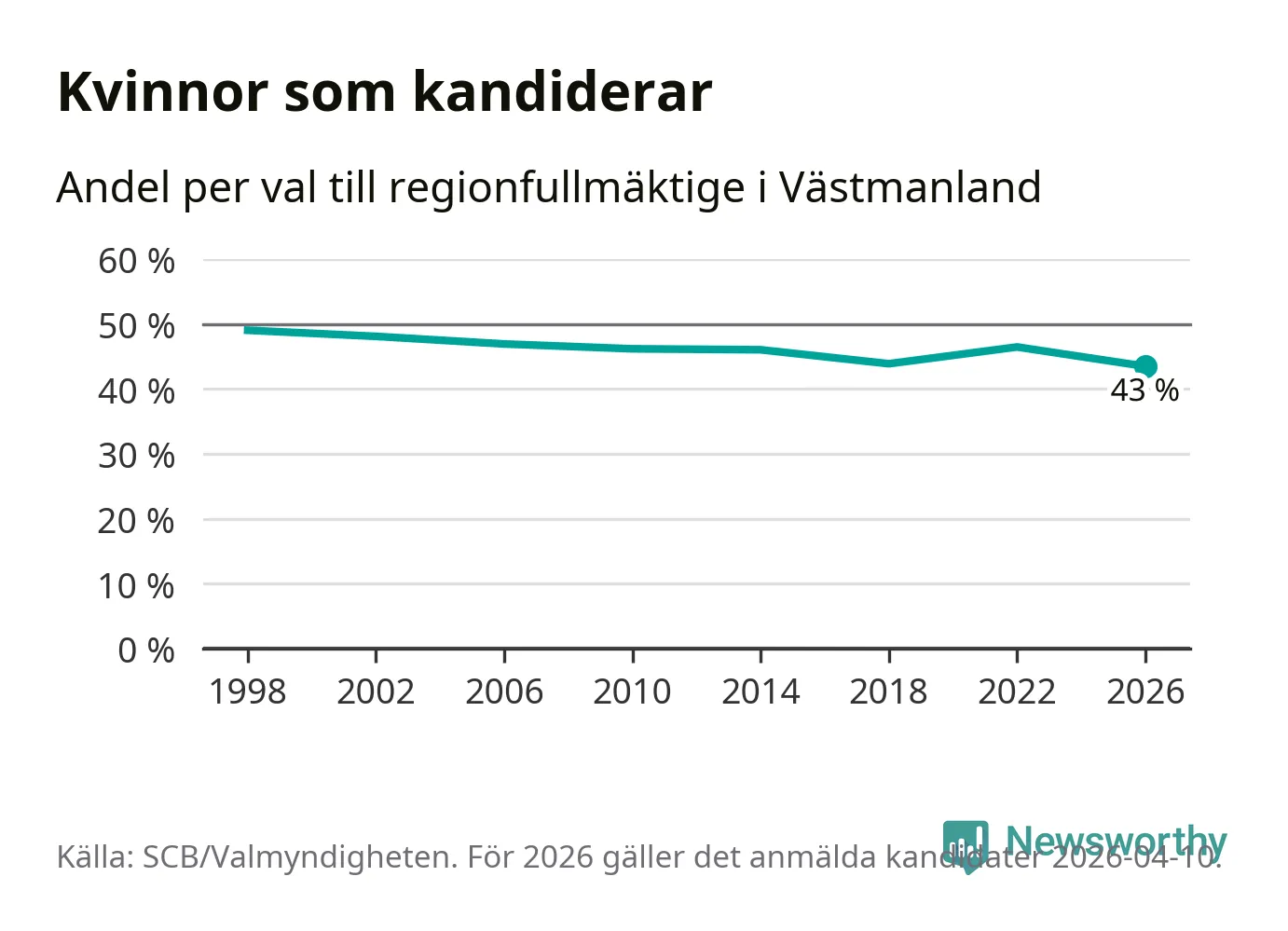 Kvinnorna utgör 43 procent av de hittills anmälda kandidaterna, vilket är den lägsta andelen på listorna till regionfullmäktige i Region Västmanland sedan åtminstone valet 1998. Västmanland är en av 20 regioner i landet där männen utgör en majoritet av kandidaterna på listorna.