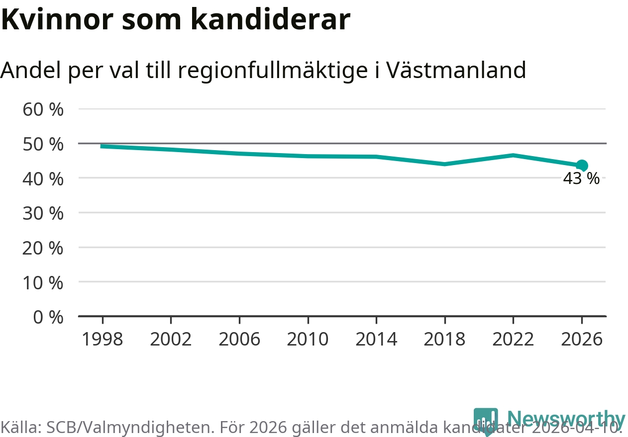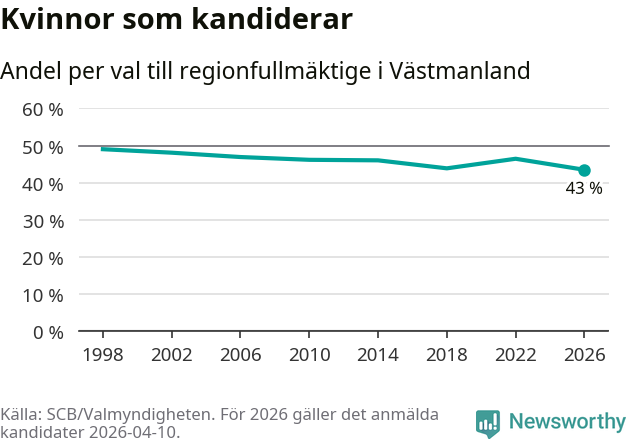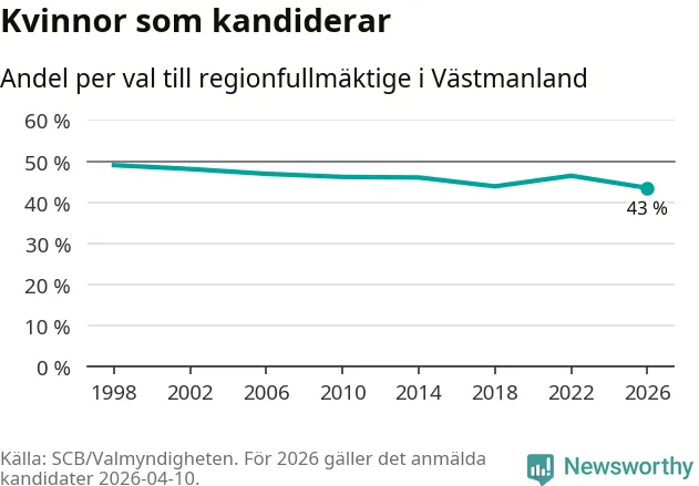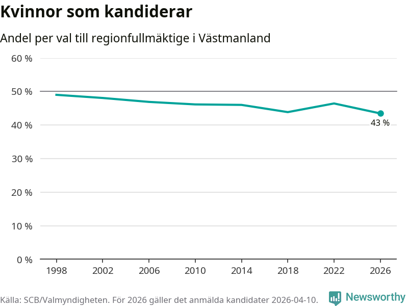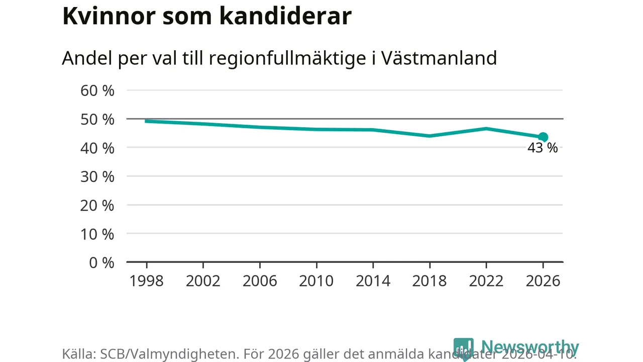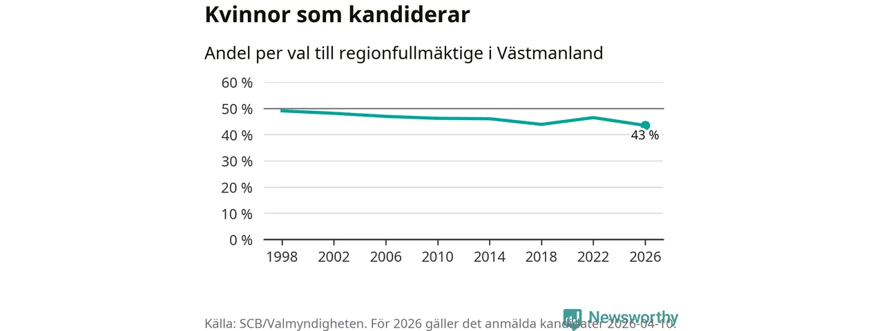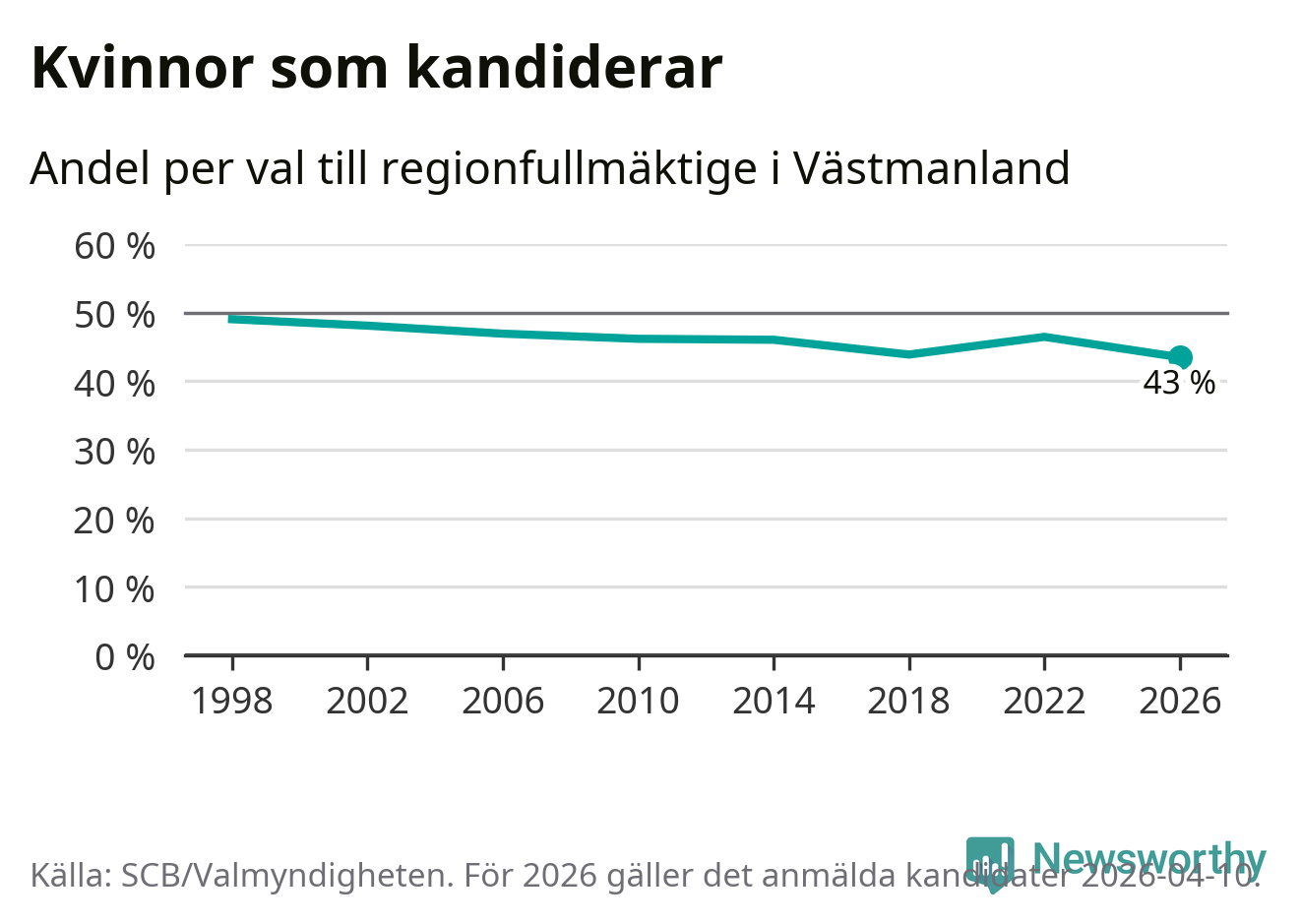 Kvinnorna utgör 43 procent av de hittills anmälda kandidaterna, vilket är den lägsta andelen på listorna till regionfullmäktige i Region Västmanland sedan åtminstone valet 1998. Västmanland är en av 20 regioner i landet där männen utgör en majoritet av kandidaterna på listorna.