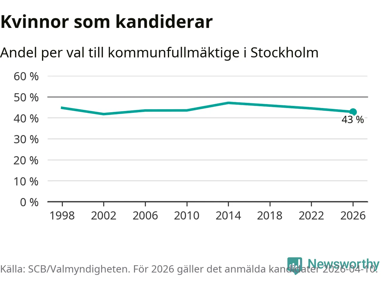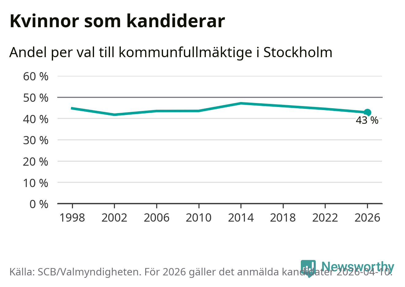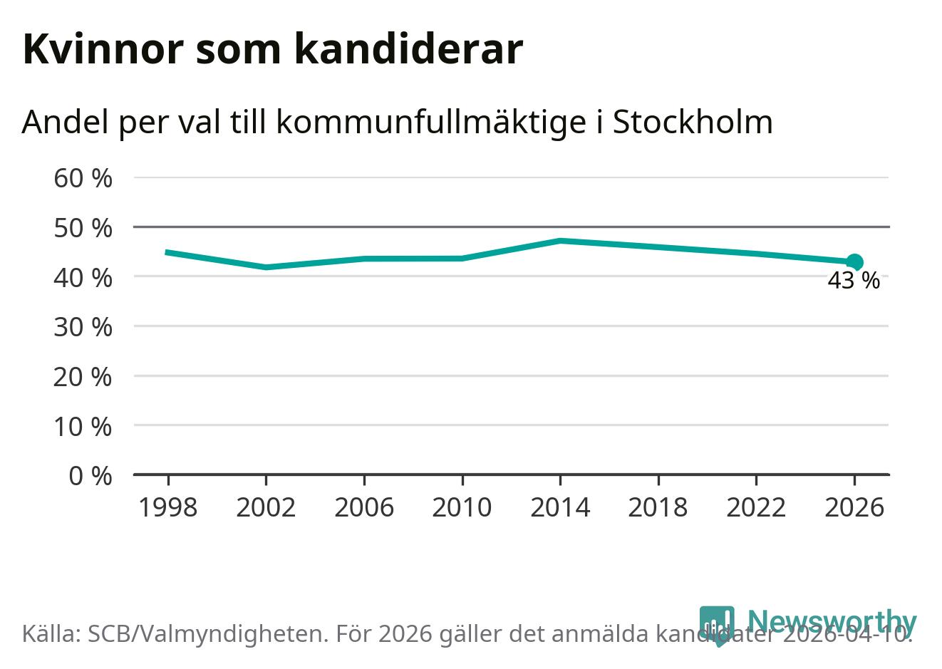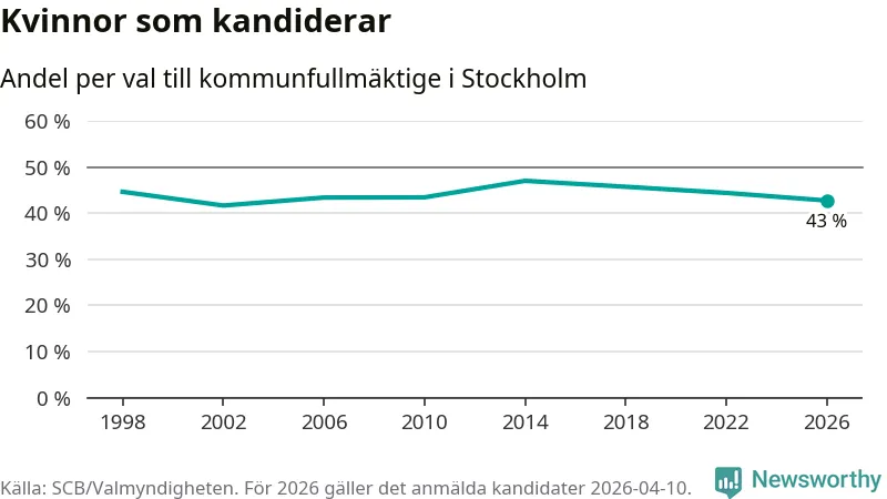 Kvinnorna utgör 43 procent av de hittills anmälda kandidaterna, vilket är den lägsta andelen på listorna till kommunfullmäktige i Stockholms kommun sedan valet 2002. Andelen kvinnor har minskat i Stockholms kommun under de senaste två valen och minskningen ser alltså ut att forsätta i år. Stockholms kommun är en av 264 kommuner i landet där männen utgör en majoritet av kandidaterna på listorna.