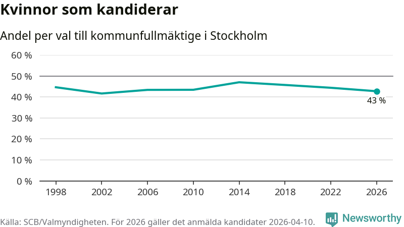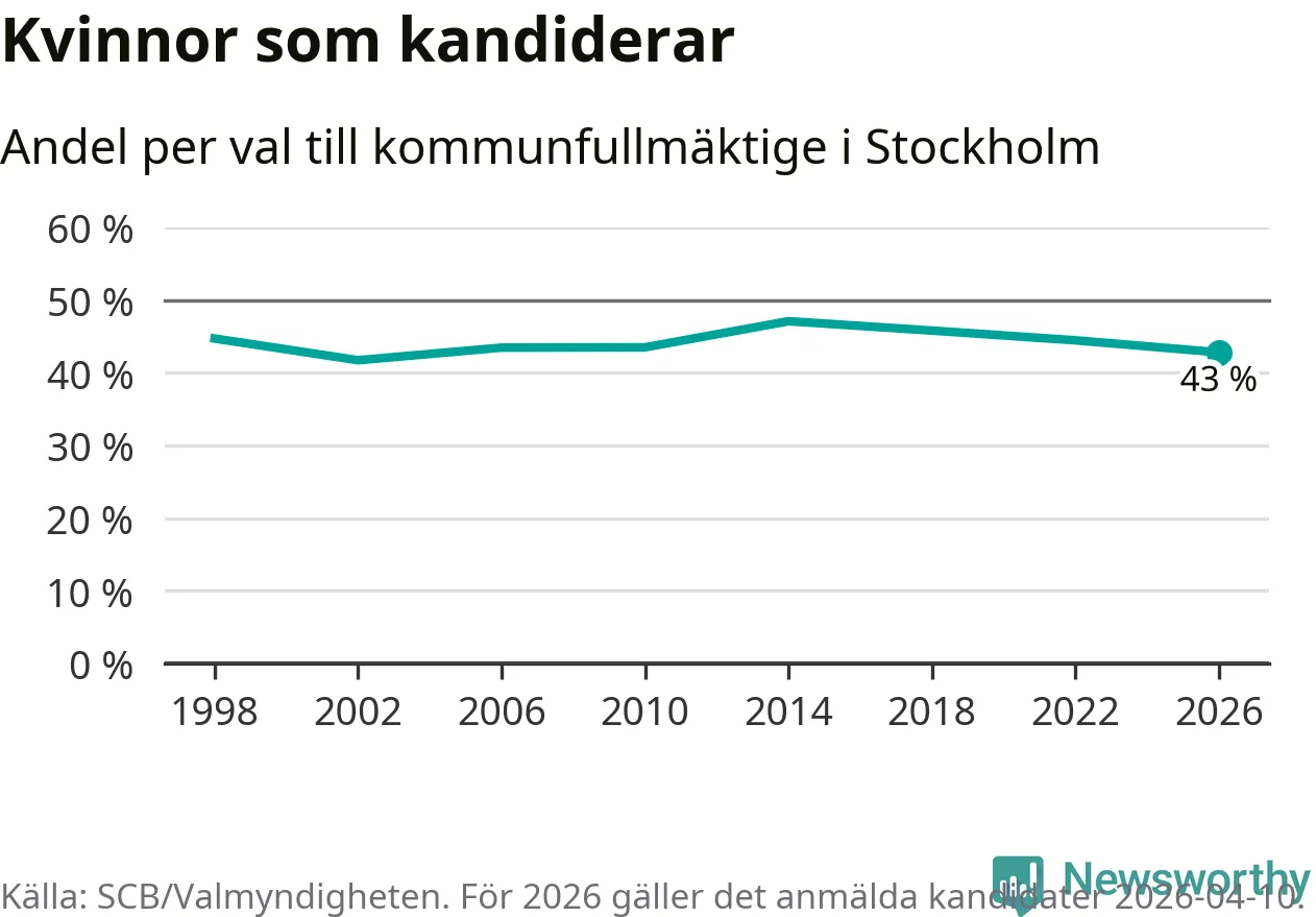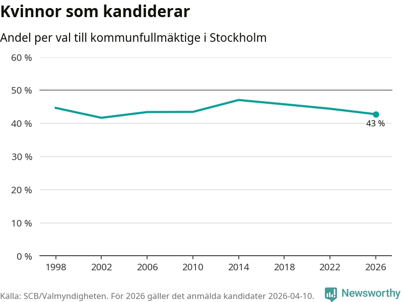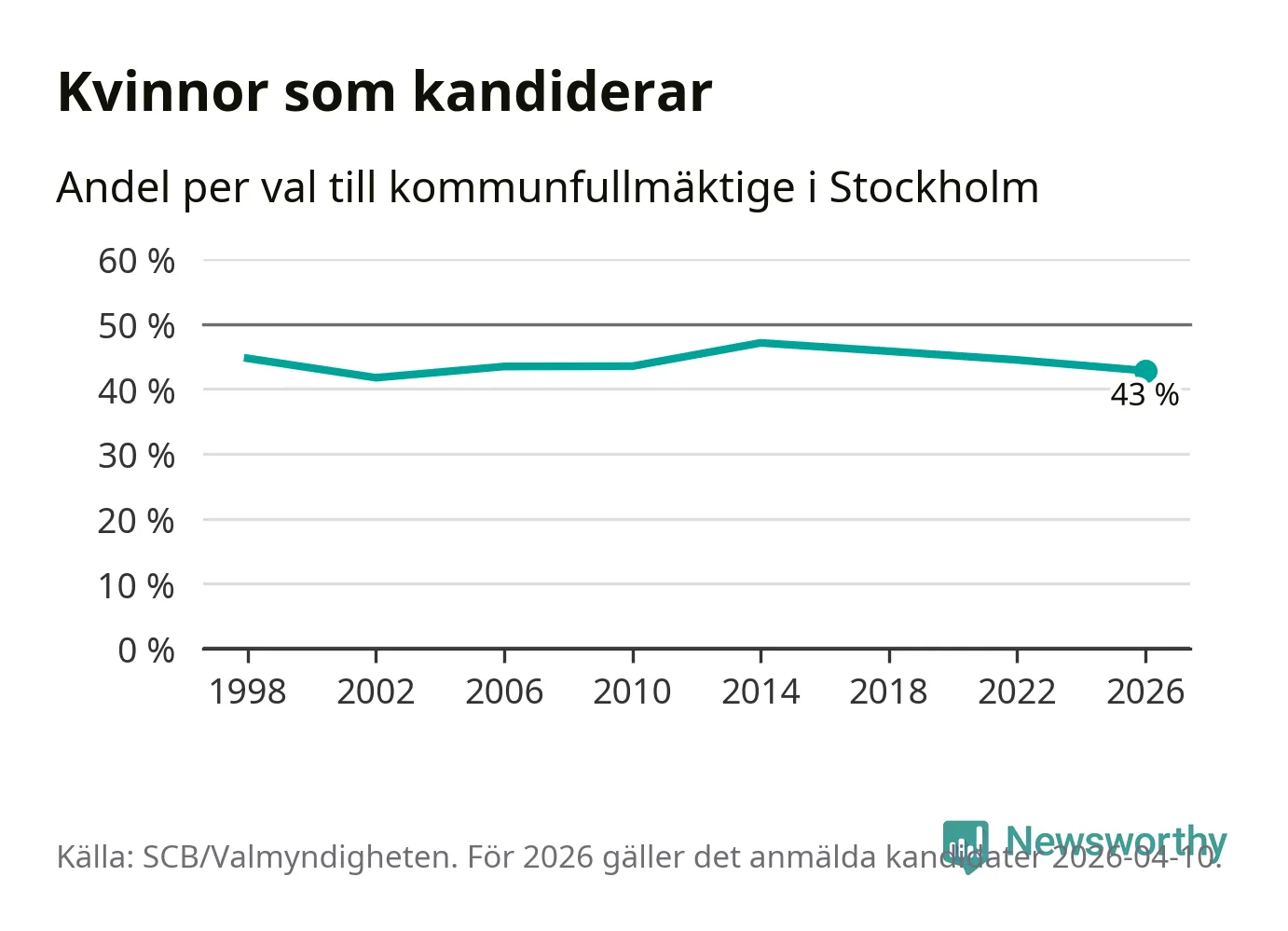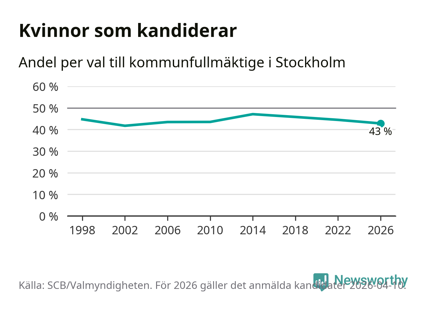 Kvinnorna utgör 43 procent av de hittills anmälda kandidaterna, vilket är den lägsta andelen på listorna till kommunfullmäktige i Stockholms kommun sedan valet 2002. Andelen kvinnor har minskat i Stockholms kommun under de senaste två valen och minskningen ser alltså ut att forsätta i år. Stockholms kommun är en av 264 kommuner i landet där männen utgör en majoritet av kandidaterna på listorna.