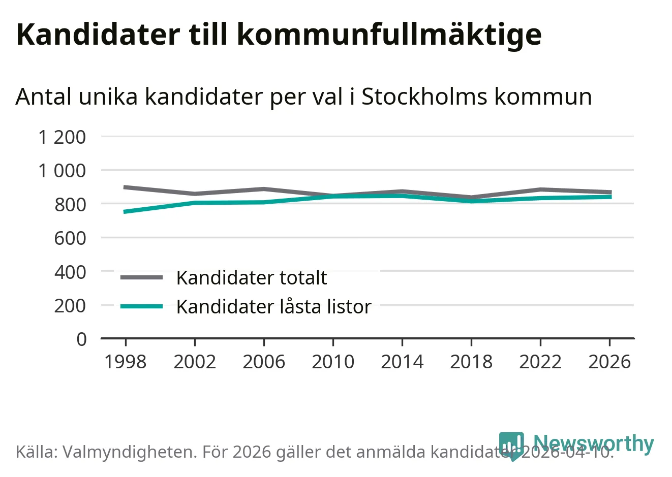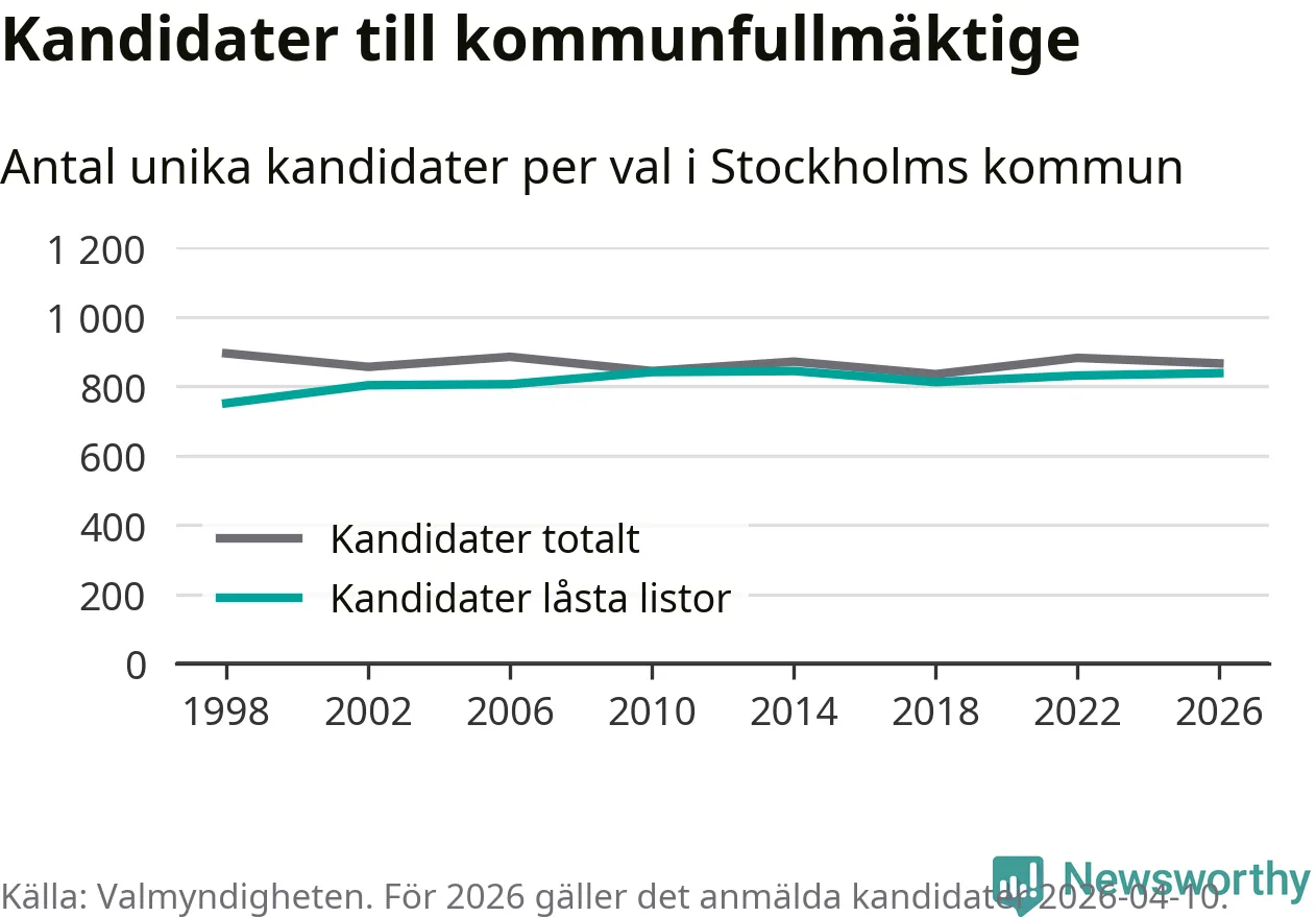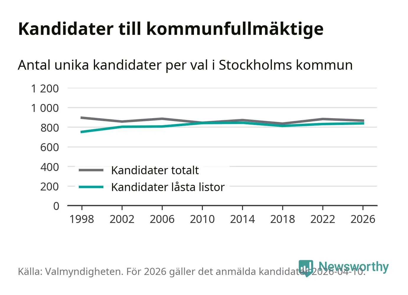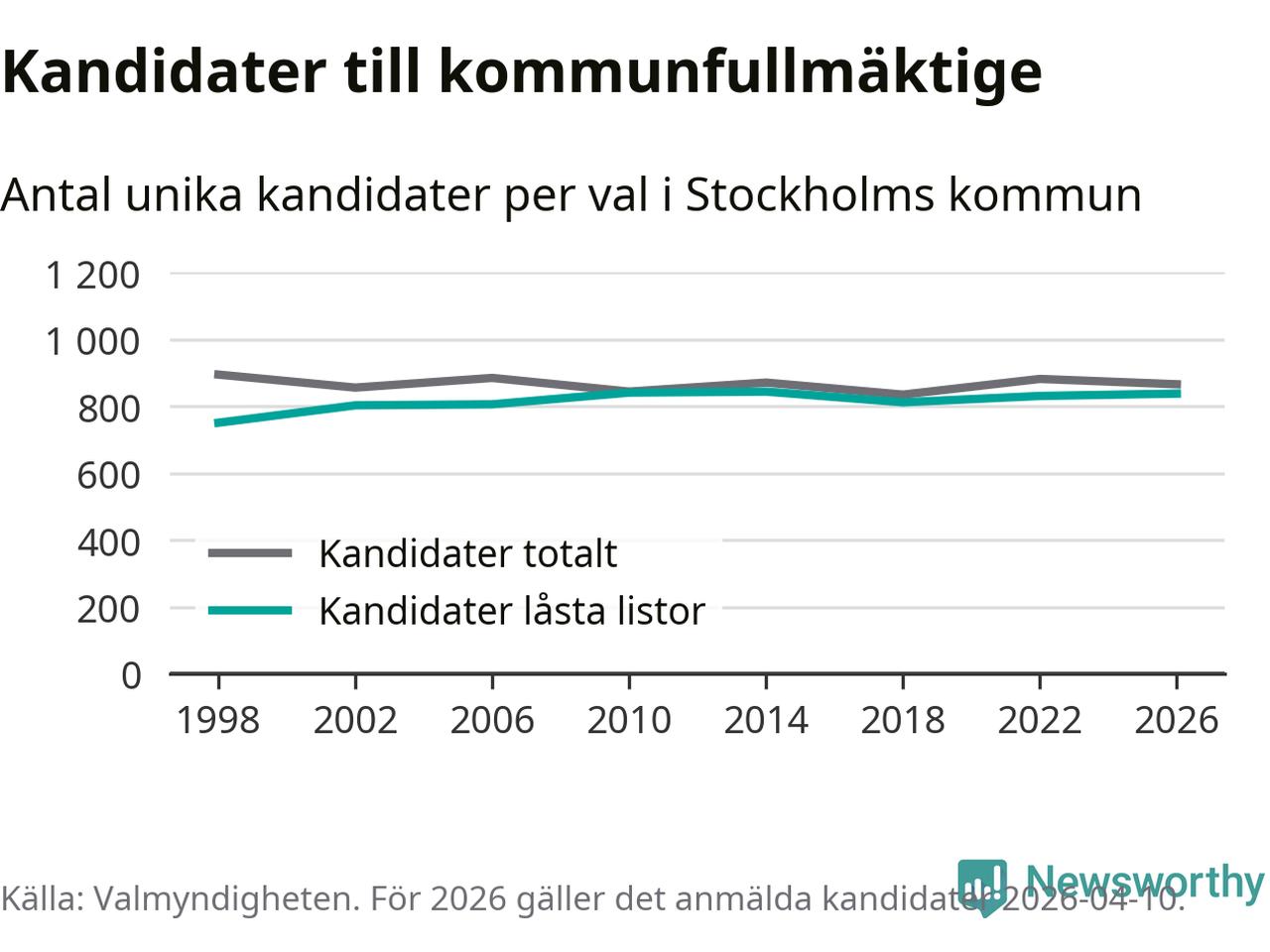 På torsdagen var det deadline för partier med låsta listor att registrera sina kandidater inför höstens val. Till valet till kommunfullmäktige i Stockholms kommun är 838 kandidater anmälda på sådana listor, vilket är sju fler än i valet 2022.
