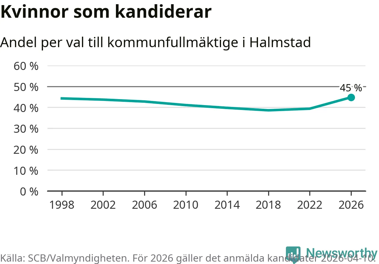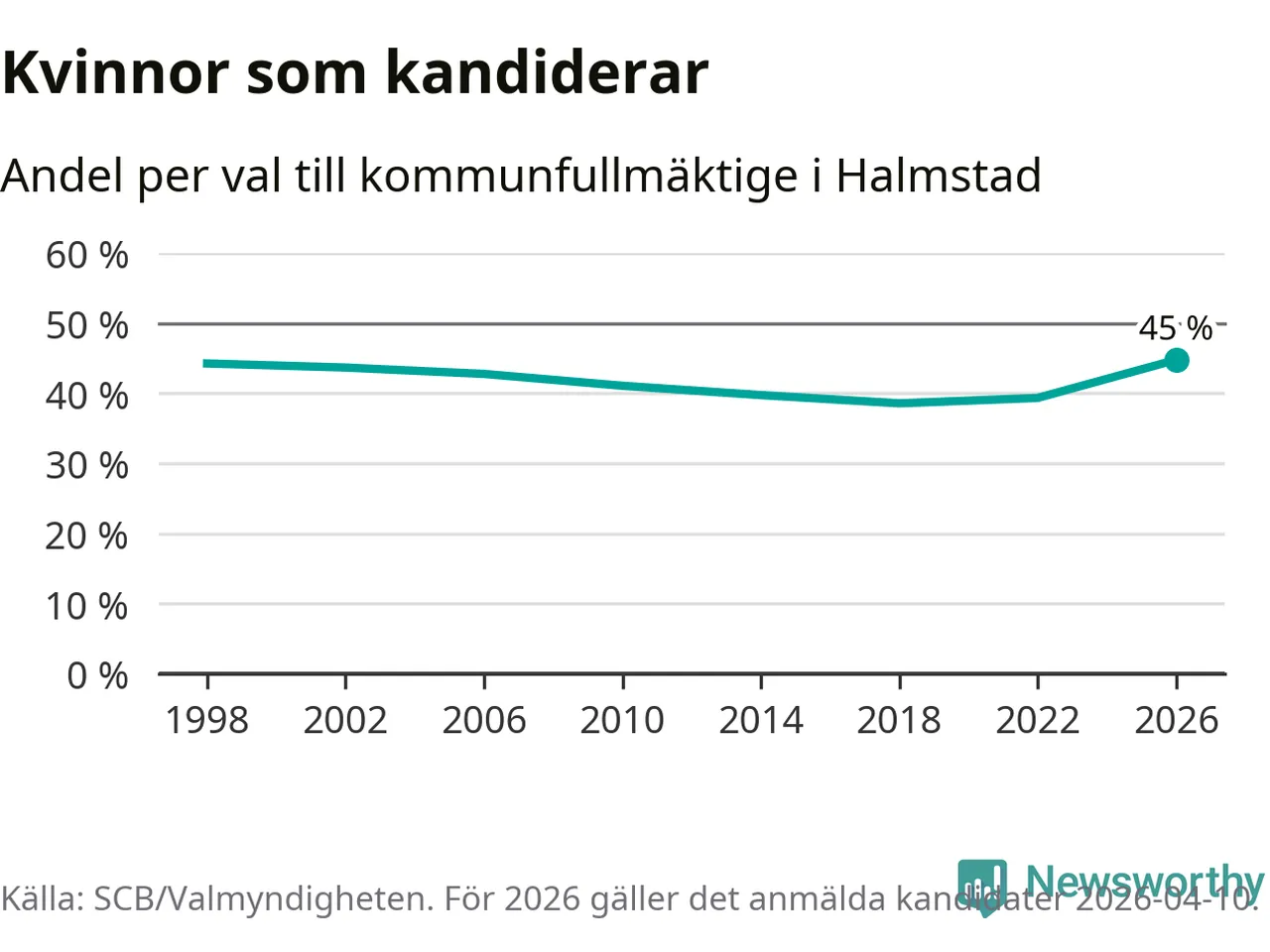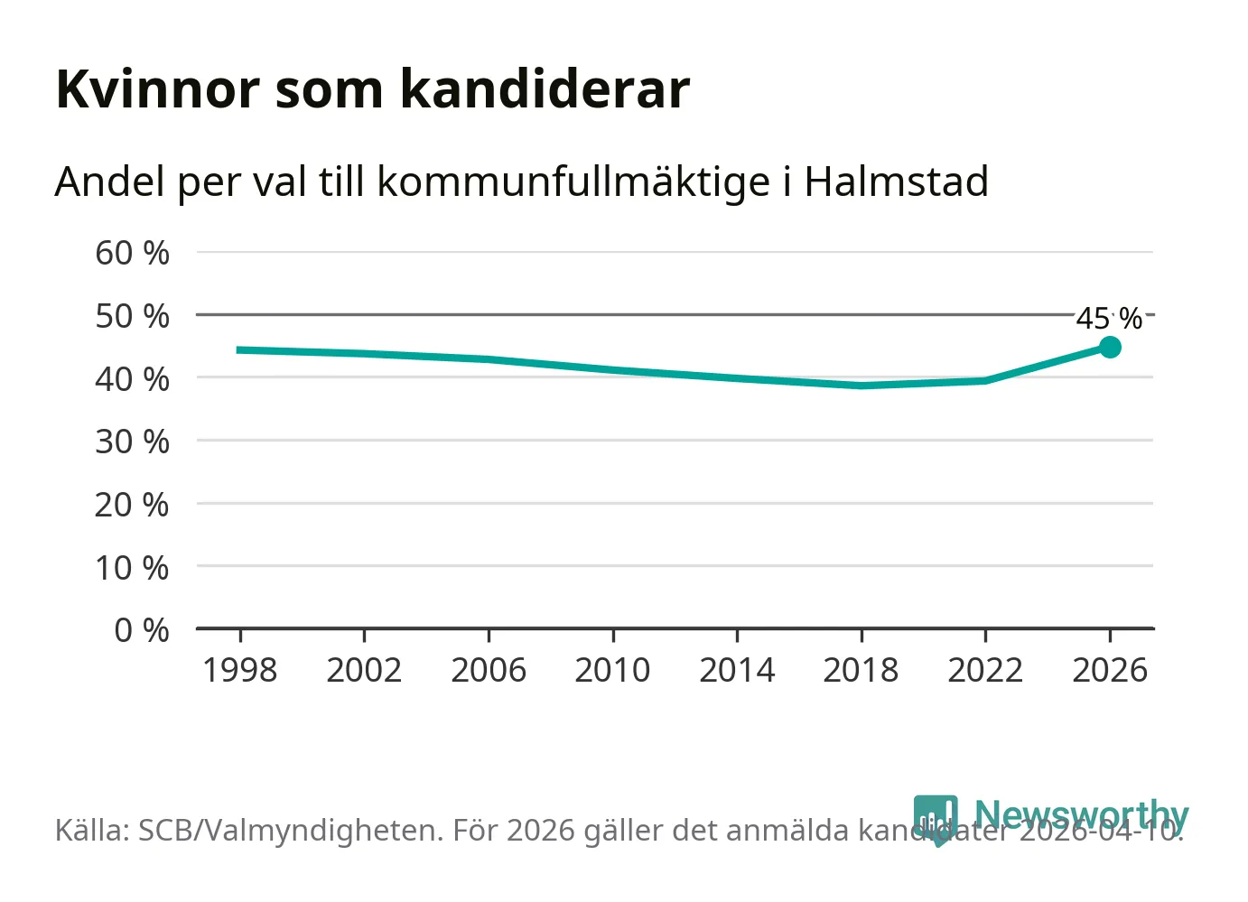 Kvinnorna utgör 45 procent av de hittills anmälda kandidaterna, vilket är den högsta andelen på listorna till kommunfullmäktige i Halmstad sedan åtminstone valet 1998. Halmstad är en av 264 kommuner i landet där männen utgör en majoritet av kandidaterna på listorna.