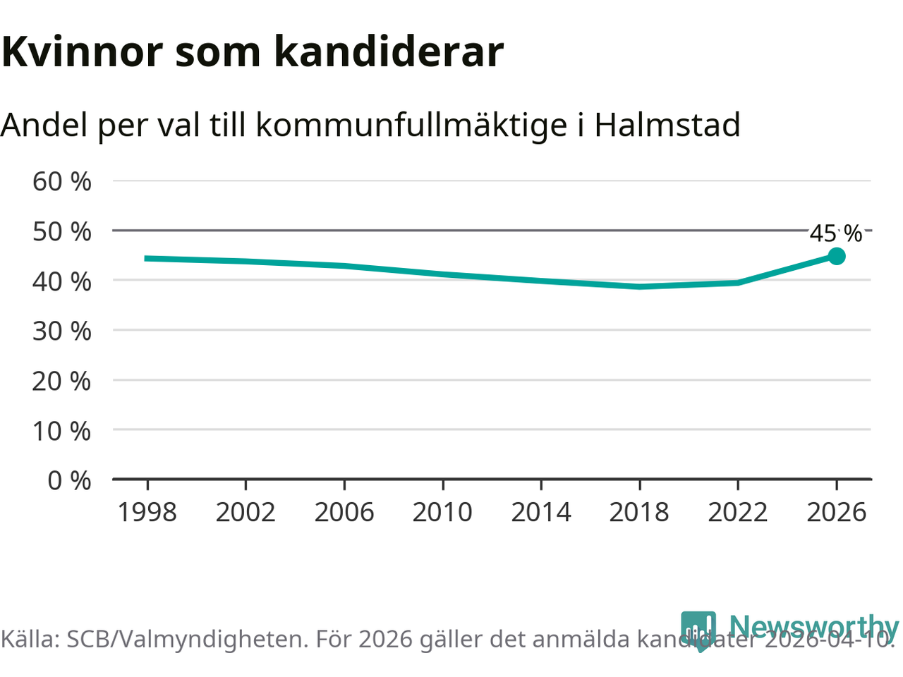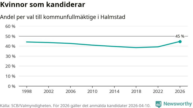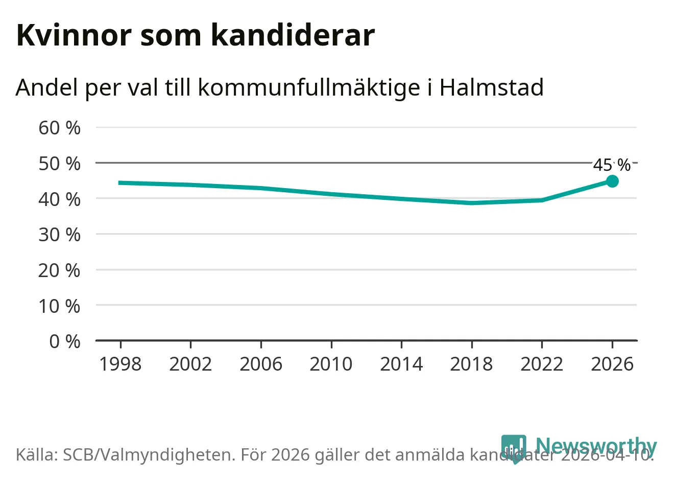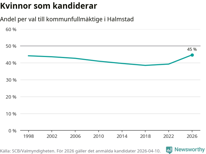 Kvinnorna utgör 45 procent av de hittills anmälda kandidaterna, vilket är den högsta andelen på listorna till kommunfullmäktige i Halmstad sedan åtminstone valet 1998. Halmstad är en av 264 kommuner i landet där männen utgör en majoritet av kandidaterna på listorna.