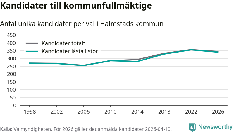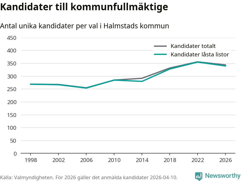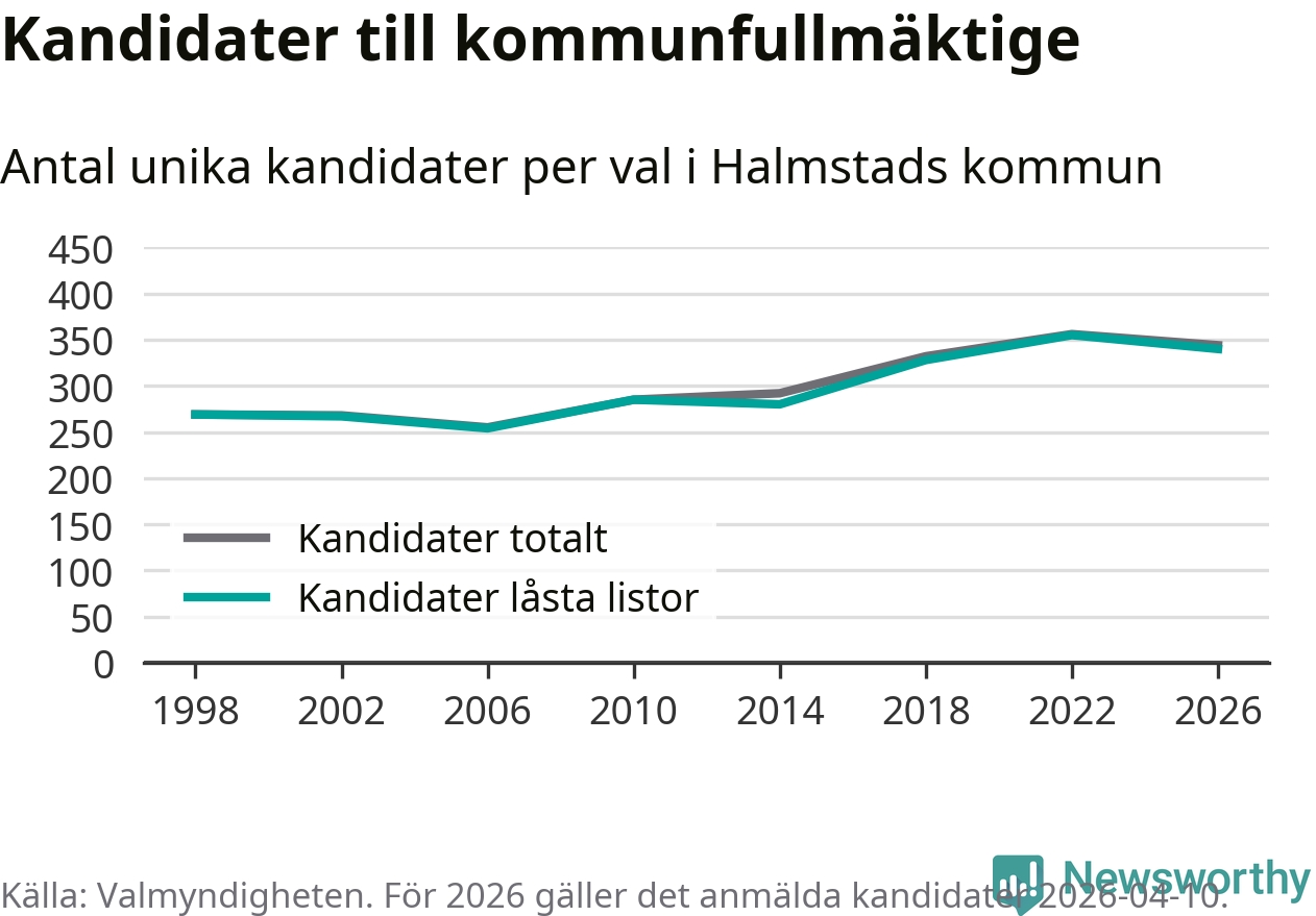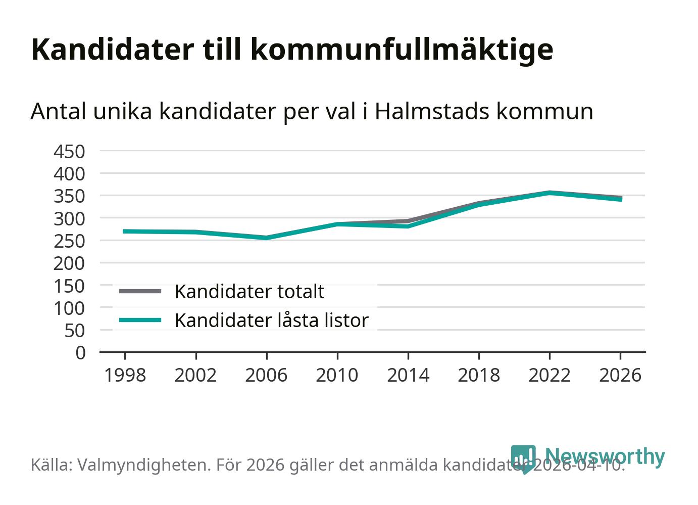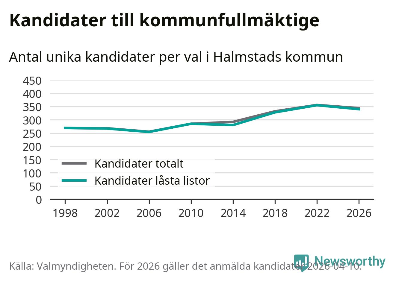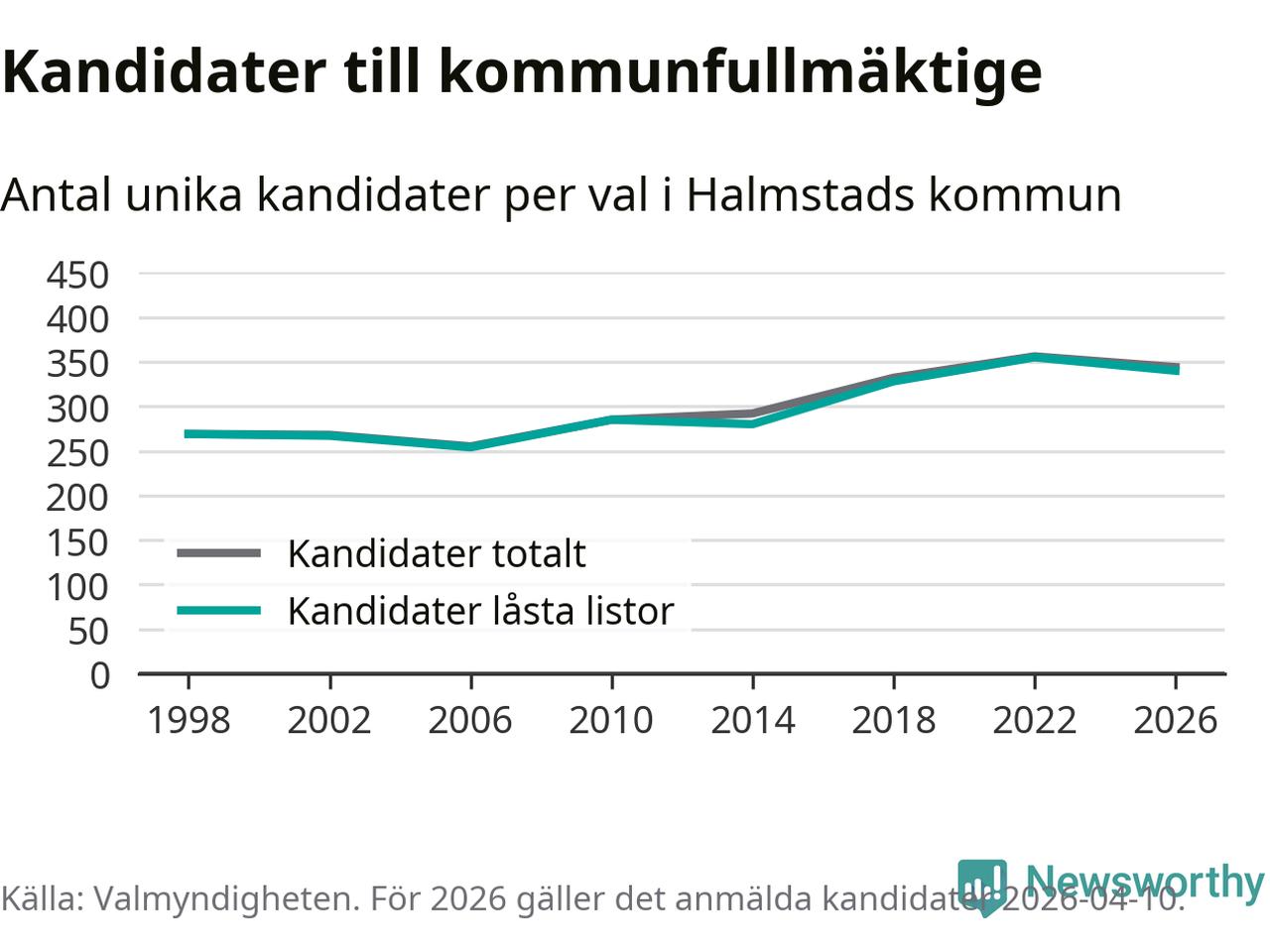 Nu börjar kandidatlistorna till höstens kommunfullmäktigeval i Halmstad falla på plats. 154 kvinnor och 190 män från 16 partier är anmälda hittills. Två kandidater finns med på flera olika partiers listor – samtidigt.