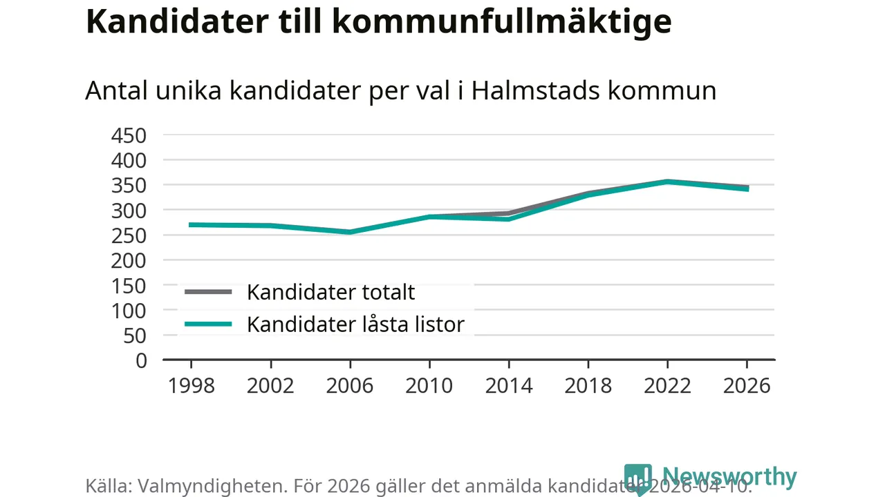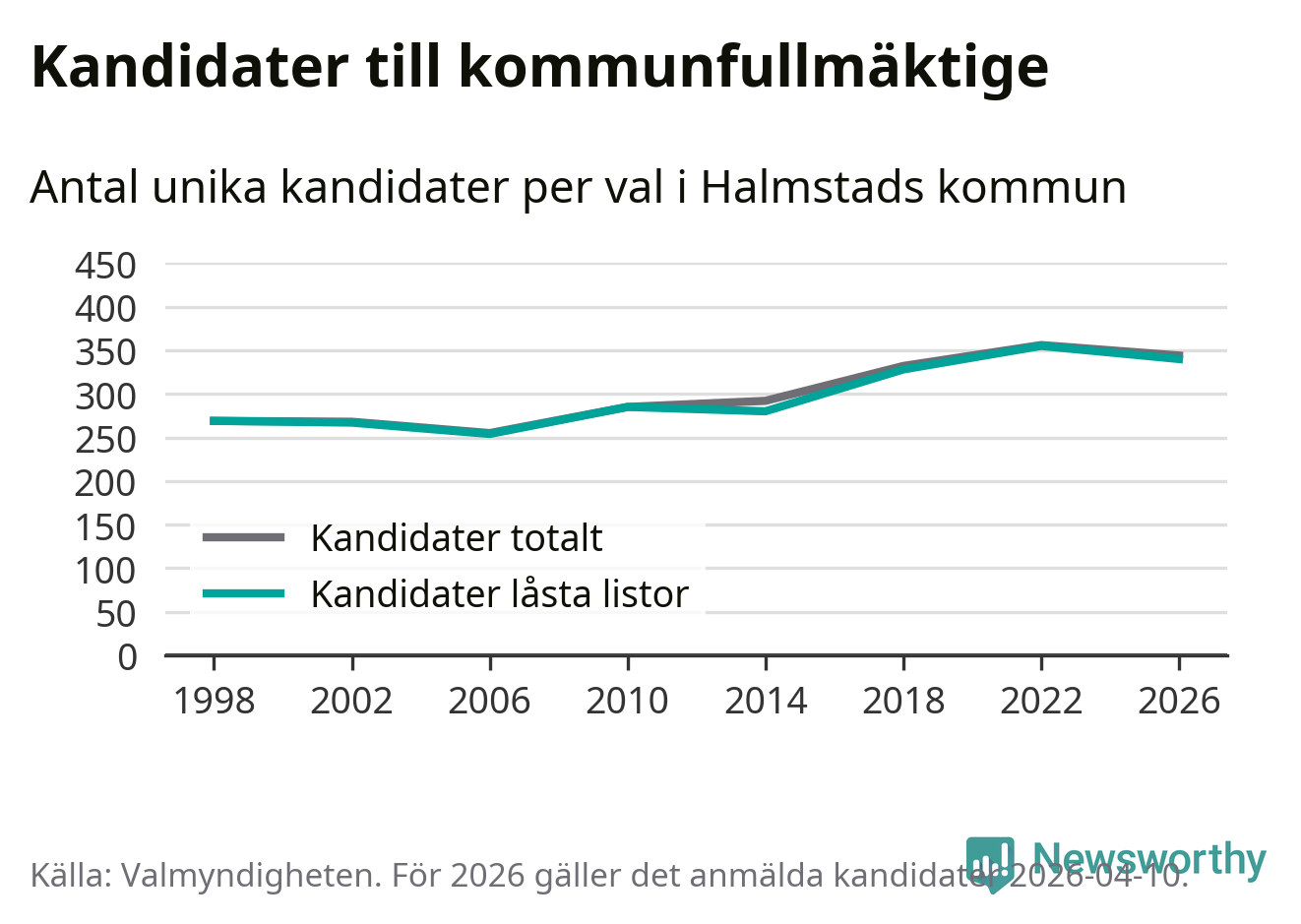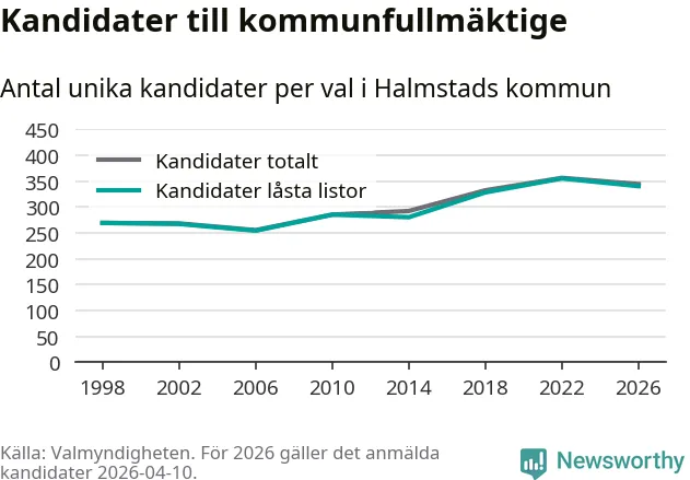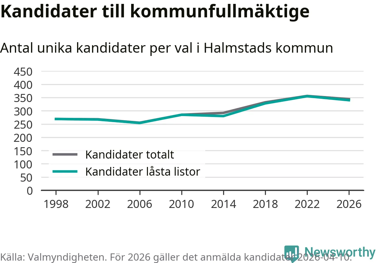 På torsdagen var det deadline för partier med låsta listor att registrera sina kandidater inför höstens val. Till valet till kommunfullmäktige i Halmstad är 340 kandidater anmälda på sådana listor, vilket är 15 färre än i valet 2022.