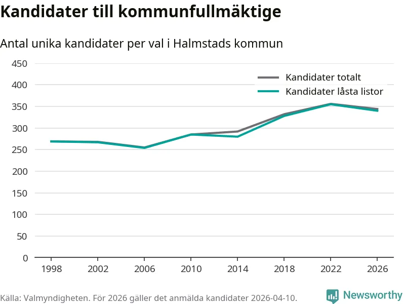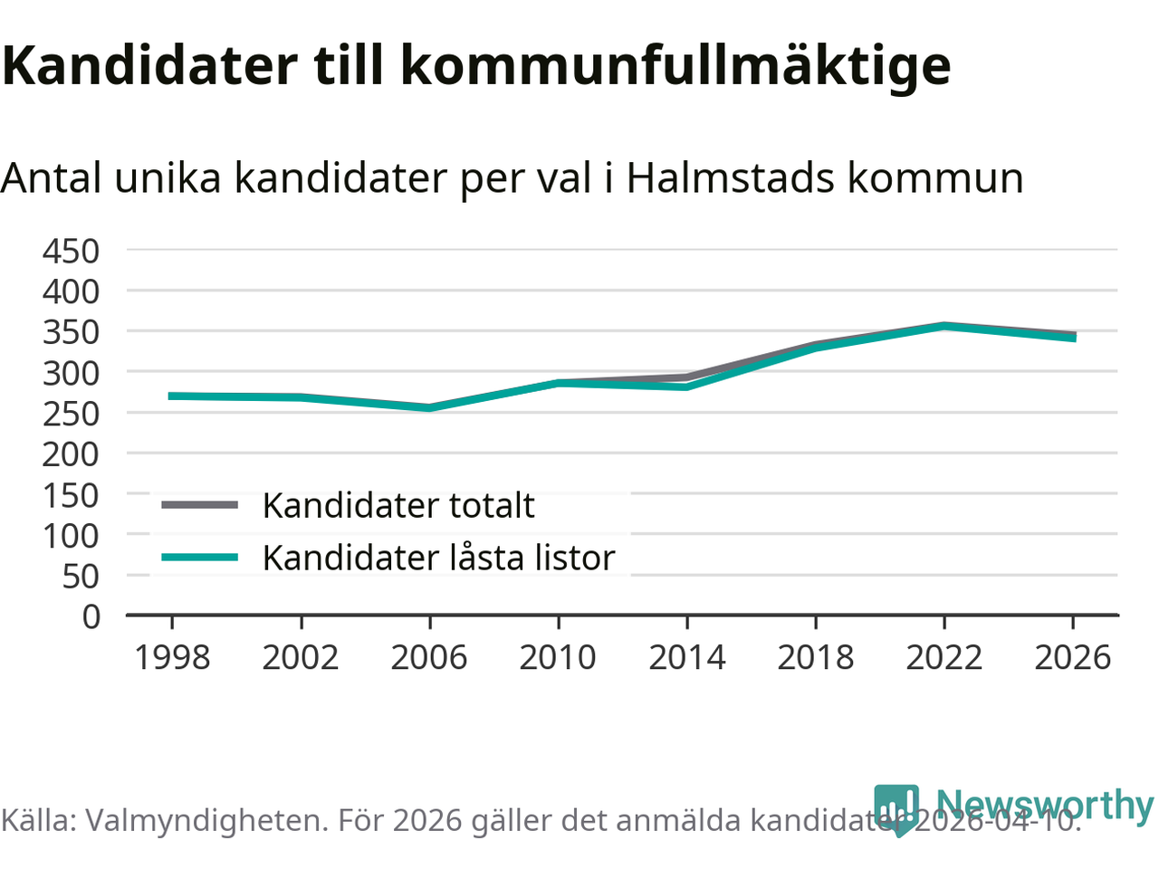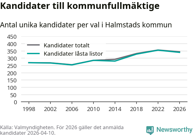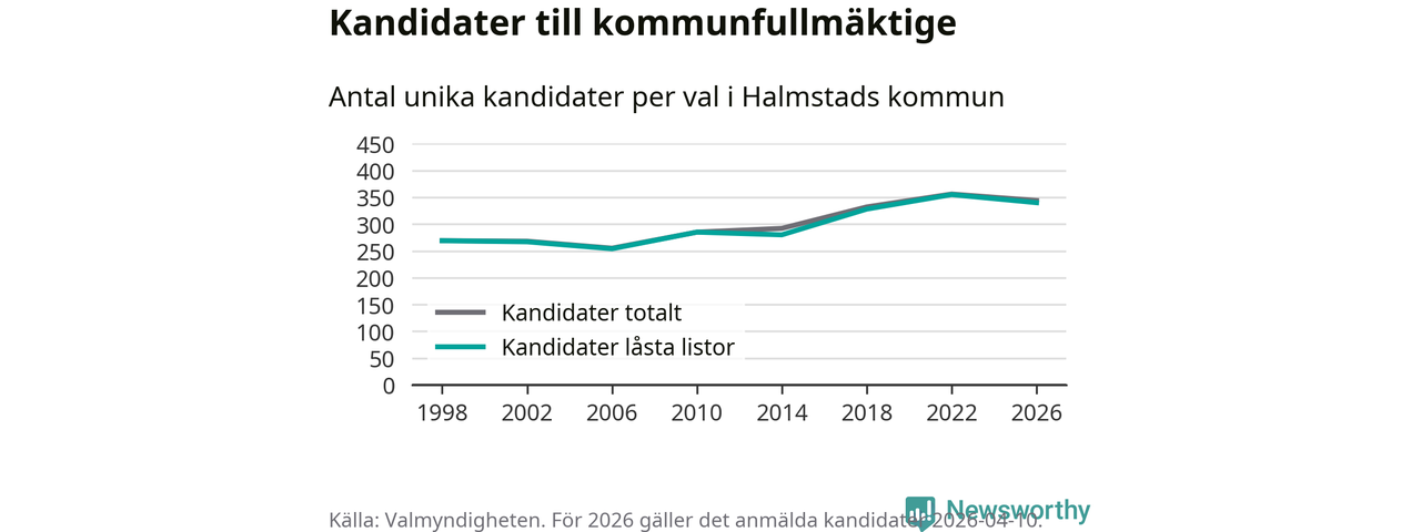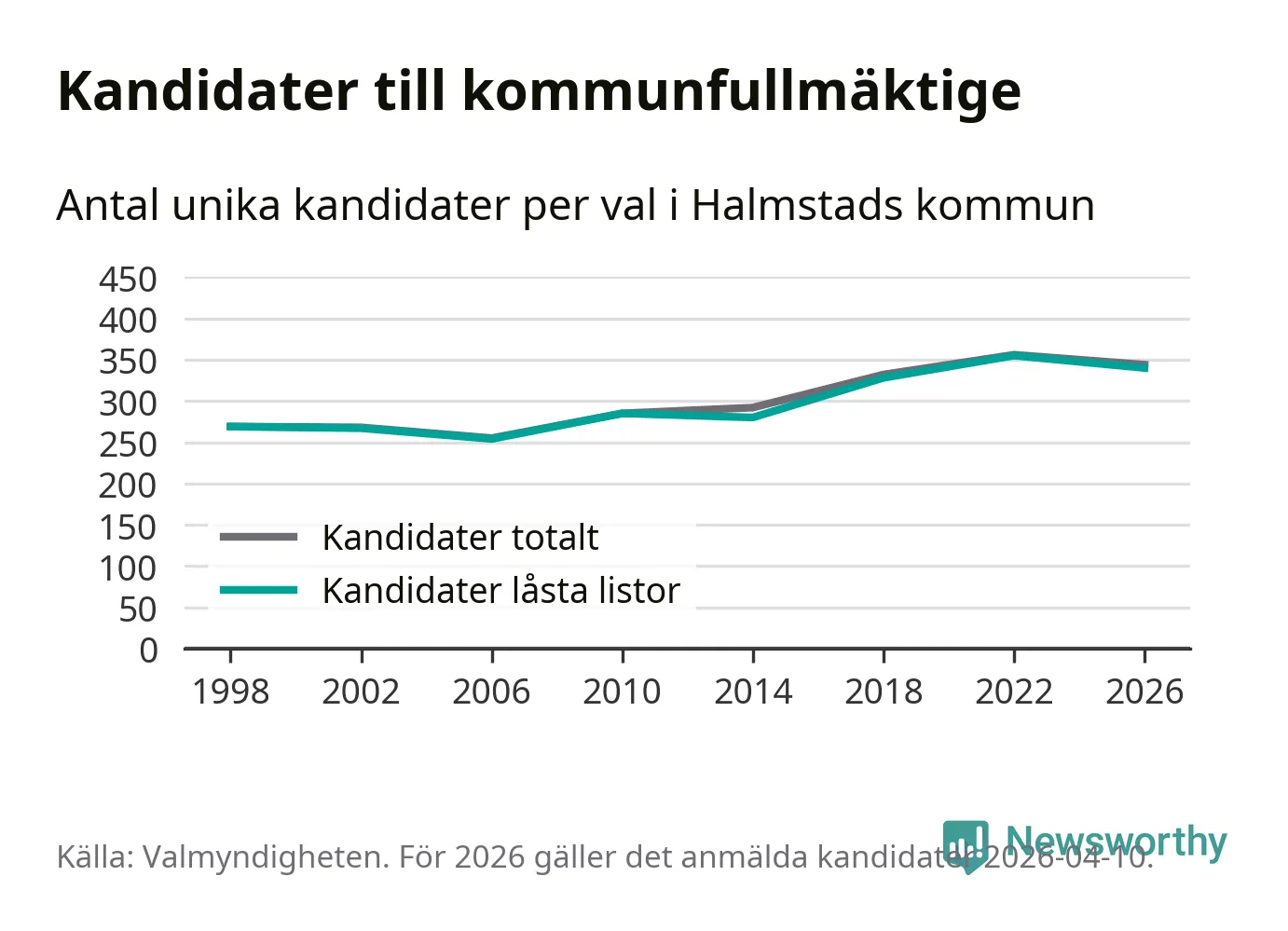 På torsdagen var det deadline för partier med låsta listor att registrera sina kandidater inför höstens val. Till valet till kommunfullmäktige i Halmstad är 340 kandidater anmälda på sådana listor, vilket är 15 färre än i valet 2022.