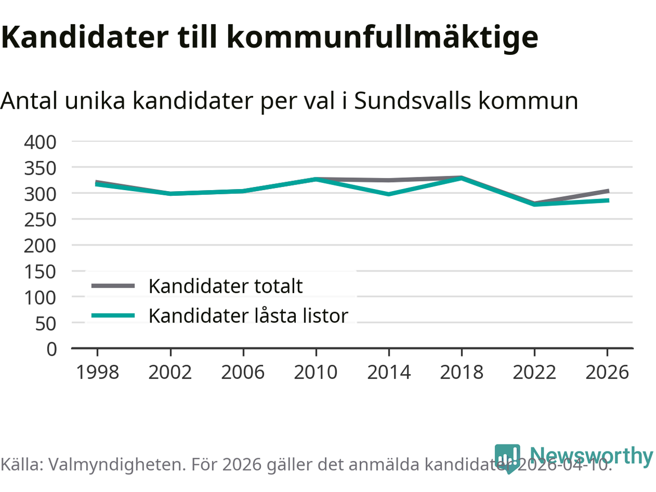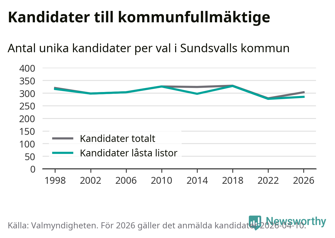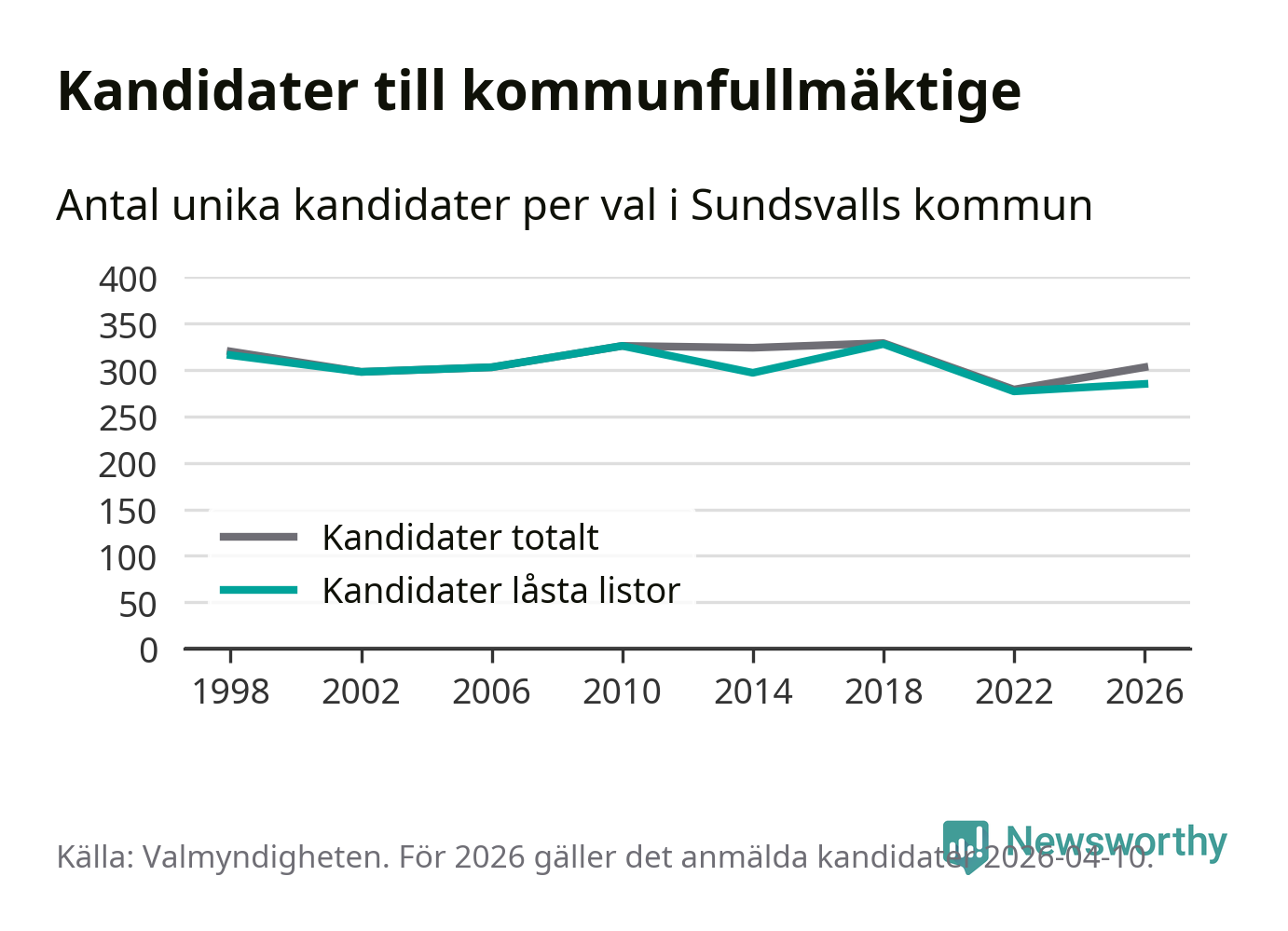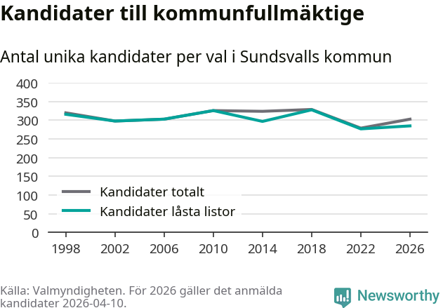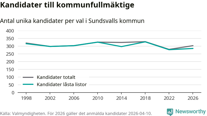 Att listan är låst innebär att partiet redan har anmält sina kandidater och bestämt ordningen på listan och att väljare inte kan lägga till egna kandidater. På öppna listor kan kandidater läggas till fram till dagarna före valet och vem som helst kan anmäla sig som kandidat. De senaste valen har drygt nio av tio kandidater anmälts på låsta listor. I valet till kommunfullmäktige i Sundsvall 2022 fanns i princip alla kandidater på låsta listor. Hittills i år finns 18 kandidater på öppna listor. Totalt rör det sig alltså om 303 kandidater till höstens val.
