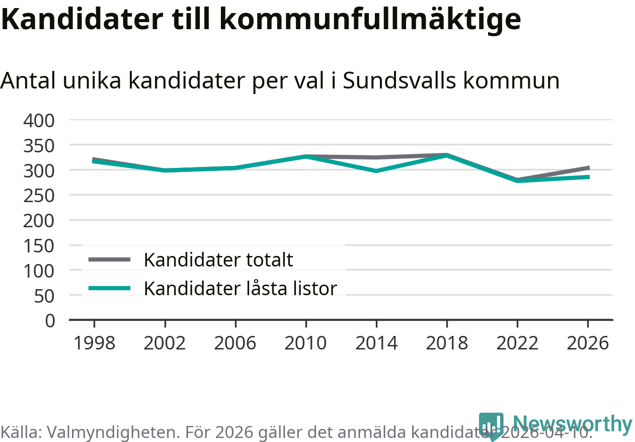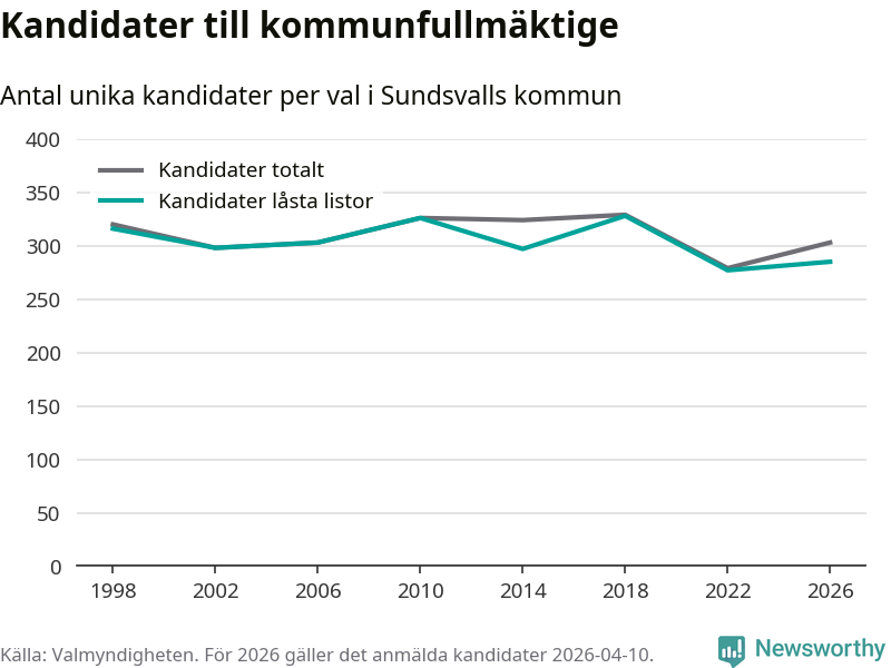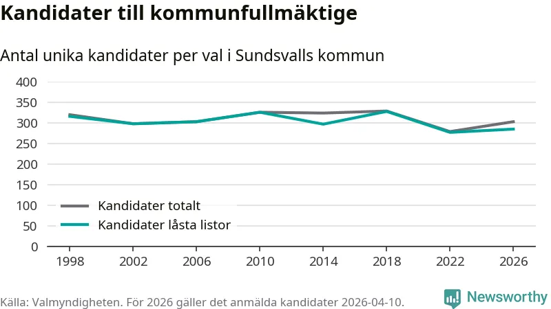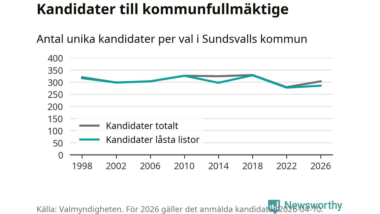 På torsdagen var det deadline för partier med låsta listor att registrera sina kandidater inför höstens val. Till valet till kommunfullmäktige i Sundsvall är 285 kandidater anmälda på sådana listor, vilket är åtta fler än i valet 2022.