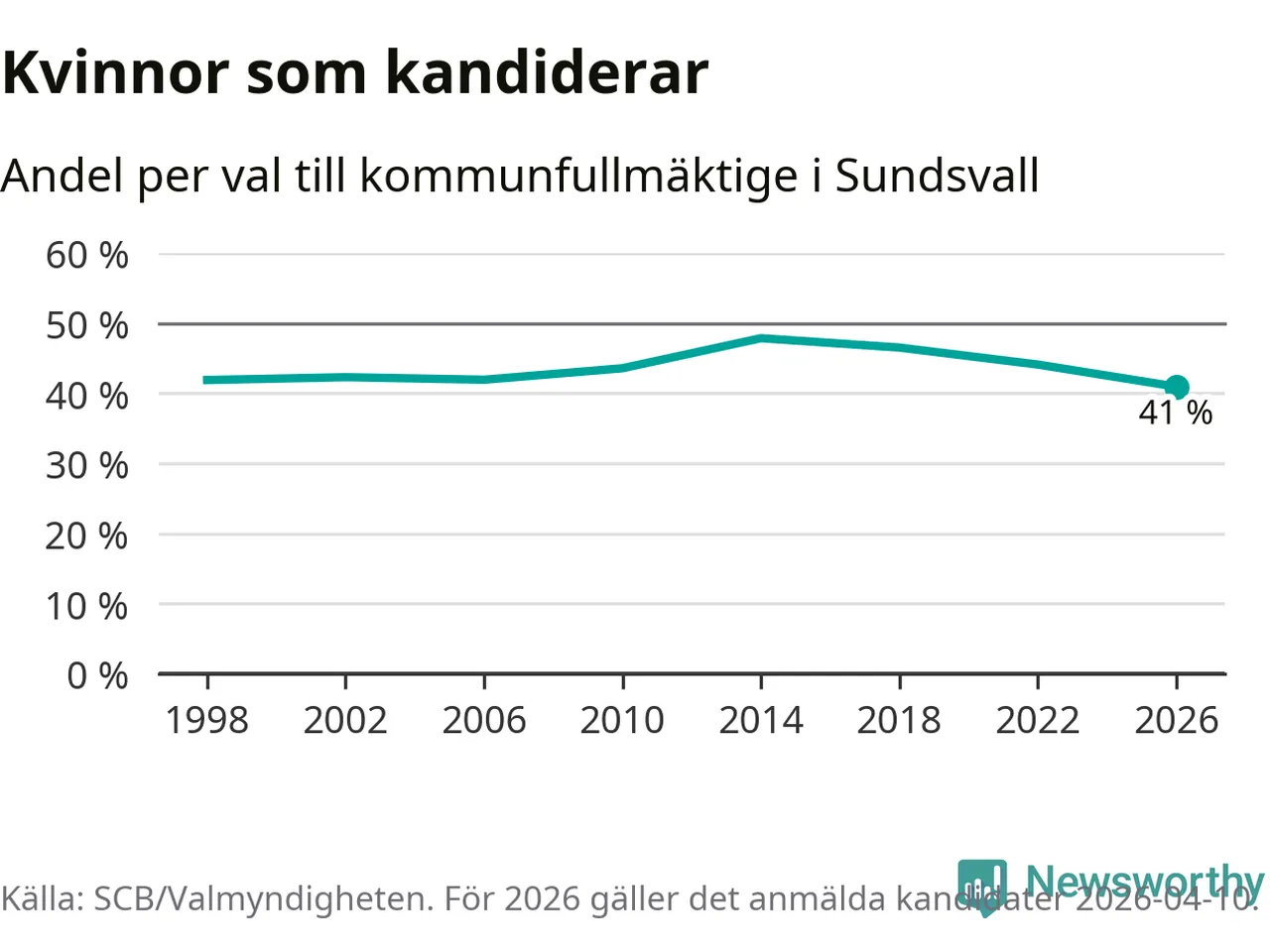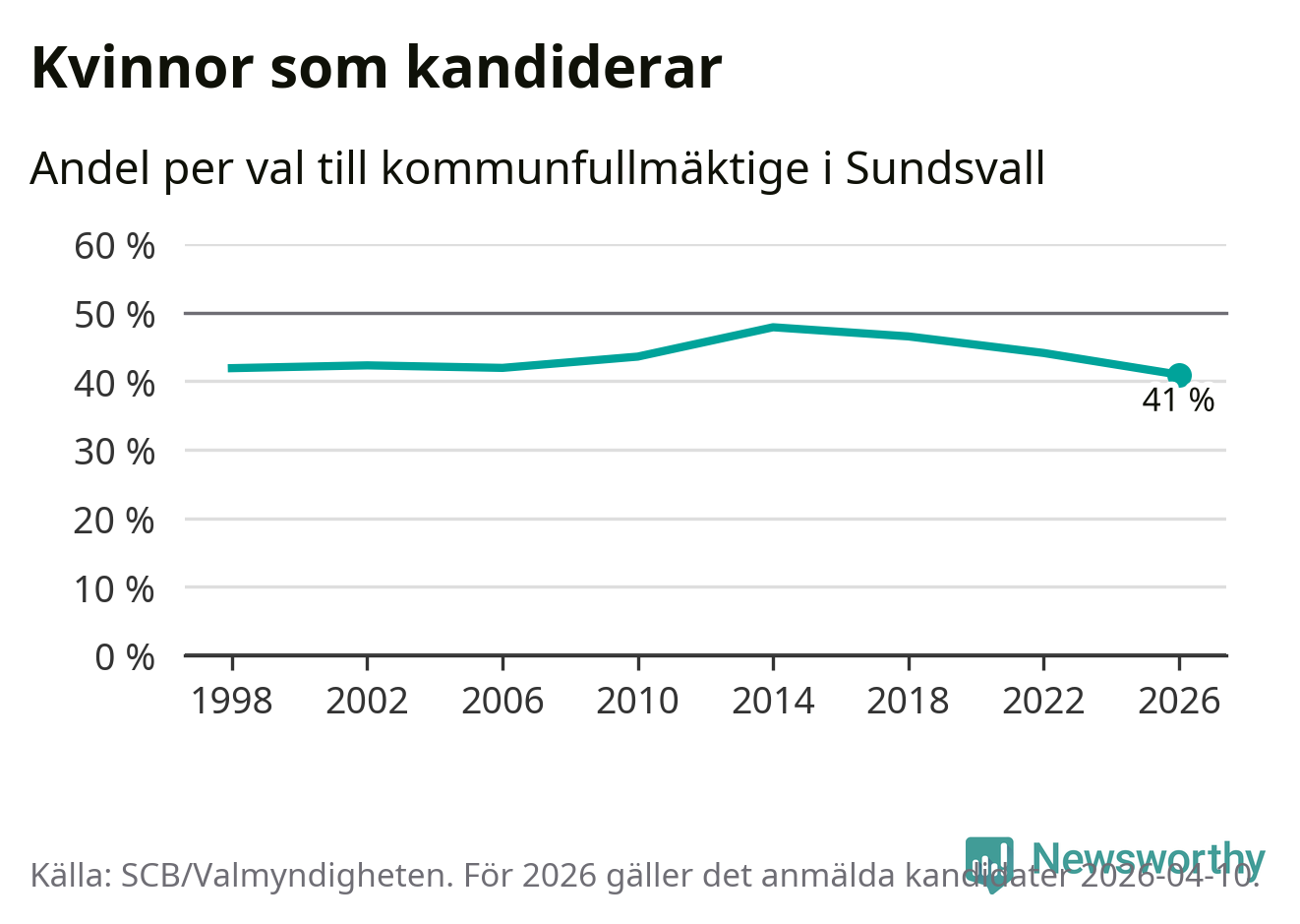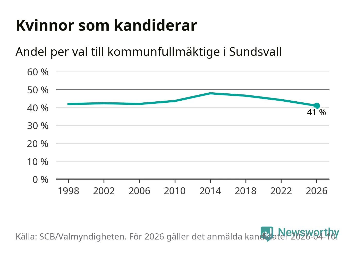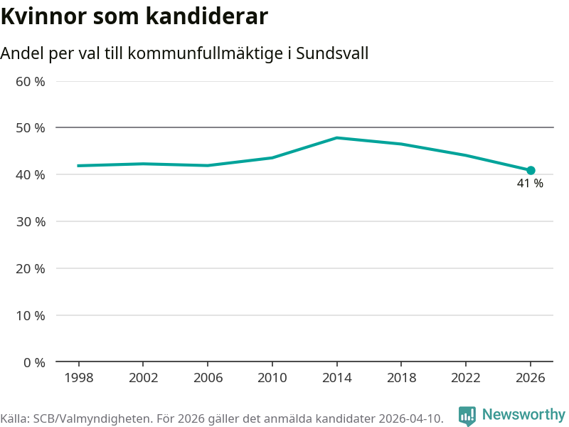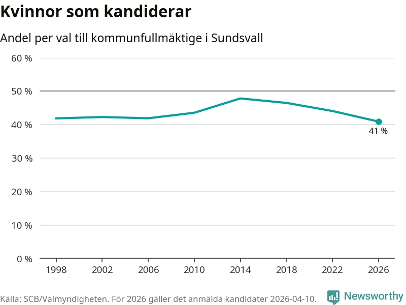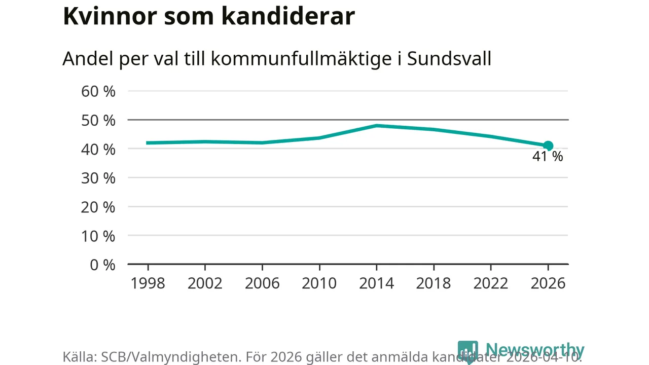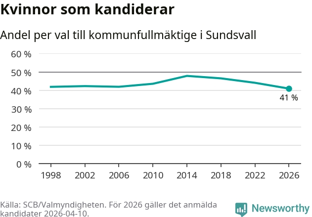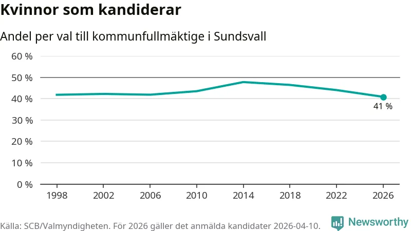 Kvinnorna utgör 41 procent av de hittills anmälda kandidaterna, vilket är den lägsta andelen på listorna till kommunfullmäktige i Sundsvall sedan åtminstone valet 1998. Andelen kvinnor har minskat i Sundsvall under de senaste två valen och minskningen ser alltså ut att forsätta i år. Sundsvall är en av 264 kommuner i landet där männen utgör en majoritet av kandidaterna på listorna.