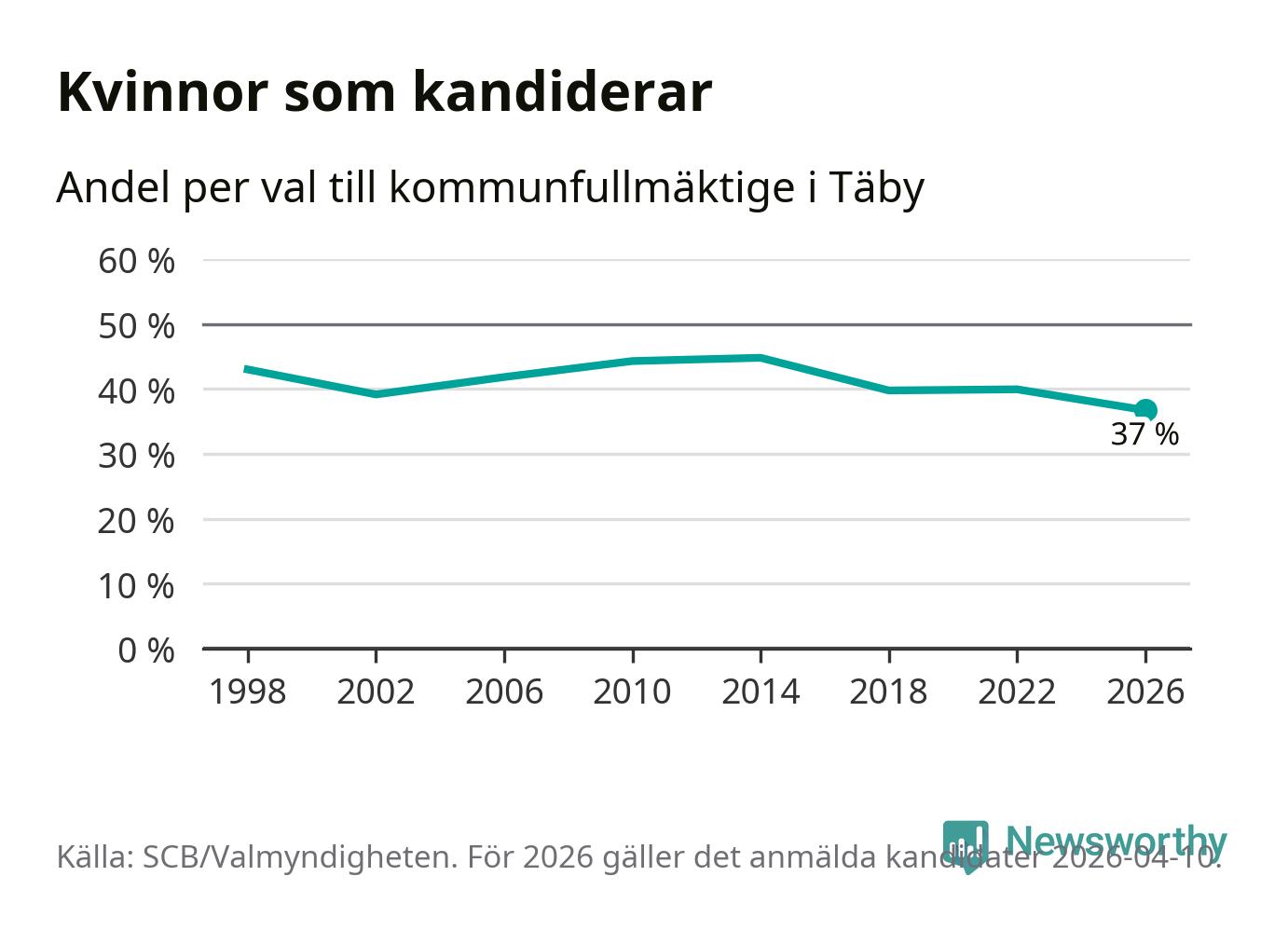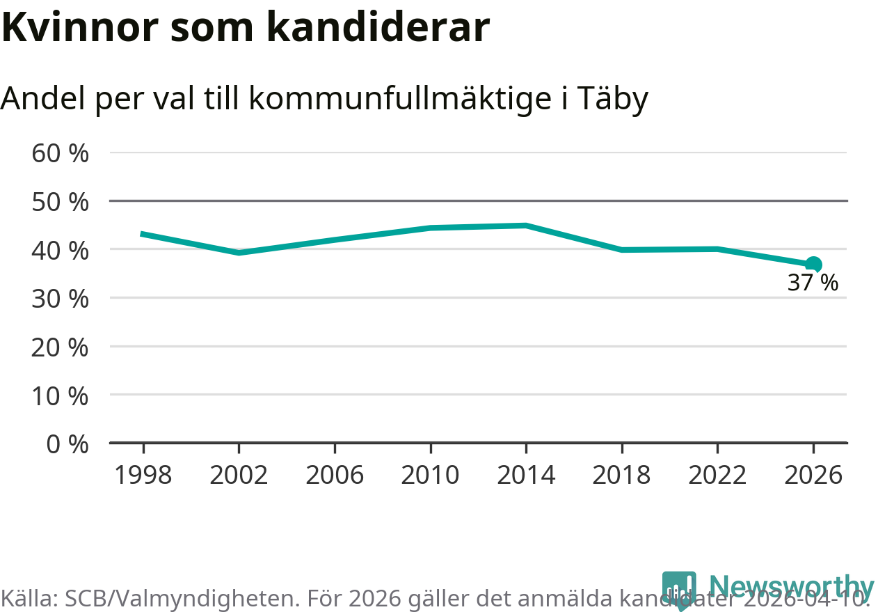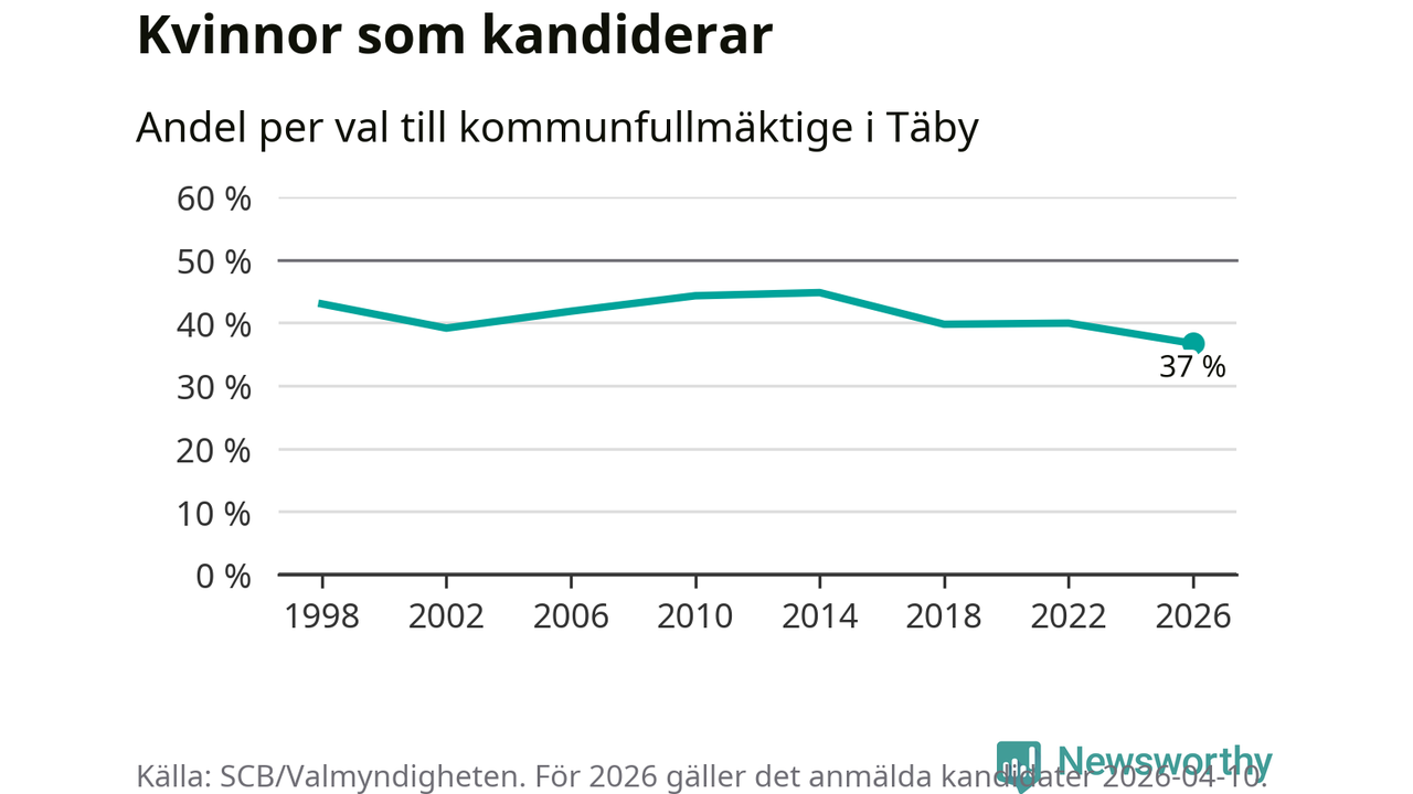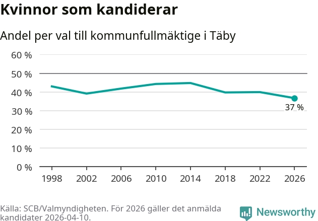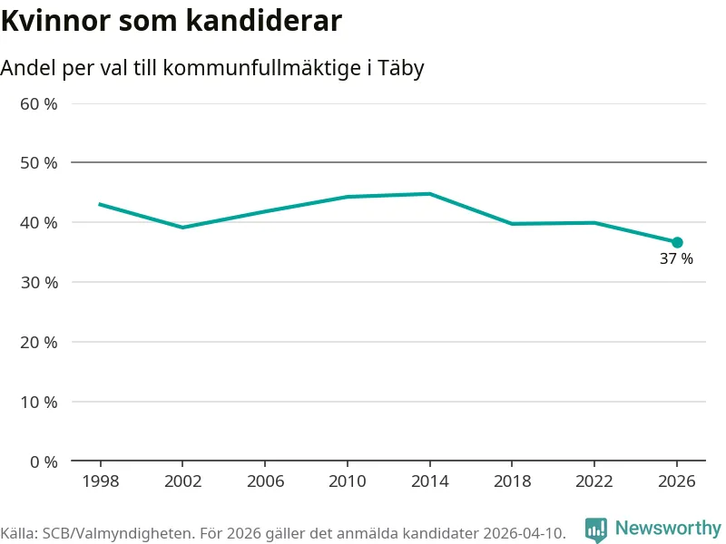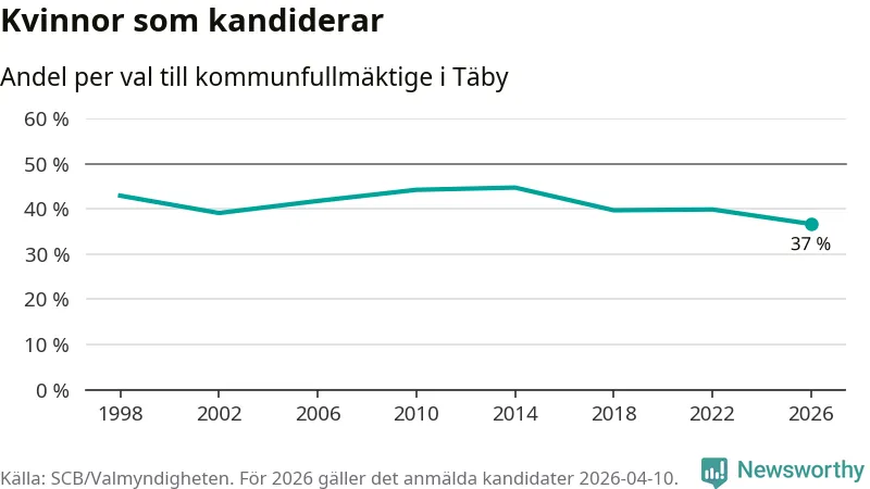 Kvinnorna utgör 37 procent av de hittills anmälda kandidaterna, vilket är den lägsta andelen på listorna till kommunfullmäktige i Täby sedan åtminstone valet 1998. Täby är en av 264 kommuner i landet där männen utgör en majoritet av kandidaterna på listorna.