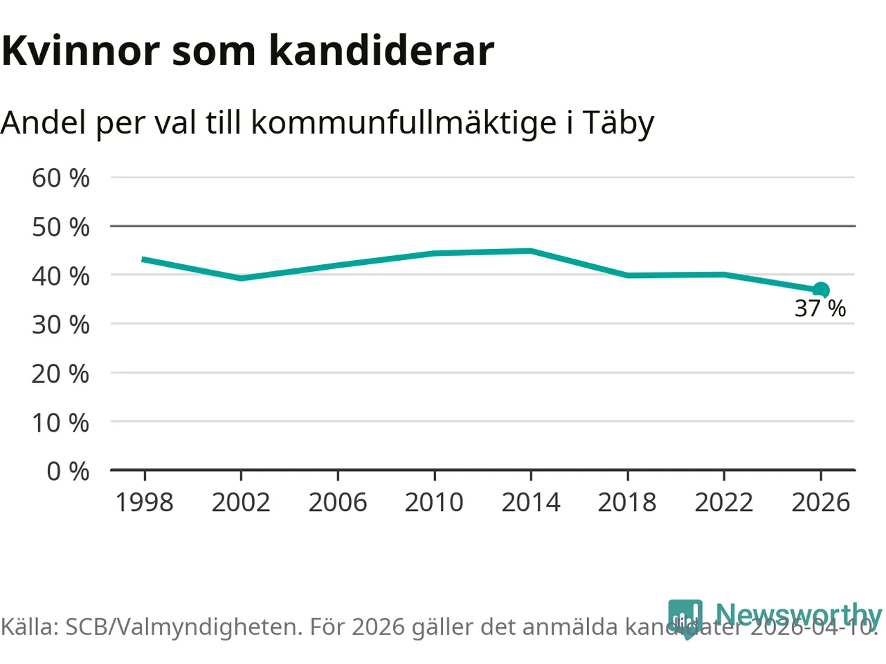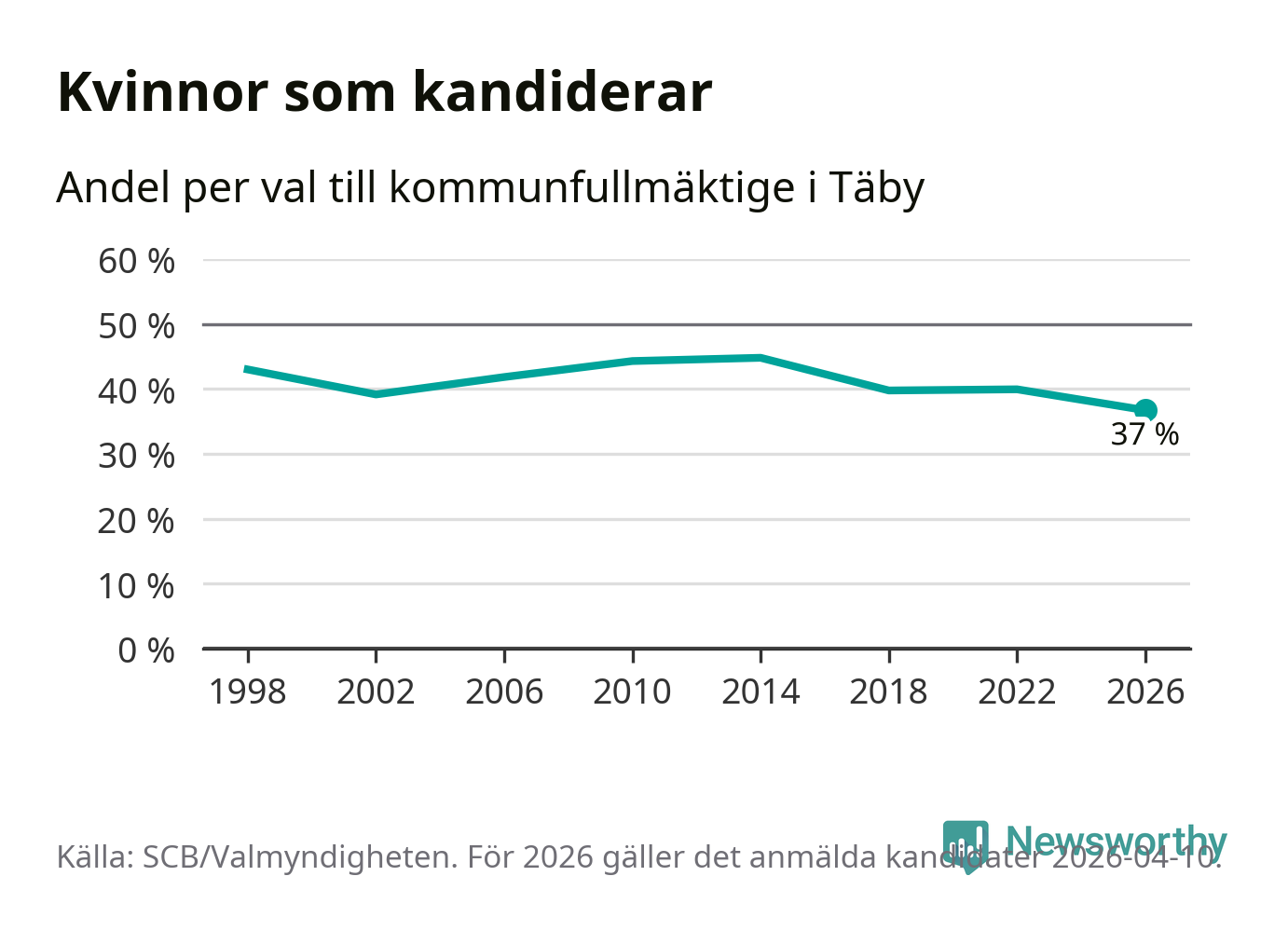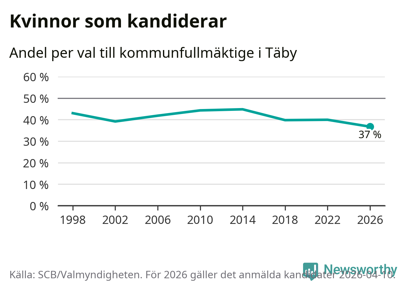 Kvinnorna utgör 37 procent av de hittills anmälda kandidaterna, vilket är den lägsta andelen på listorna till kommunfullmäktige i Täby sedan åtminstone valet 1998. Täby är en av 264 kommuner i landet där männen utgör en majoritet av kandidaterna på listorna.