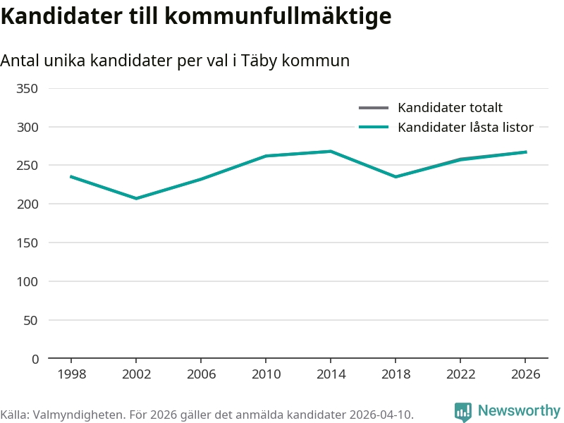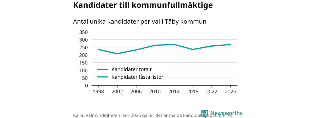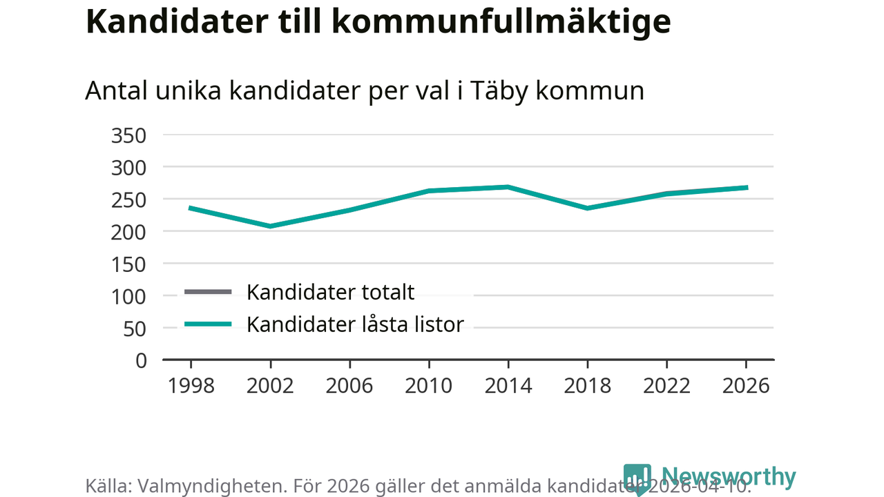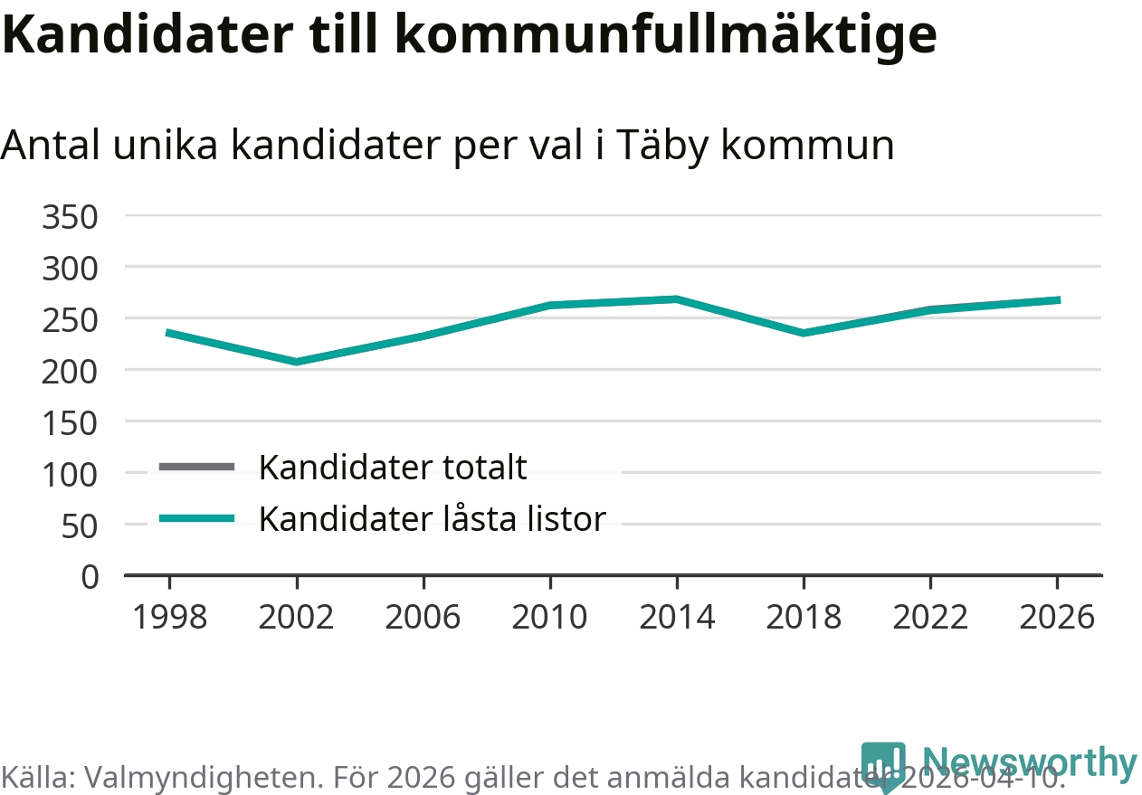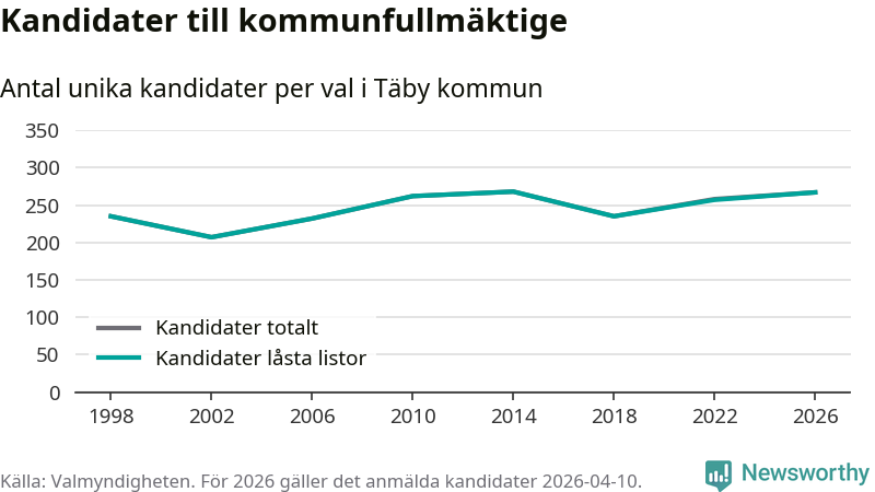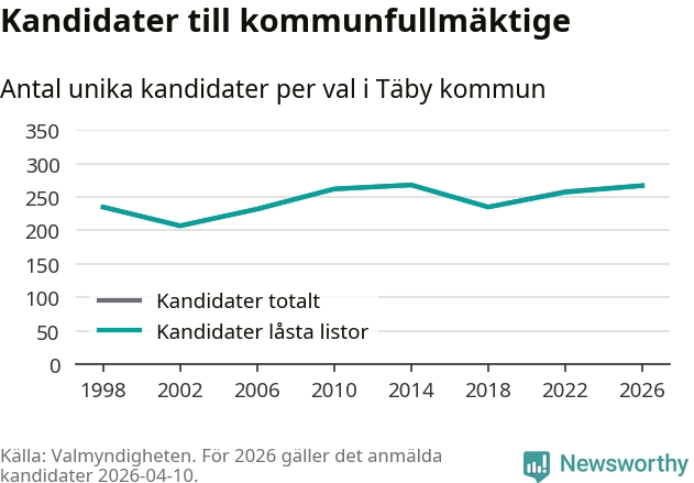 På torsdagen var det deadline för partier med låsta listor att registrera sina kandidater inför höstens val. Till valet till kommunfullmäktige i Täby är 267 kandidater anmälda på sådana listor, vilket är tio fler än i valet 2022.