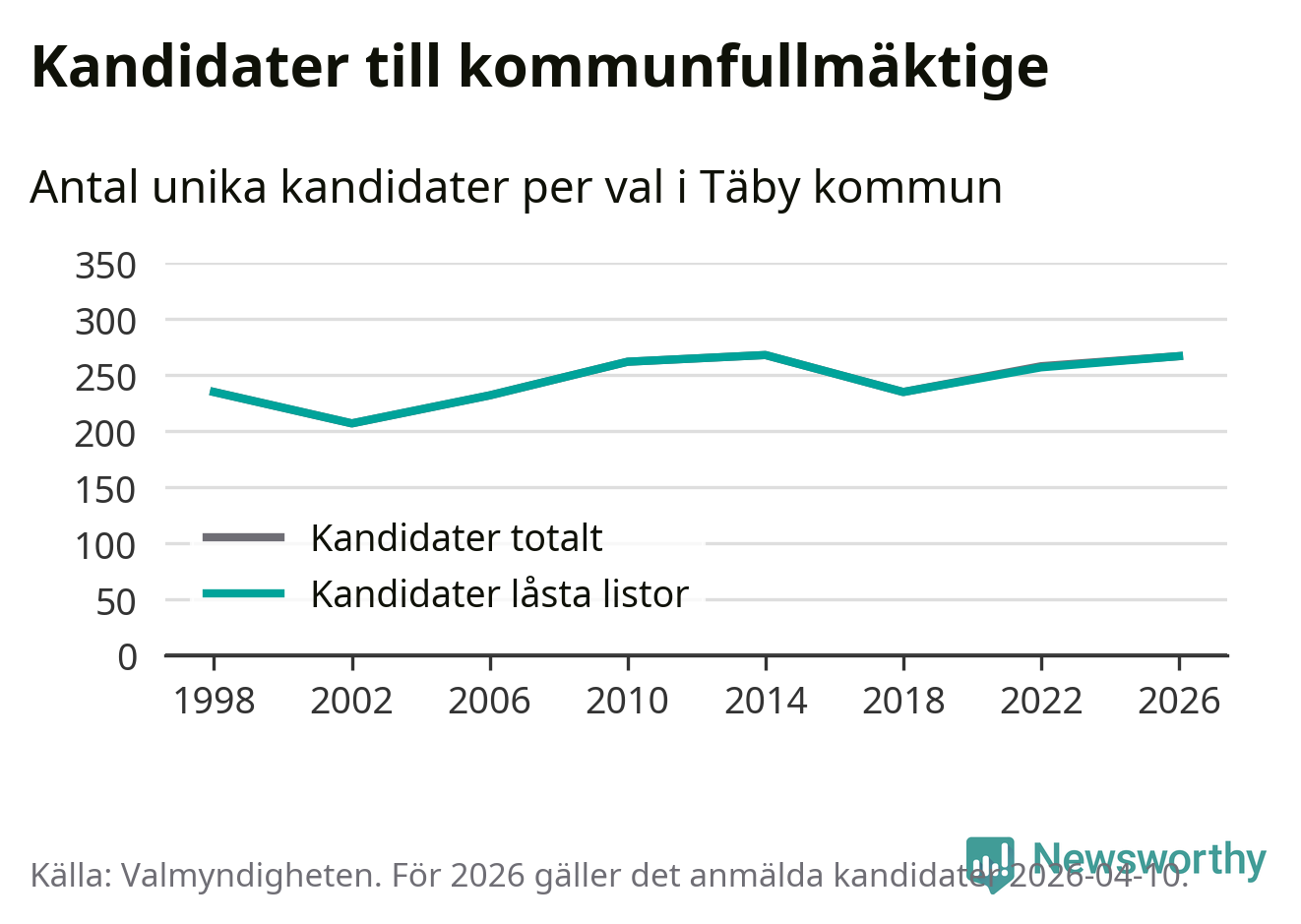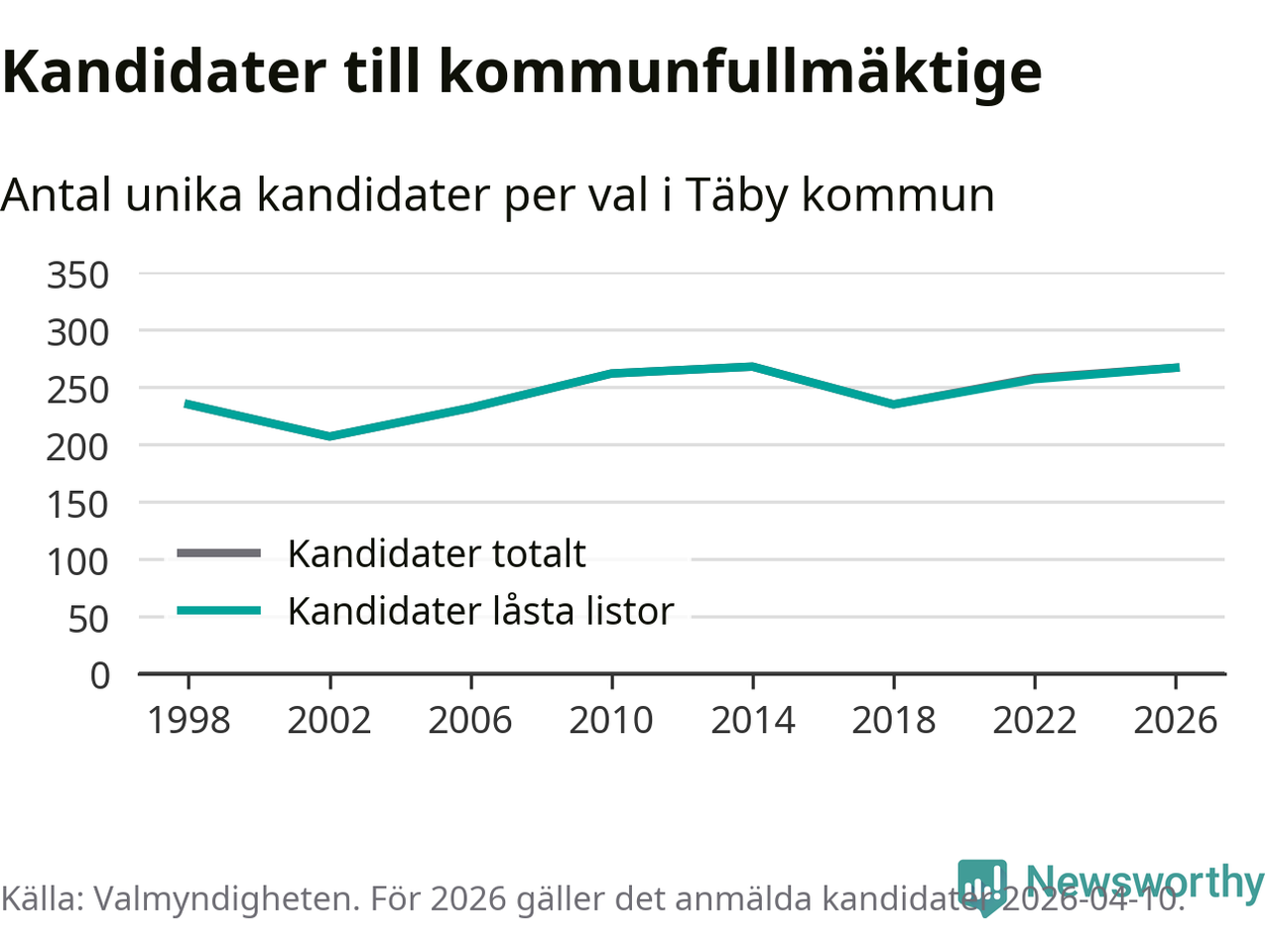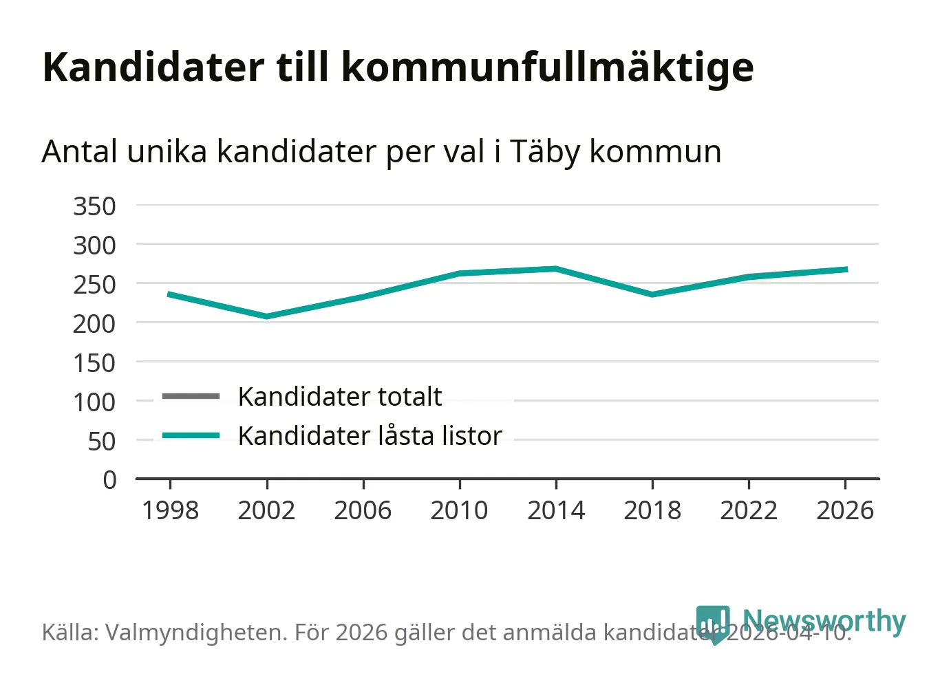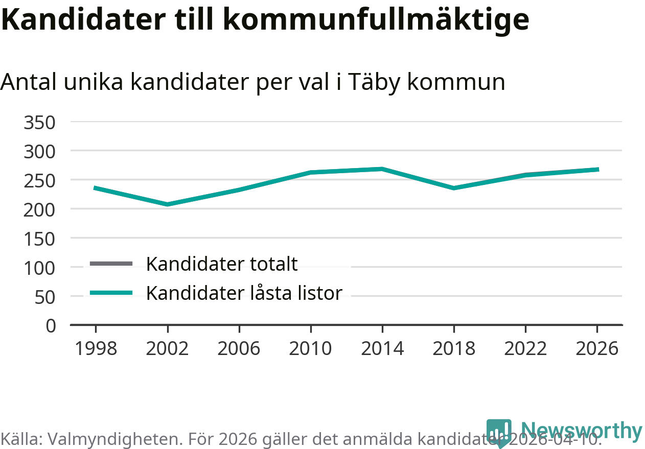 På torsdagen var det deadline för partier med låsta listor att registrera sina kandidater inför höstens val. Till valet till kommunfullmäktige i Täby är 267 kandidater anmälda på sådana listor, vilket är tio fler än i valet 2022.