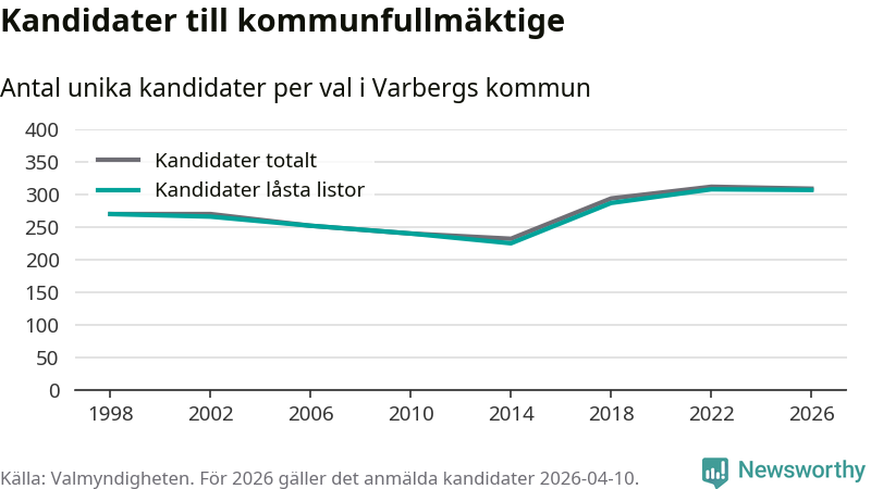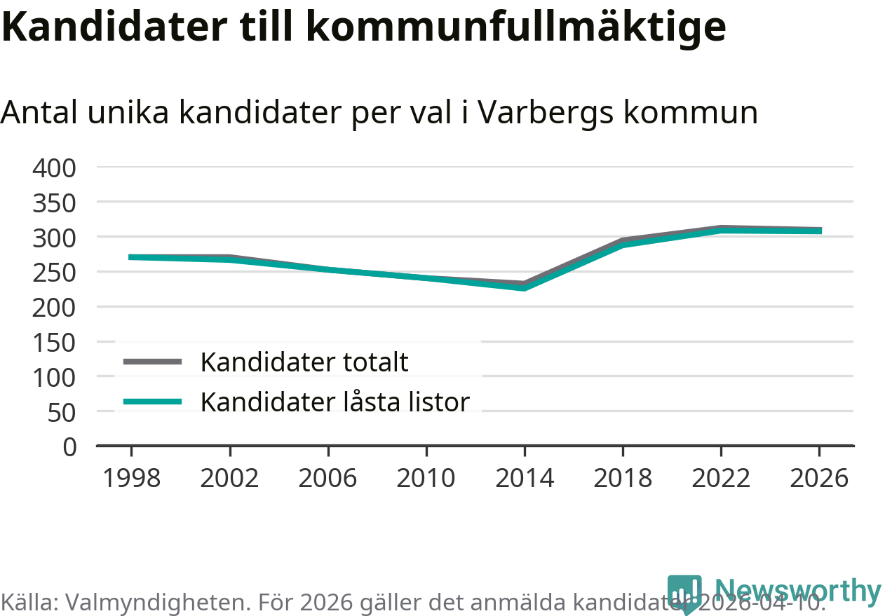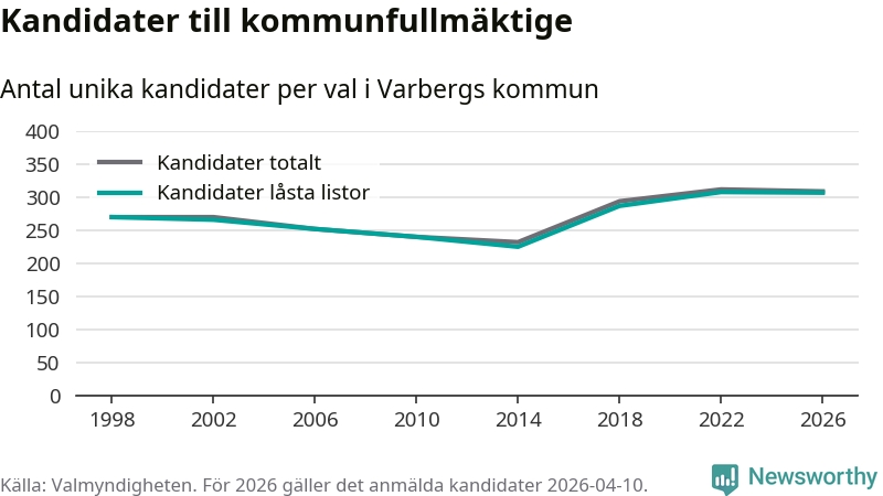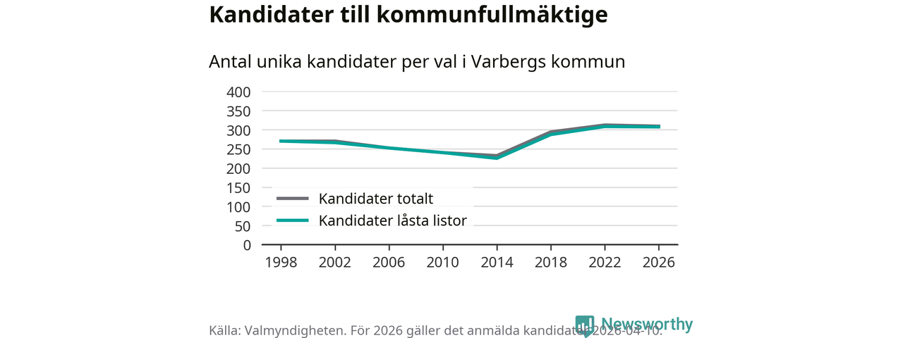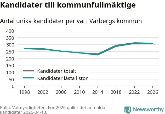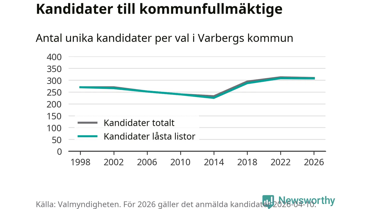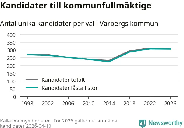 På torsdagen var det deadline för partier med låsta listor att registrera sina kandidater inför höstens val. Till valet till kommunfullmäktige i Varberg är 307 kandidater anmälda på sådana listor, vilket är ett färre än i valet 2022.