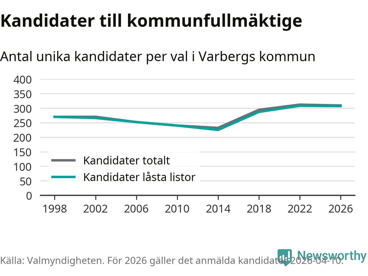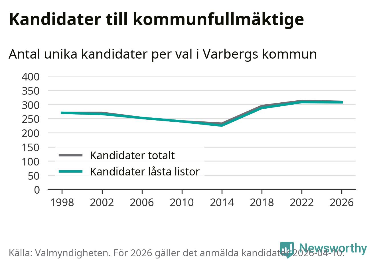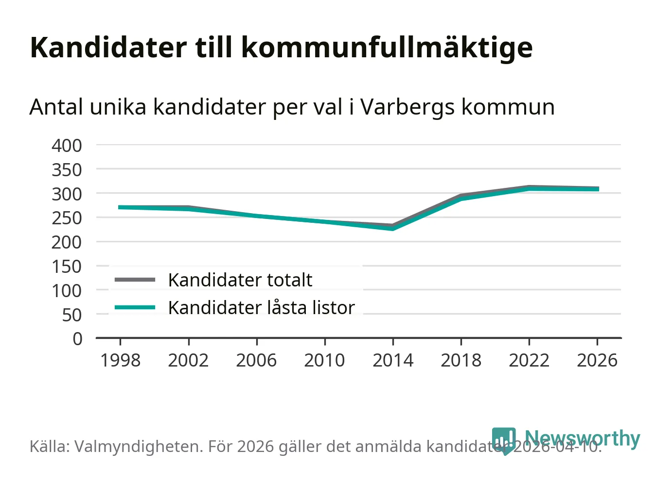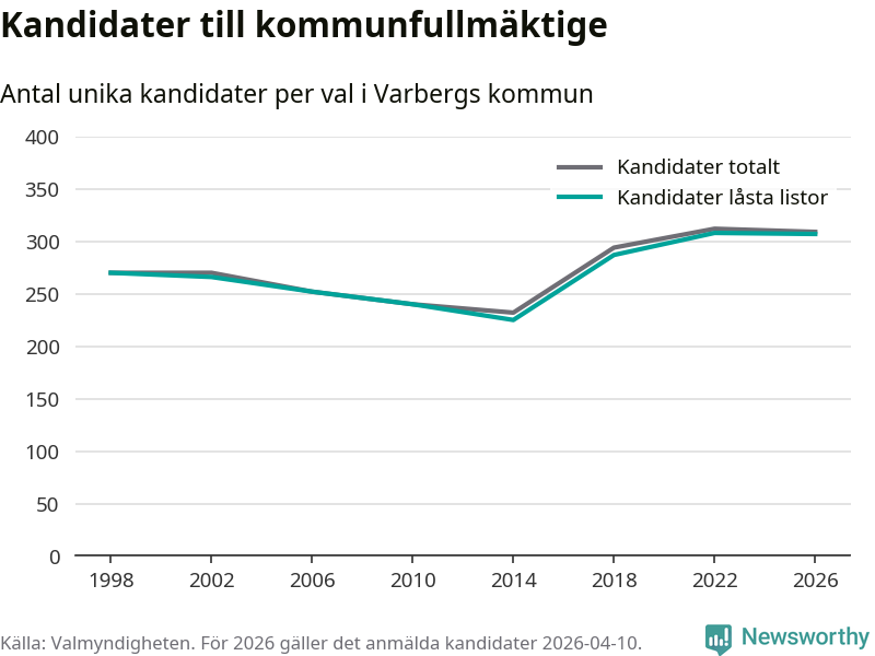 På torsdagen var det deadline för partier med låsta listor att registrera sina kandidater inför höstens val. Till valet till kommunfullmäktige i Varberg är 307 kandidater anmälda på sådana listor, vilket är ett färre än i valet 2022.