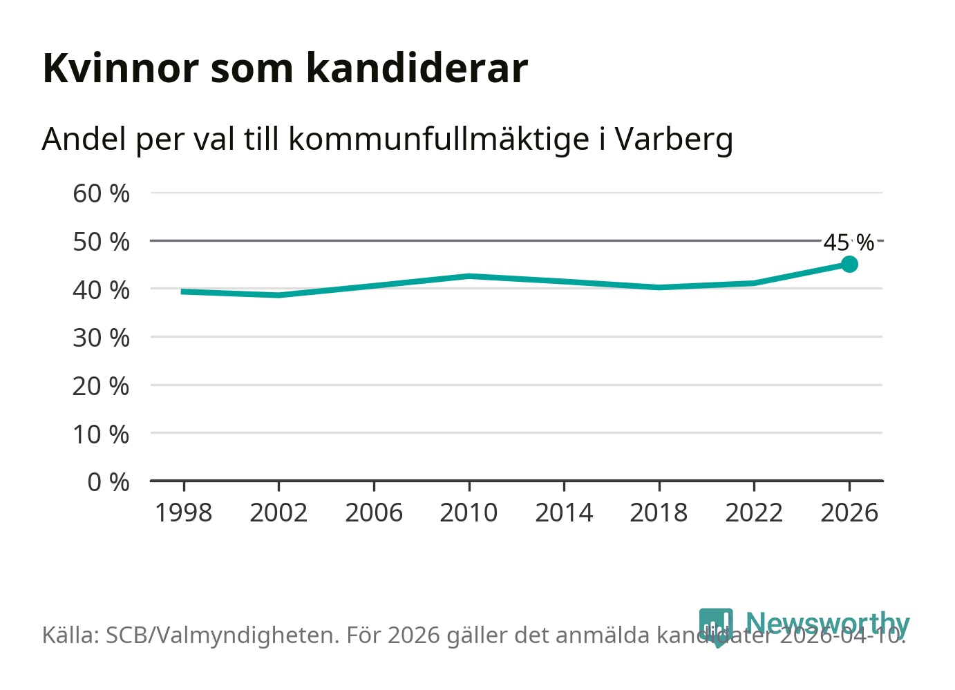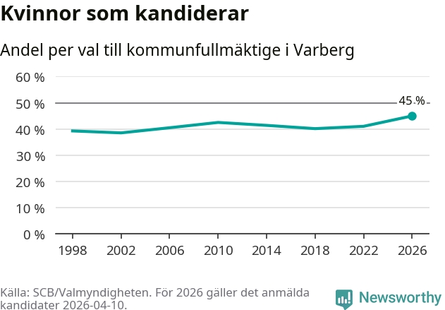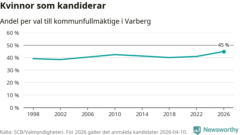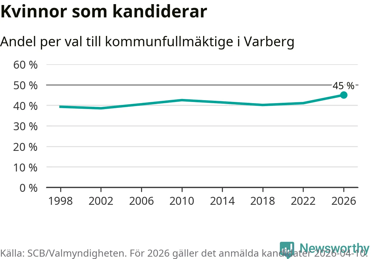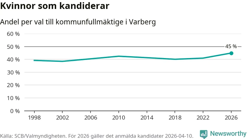 Kvinnorna utgör 45 procent av de hittills anmälda kandidaterna, vilket är den högsta andelen på listorna till kommunfullmäktige i Varberg sedan åtminstone valet 1998. Varberg är en av 264 kommuner i landet där männen utgör en majoritet av kandidaterna på listorna.