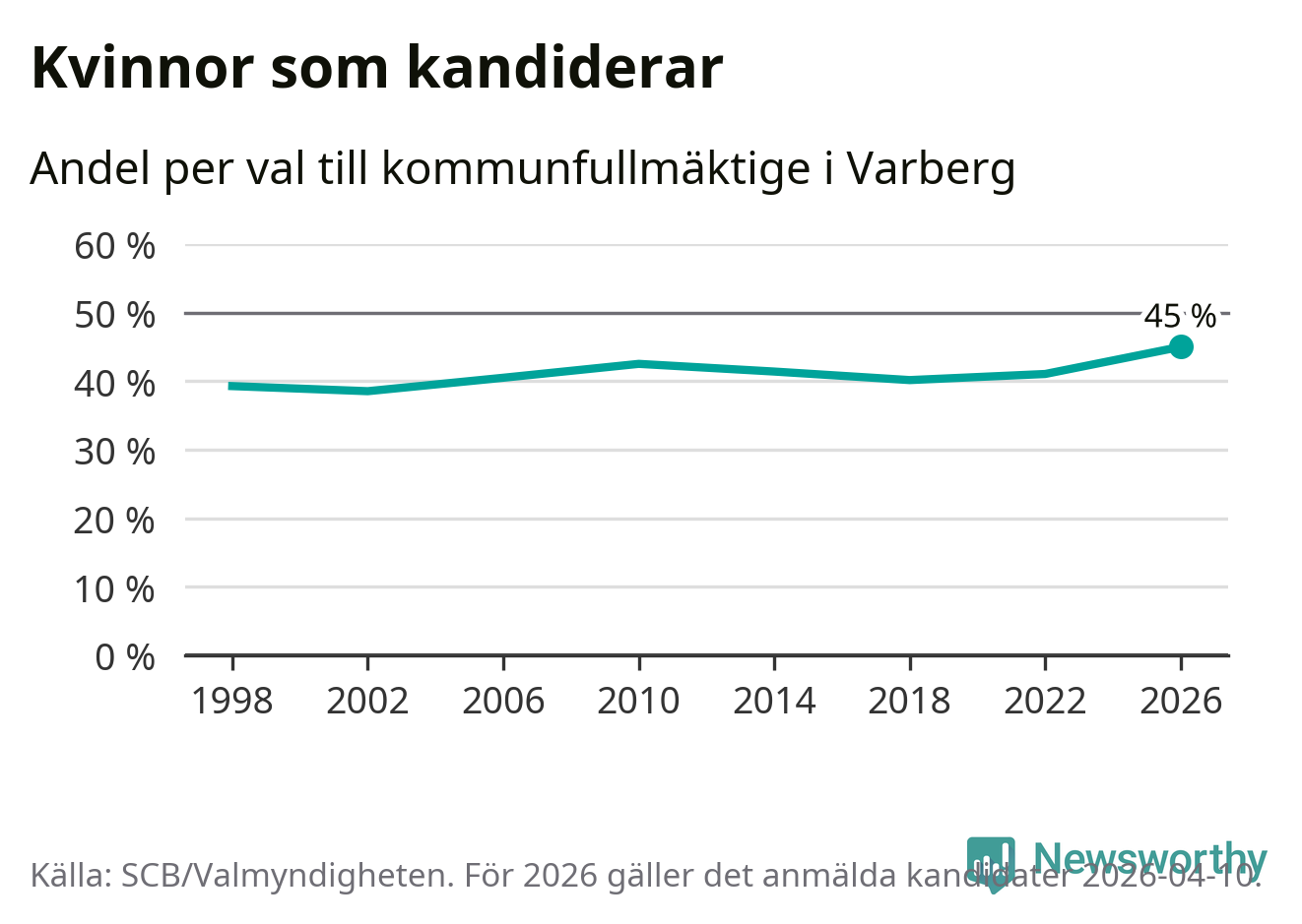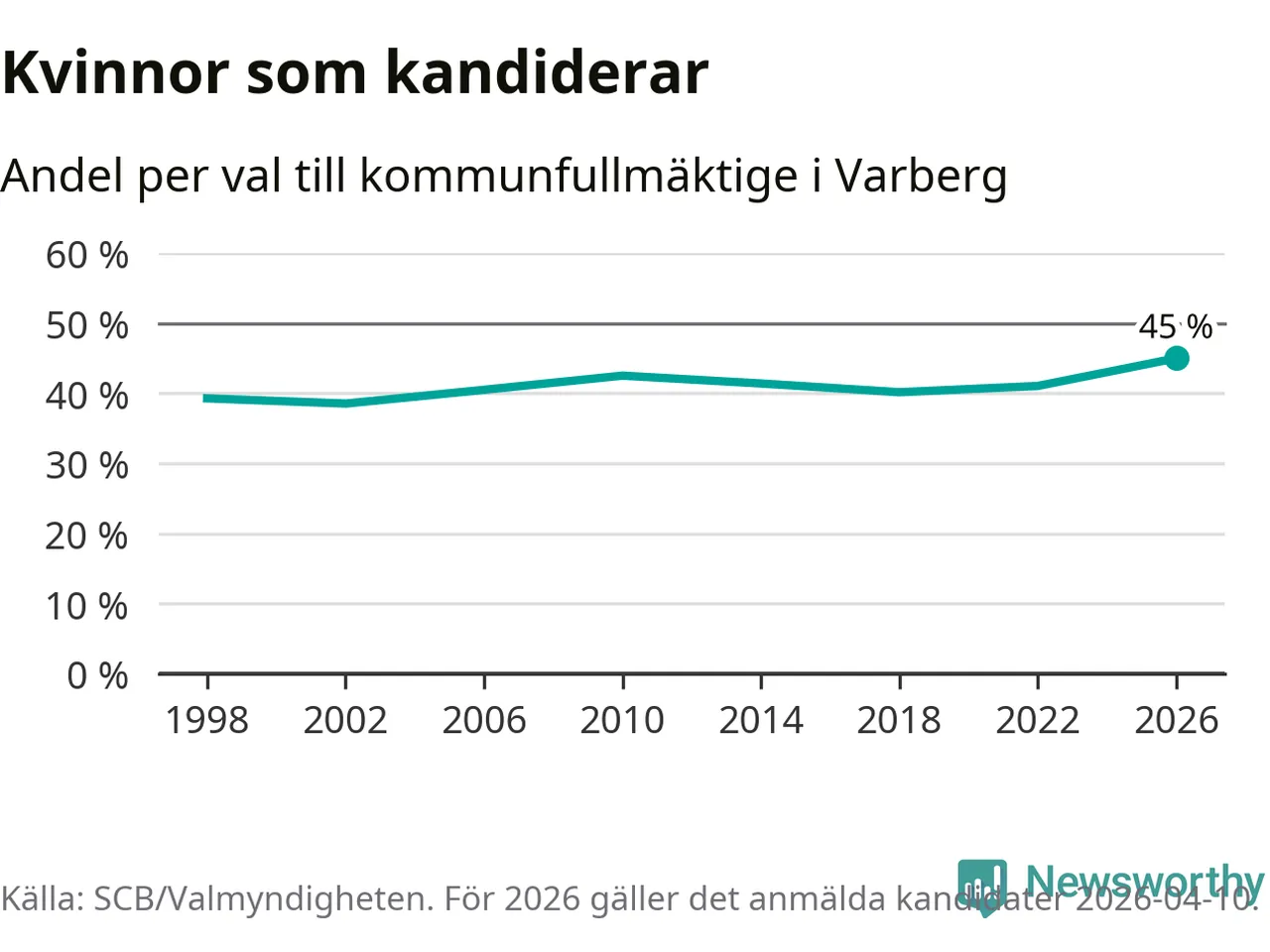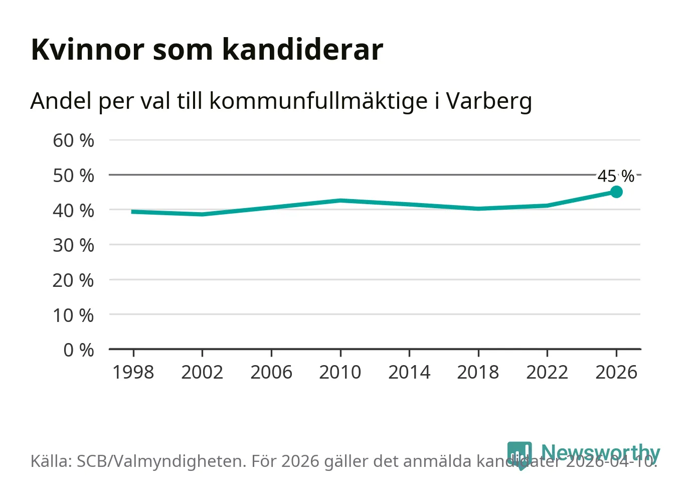 Kvinnorna utgör 45 procent av de hittills anmälda kandidaterna, vilket är den högsta andelen på listorna till kommunfullmäktige i Varberg sedan åtminstone valet 1998. Varberg är en av 264 kommuner i landet där männen utgör en majoritet av kandidaterna på listorna.