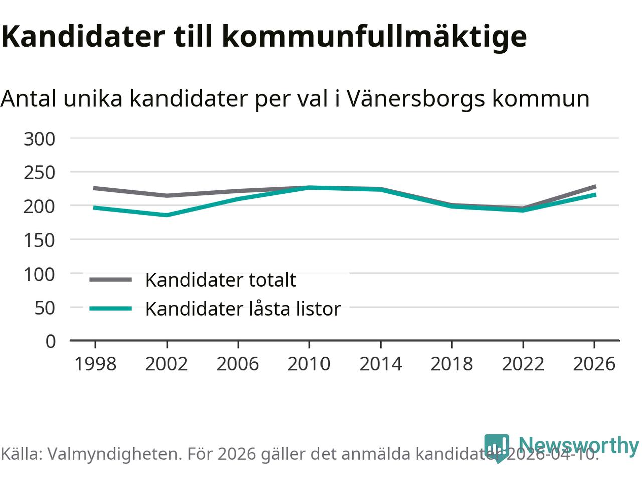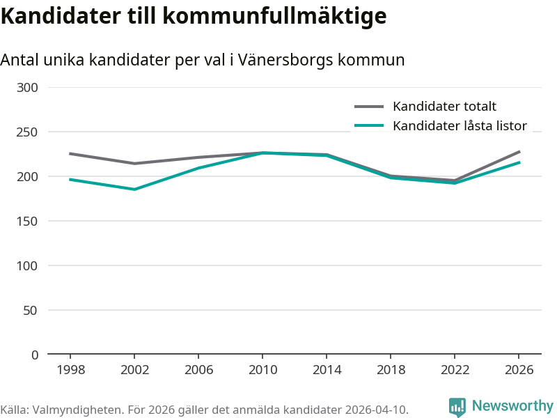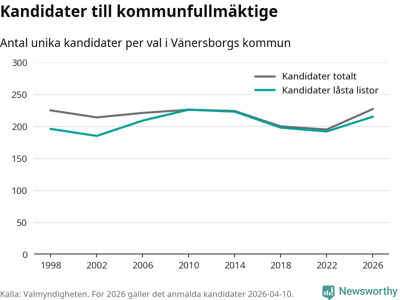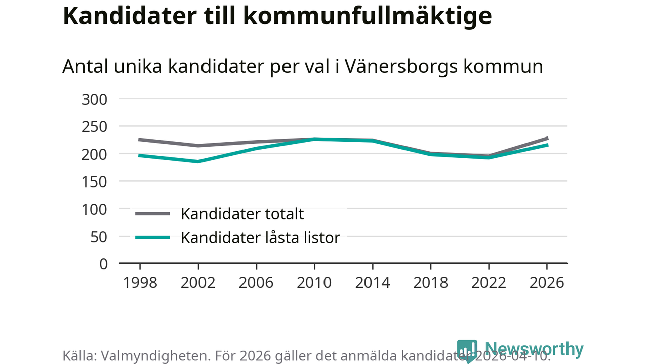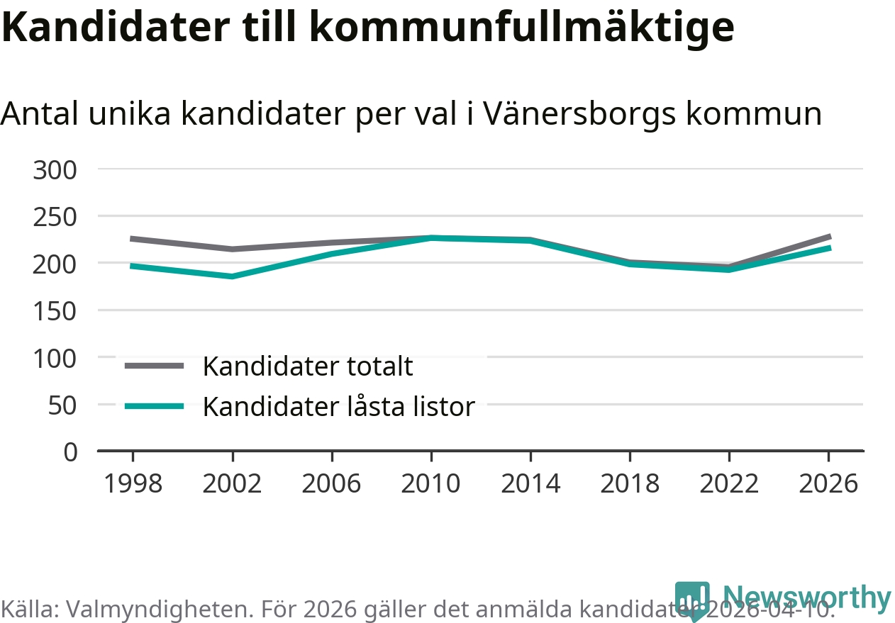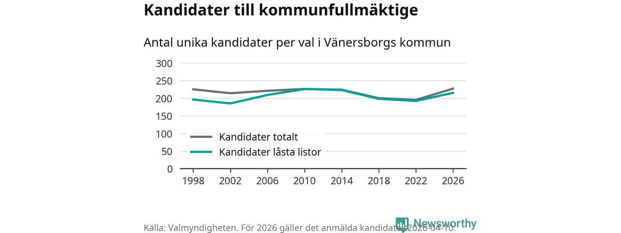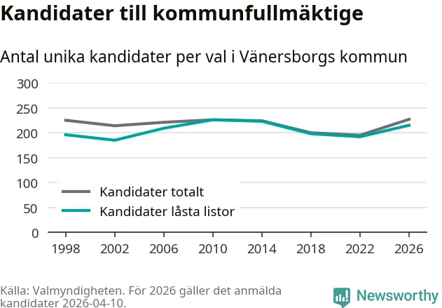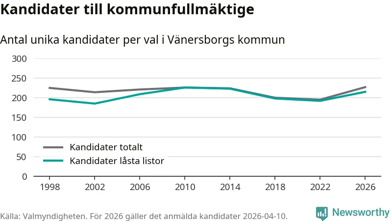 På torsdagen var det deadline för partier med låsta listor att registrera sina kandidater inför höstens val. Till valet till kommunfullmäktige i Vänersborg är 215 kandidater anmälda på sådana listor, vilket är 23 fler än i valet 2022.
