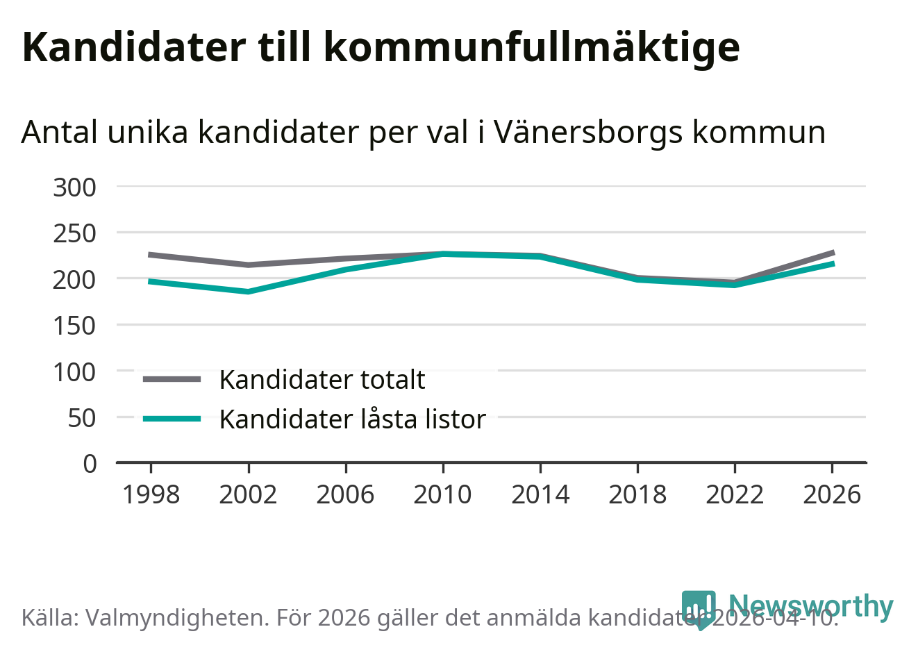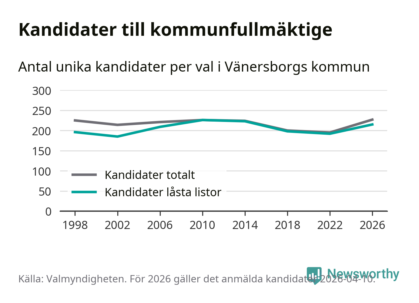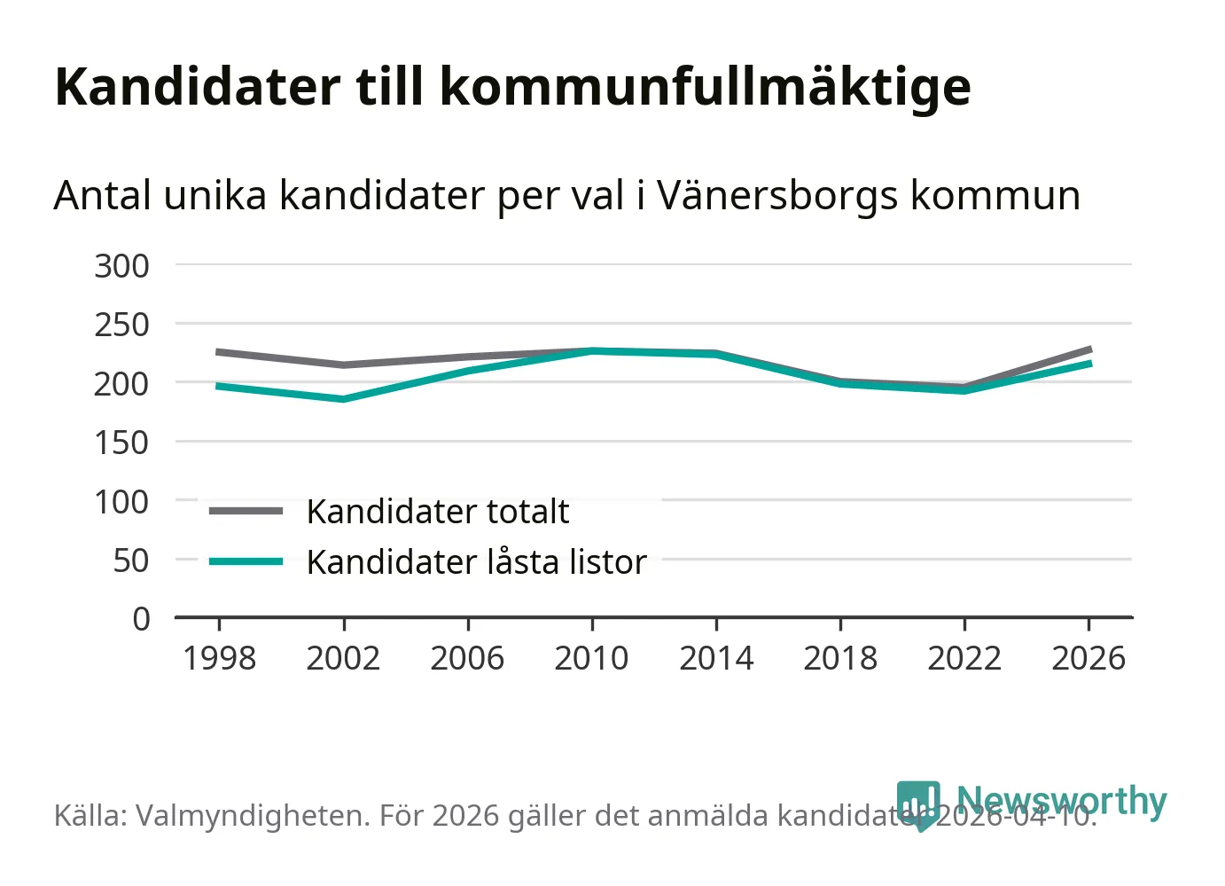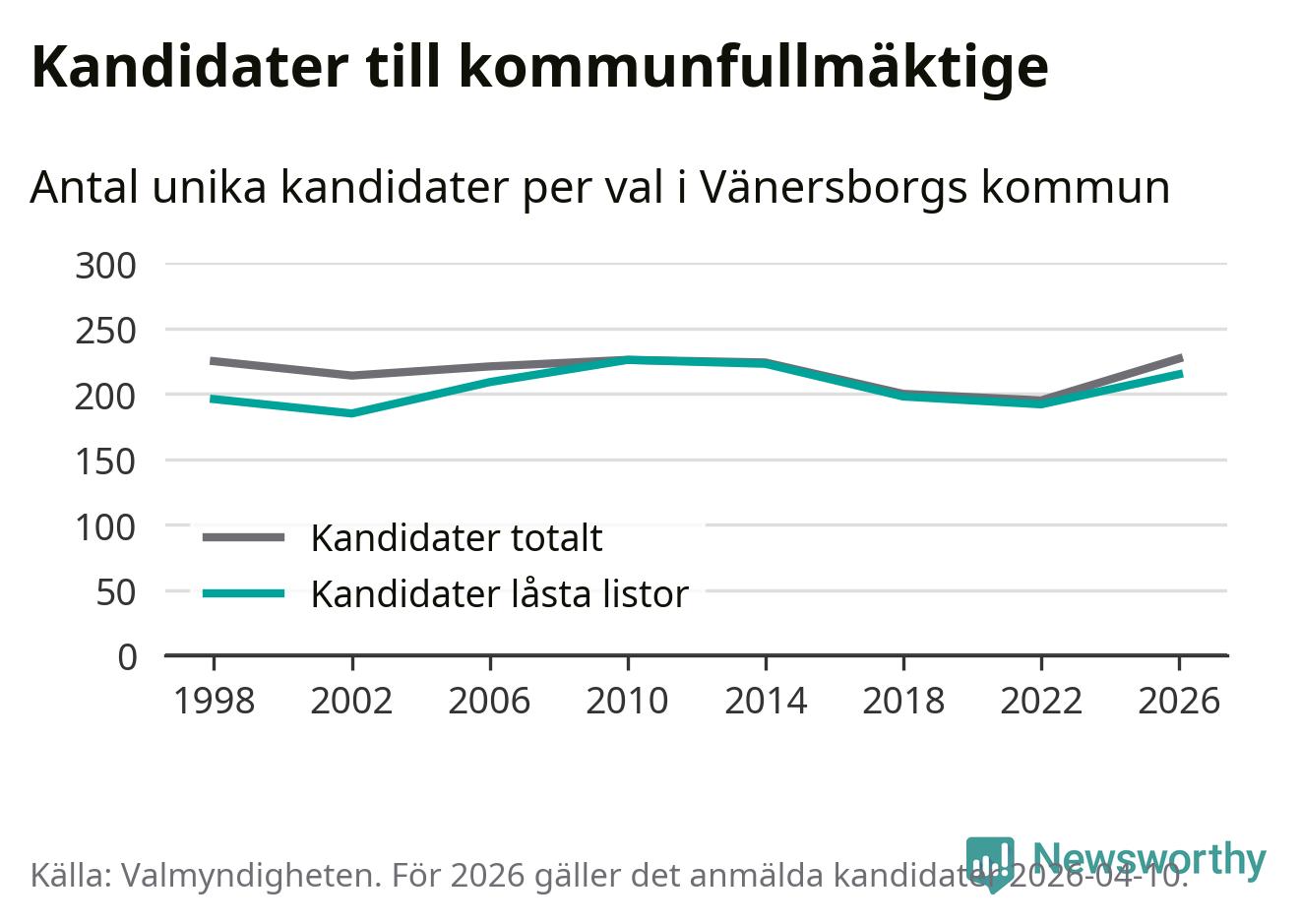 På torsdagen var det deadline för partier med låsta listor att registrera sina kandidater inför höstens val. Till valet till kommunfullmäktige i Vänersborg är 215 kandidater anmälda på sådana listor, vilket är 23 fler än i valet 2022.