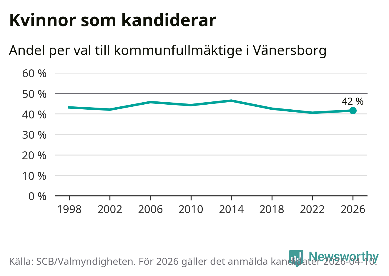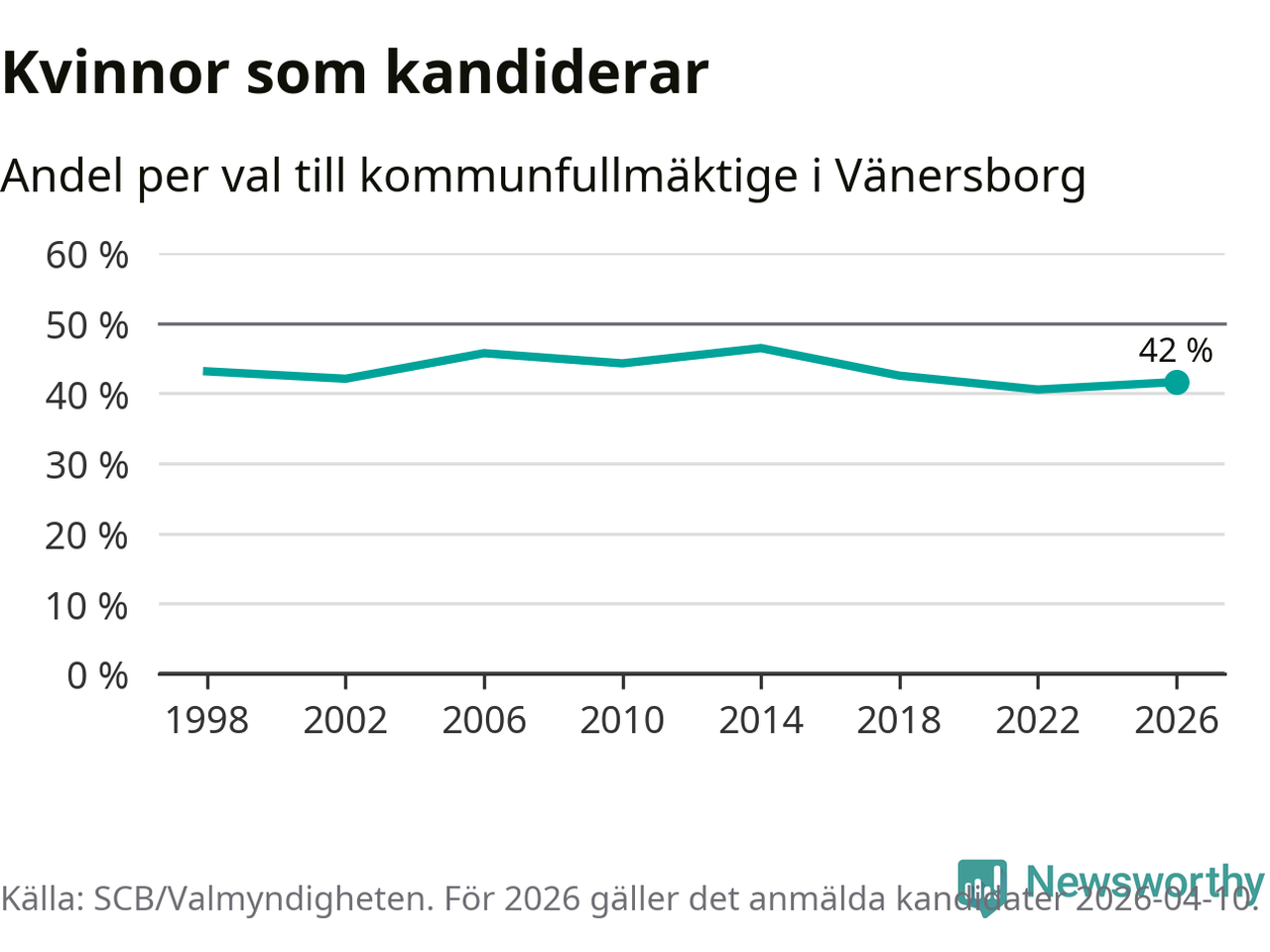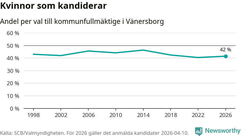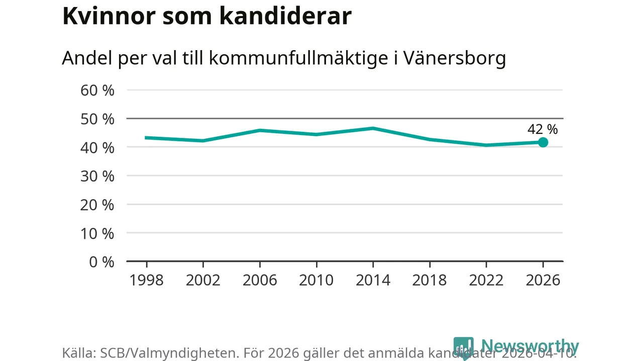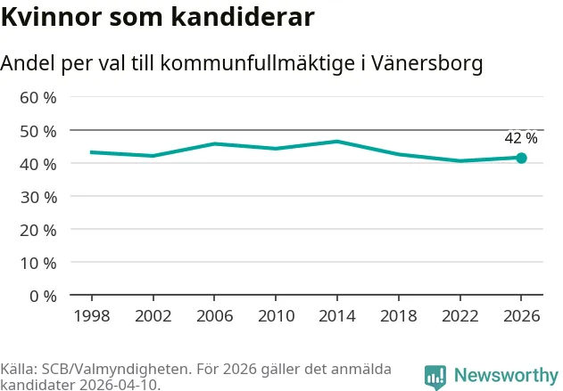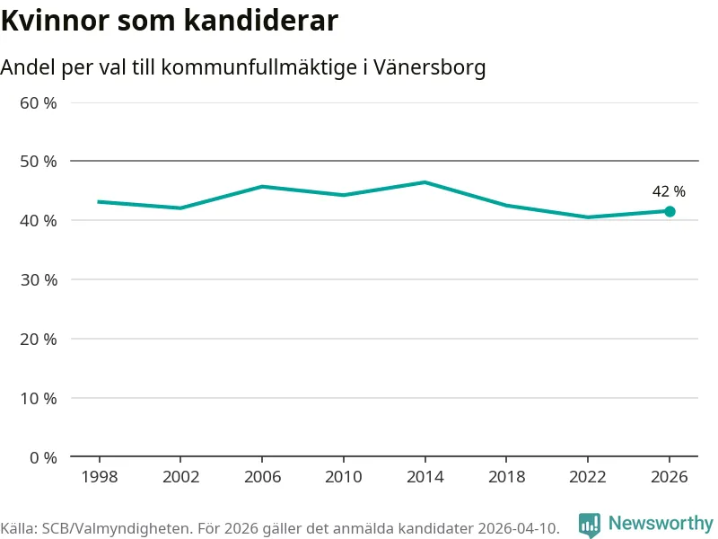 Kvinnorna utgör 42 procent av de hittills anmälda kandidaterna. Vid valet 2014 var 46 procent kvinnor, valet 2022 var motsvarande siffra 41 procent. Vänersborg är en av 264 kommuner i landet där männen utgör en majoritet av kandidaterna på listorna.