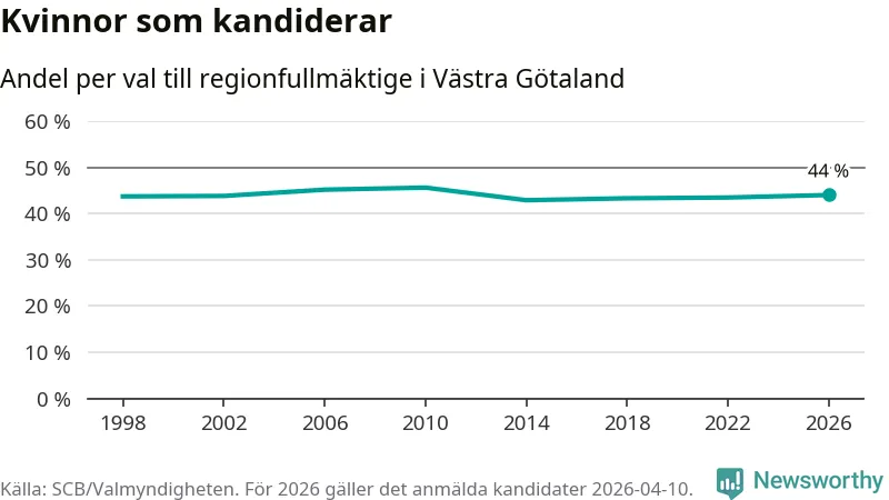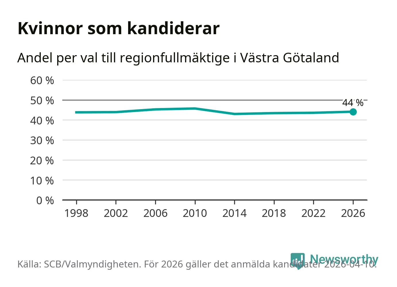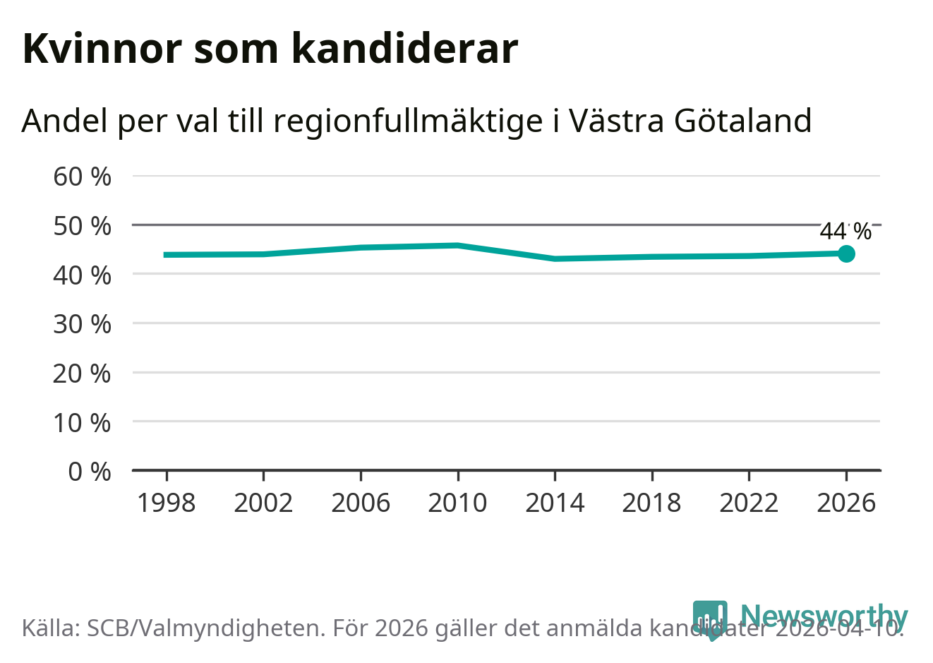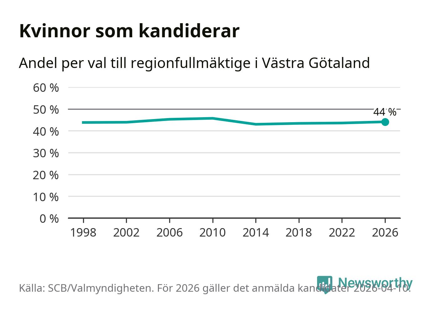 Kvinnorna utgör 44 procent av de hittills anmälda kandidaterna, vilket är den högsta andelen på listorna till regionfullmäktige i Västra Götalandsregionen sedan valet 2010. Andelen kvinnor har ökat i Västra Götalandsregionen under de senaste två valen och ökningen ser alltså ut att fortsätta i år. Västra Götaland är en av 20 regioner i landet där männen utgör en majoritet av kandidaterna på listorna.